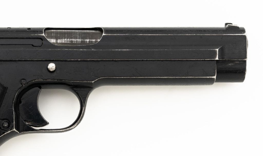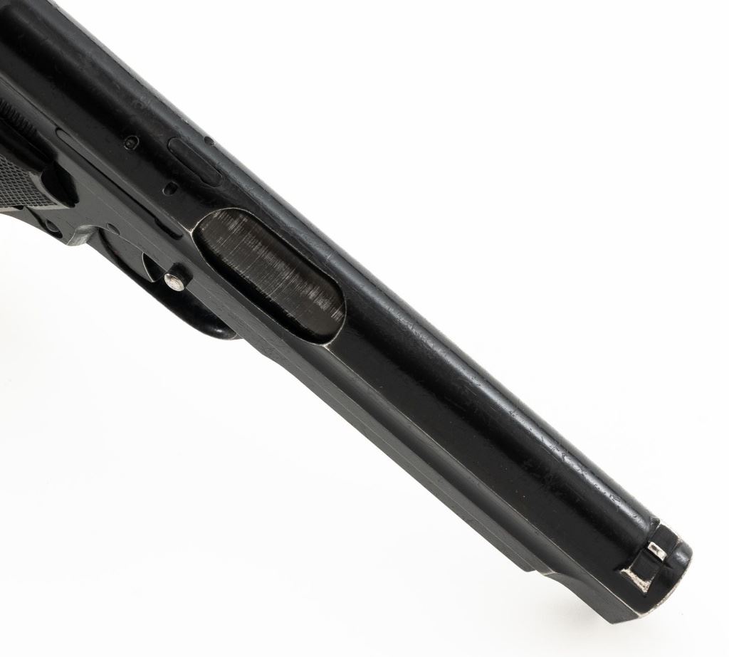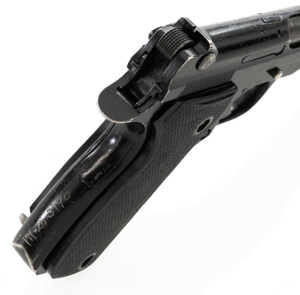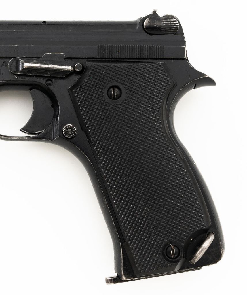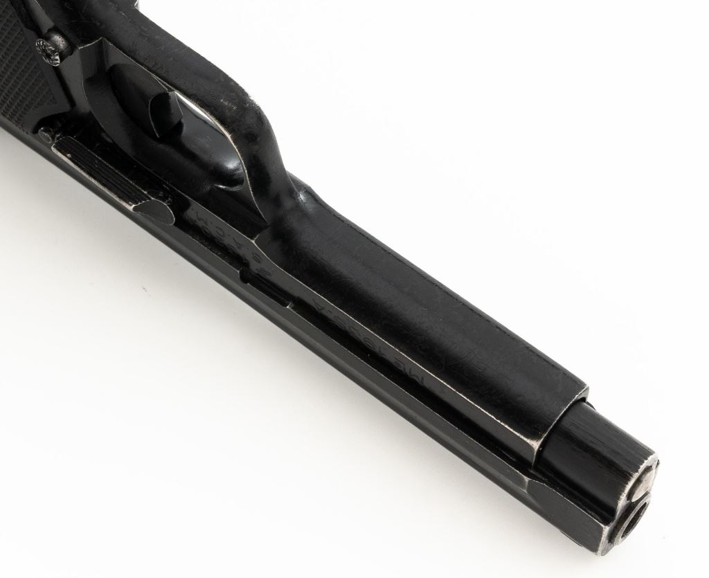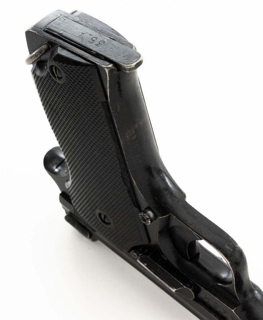 French S.A.C.M. Model 1935A Semi-Automatic Pistol, B81320A, 7.65 mm Long cal., 4.3" barrel, gray parkerized finish with an overlay of black enamel paint, checkered plastic two-piece grips, dovetailed blade front sight, fixed square-notch rear sight, lanyard loop, with one 8-round magazine. Magazine base is marked "35". No visible import mark. Pistol is in near fine overall condition, retaining approx. 90%-92% of the black enamel finish, with holster wear, scratches, and scrapes along the frame and slide. A previous owner has etched their social security # down the backstrap. Grips with sharp checkering and scattered light handling marks. Action functions well. Bore is very good with light frosting and well-defined rifling. Manufactured from 1935-1945, the model 1935A was used by French troops in WWII and later in Indochina from 1945-1954. Est.: $250-$400. (C&R/PPT)
