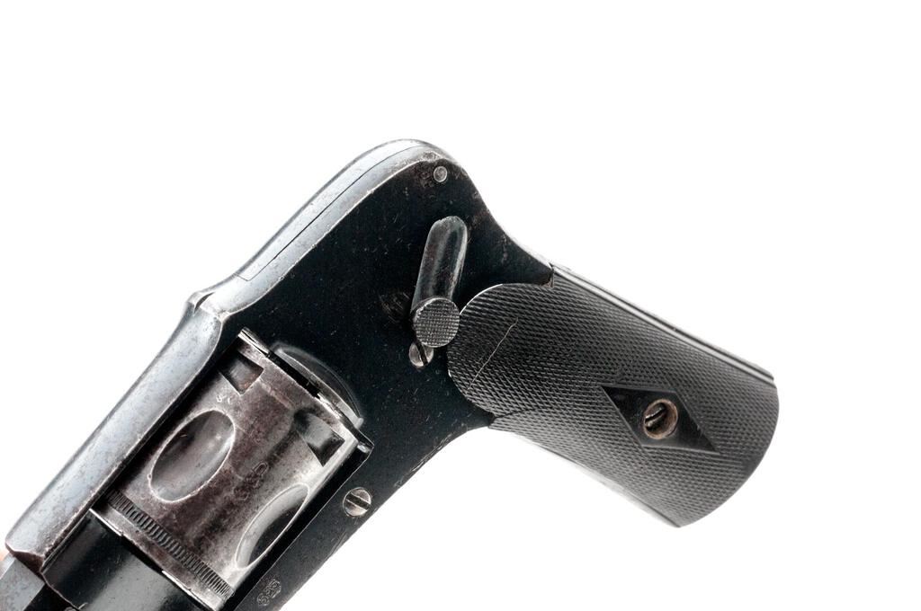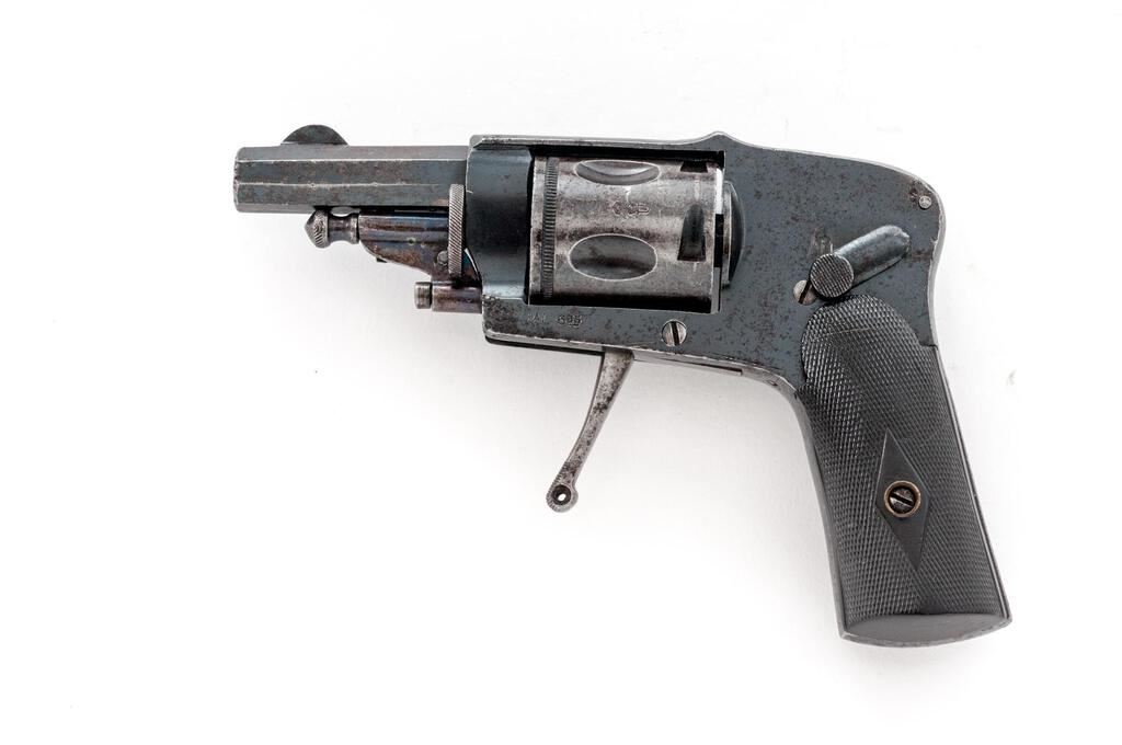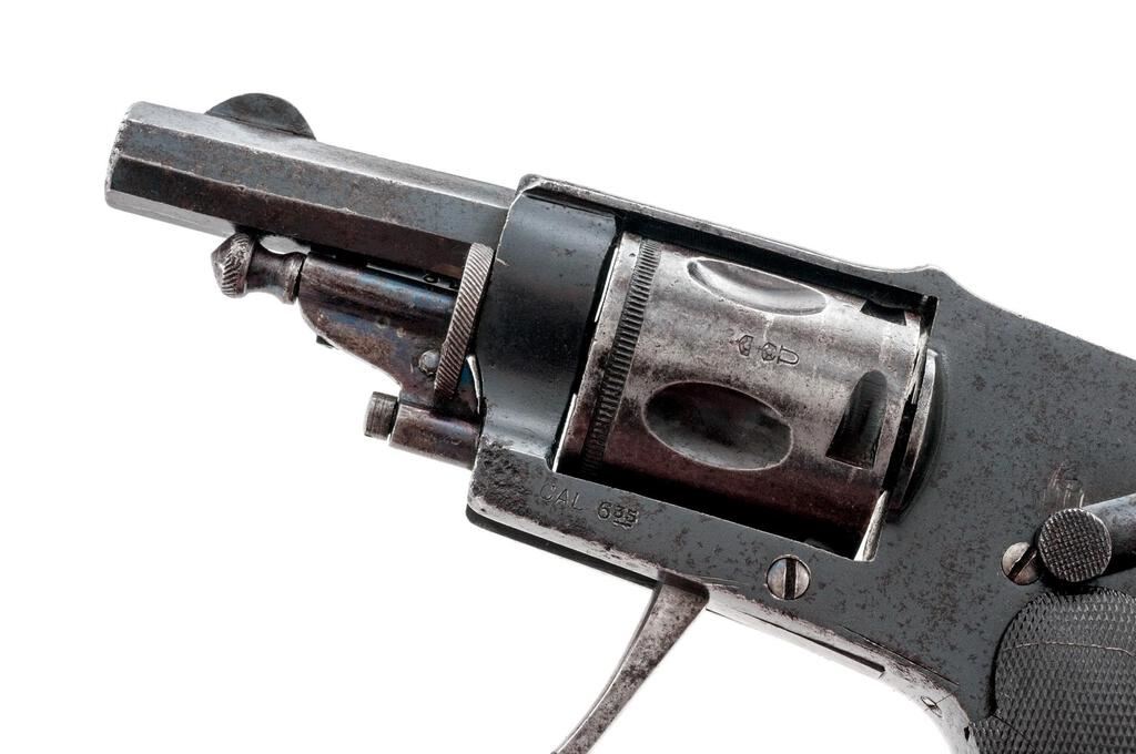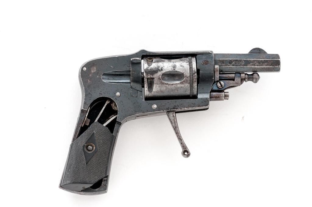 French Velo Dog Double Action Revolver, #10, 6.35mm, 5-shot, blued finish, 1.9" octagon barrel, fixed blade front sight and internal groove rear sight, folding trigger, side lever safety, European proof marks, and finely checkered hard rubber grips. Condition is good retaining approx. 70% original blued finish, with wear and thinning to the finish on the cylinder, high edgewear on the barrel and frame, mottling to the finish on the barrel, freckling and light pitting on the frame side edges, bottom, and grip straps. Action and safety function properly, bore is pitted with strong lands and grooves. Right grip is broken and missing about half the grip on top, with a piece missing at the bottom; left grip is very good showing only minor wear and age. Est.: $150-$250. (C&R/PPT)