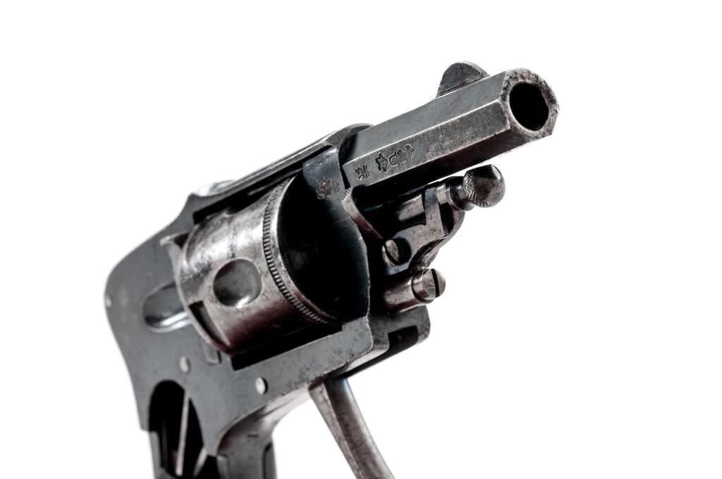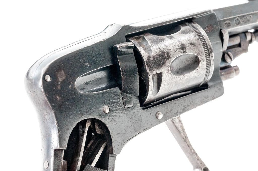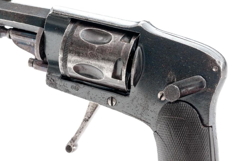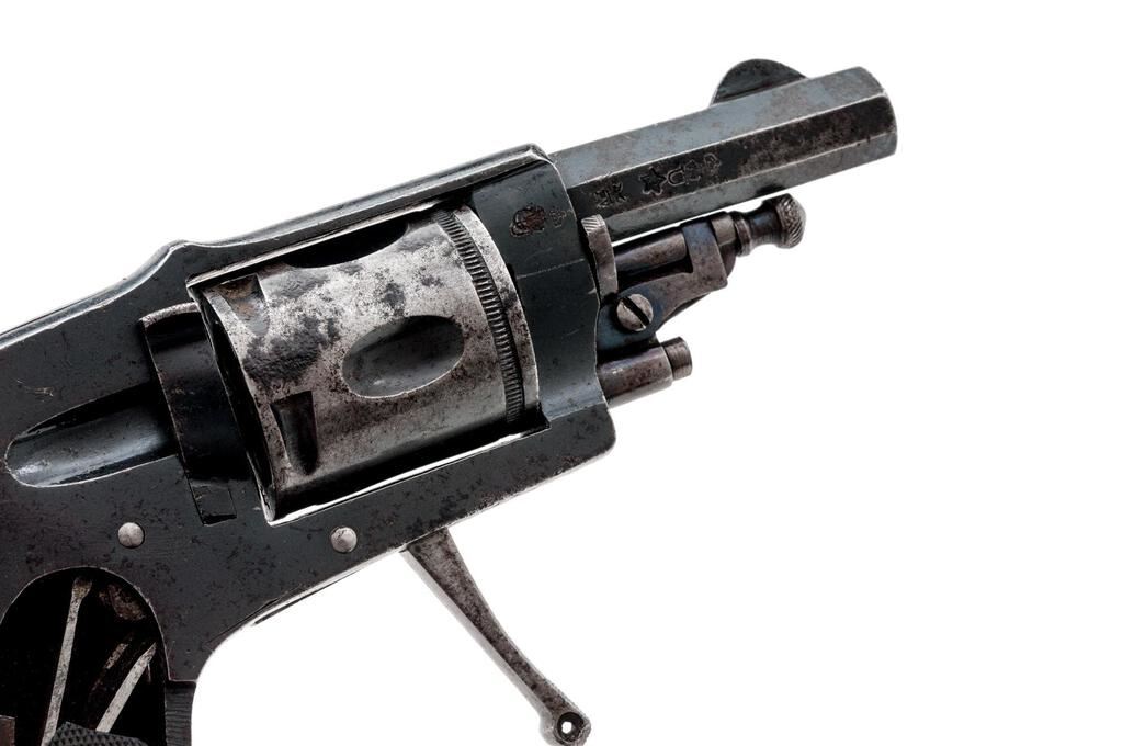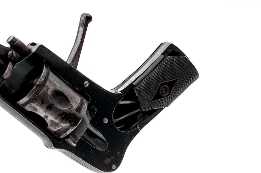 French Velo Dog Double Action Revolver, #10, 6.35mm, 5-shot, blued finish, 1.9" octagon barrel, fixed blade front sight and internal groove rear sight, folding trigger, side lever safety, European proof marks, and finely checkered hard rubber grips. Condition is good retaining approx. 70% original blued finish, with wear and thinning to the finish on the cylinder, high edgewear on the barrel and frame, mottling to the finish on the barrel, freckling and light pitting on the frame side edges, bottom, and grip straps. Action and safety function properly, bore is pitted with strong lands and grooves. Right grip is broken and missing about half the grip on top, with a piece missing at the bottom; left grip is very good showing only minor wear and age. Est.: $150-$250. (C&R/PPT)