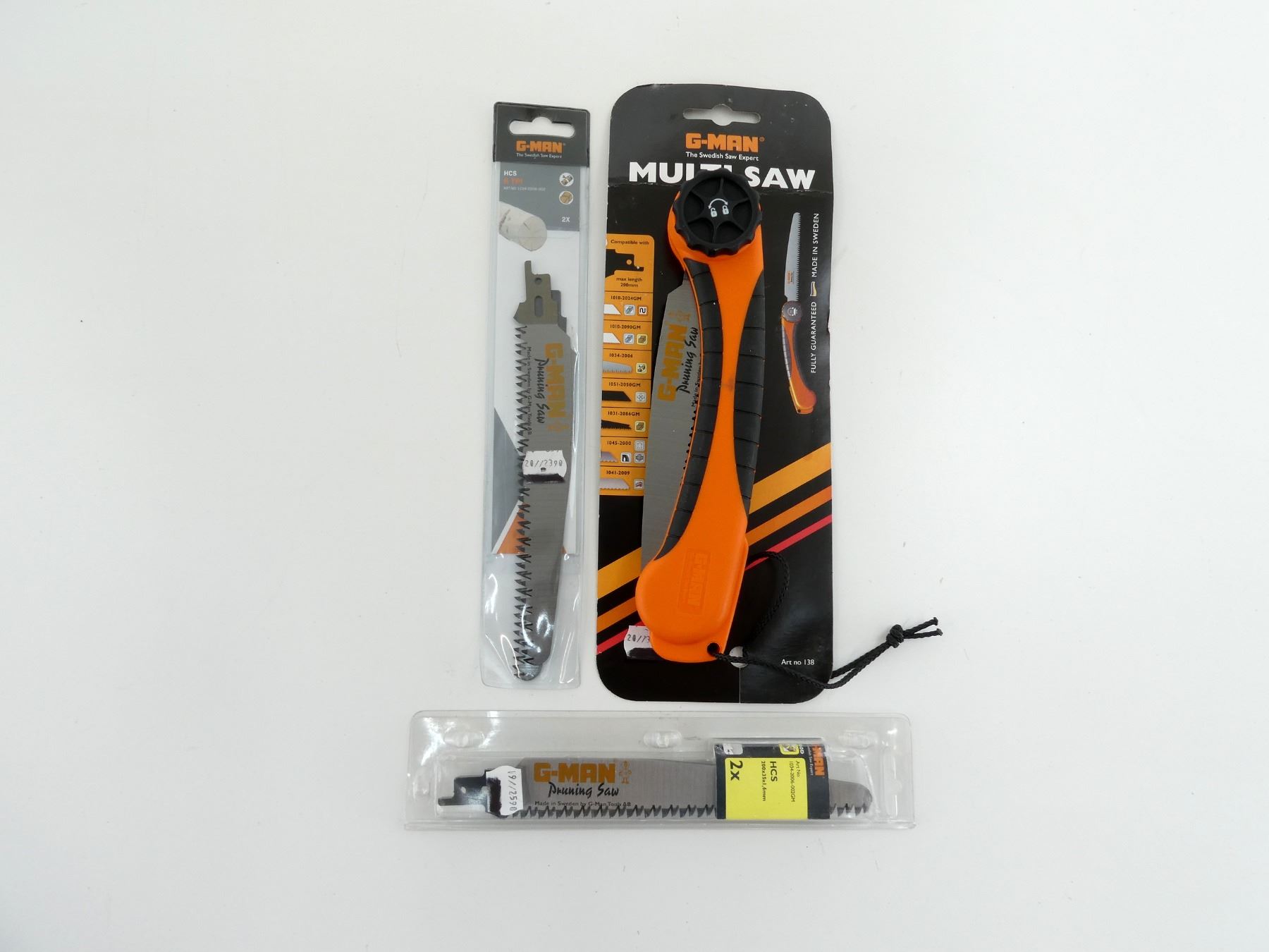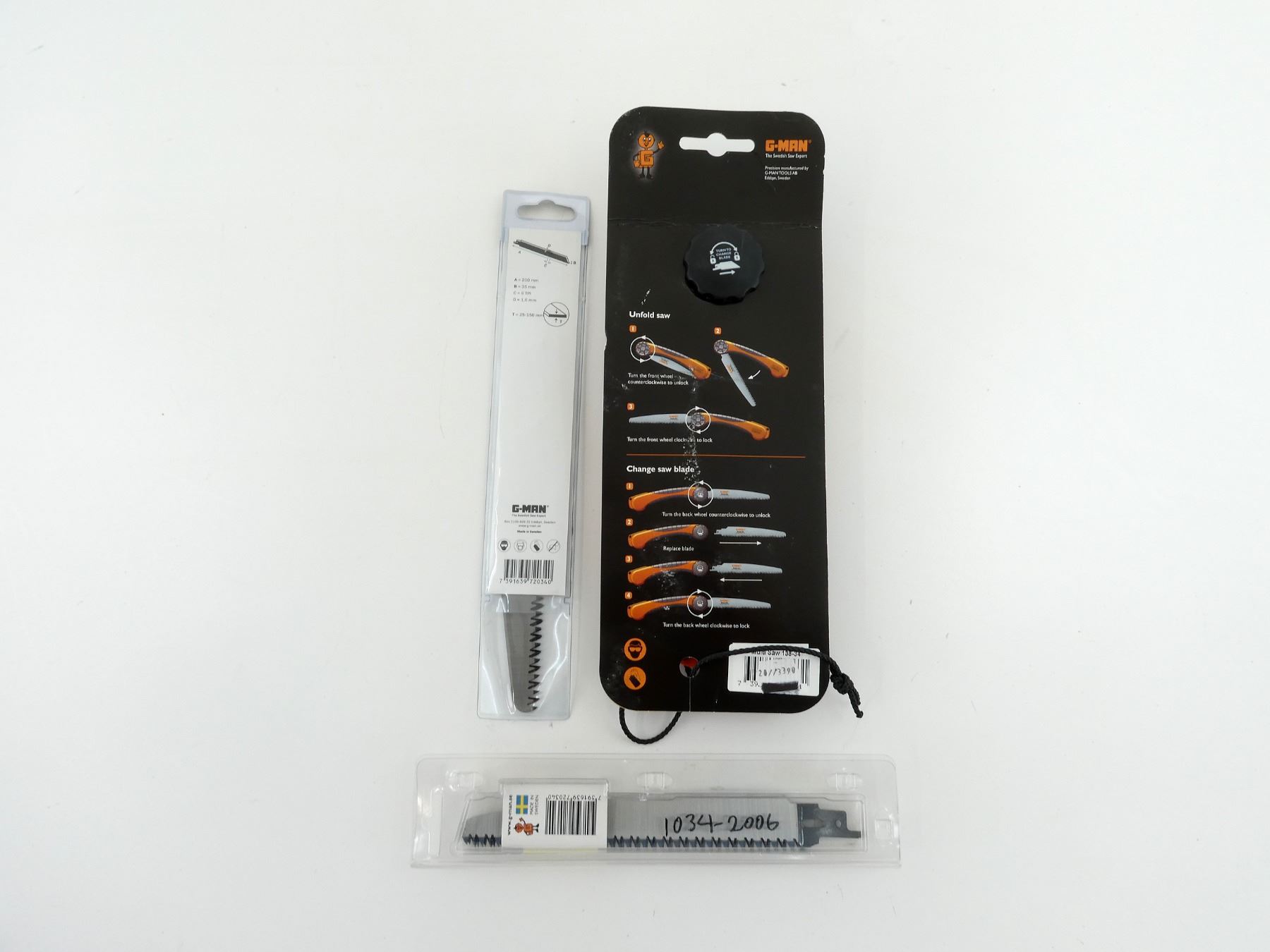 LOT INCLUDES; (1) G-MAN MULTI SAW, PRUNING SAW, ITEM #: 138-34, COMPATIBLE WITH VARIOUS BLADES, NEW OLD STOCK, SEALED IN ORIGINAL PACKAGING & (2) PRUNING SAW BLADES, 2 PACK, ITEM #: 1034-2006-002 & 1034-2006-002GM, NEW OLD STOCK, IN ORIGINAL PACKAGING. SEE PHOTOS.