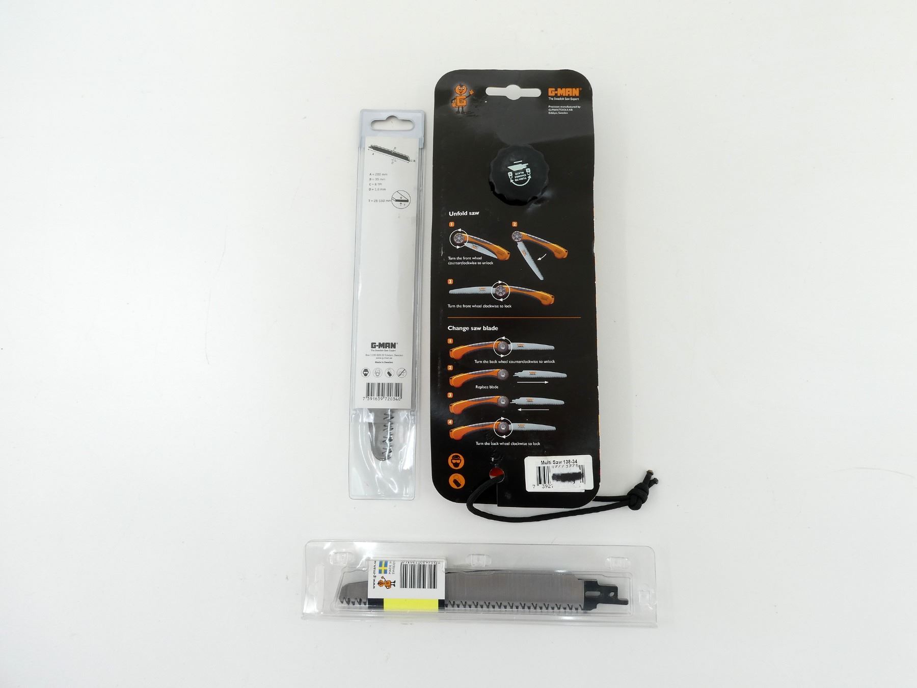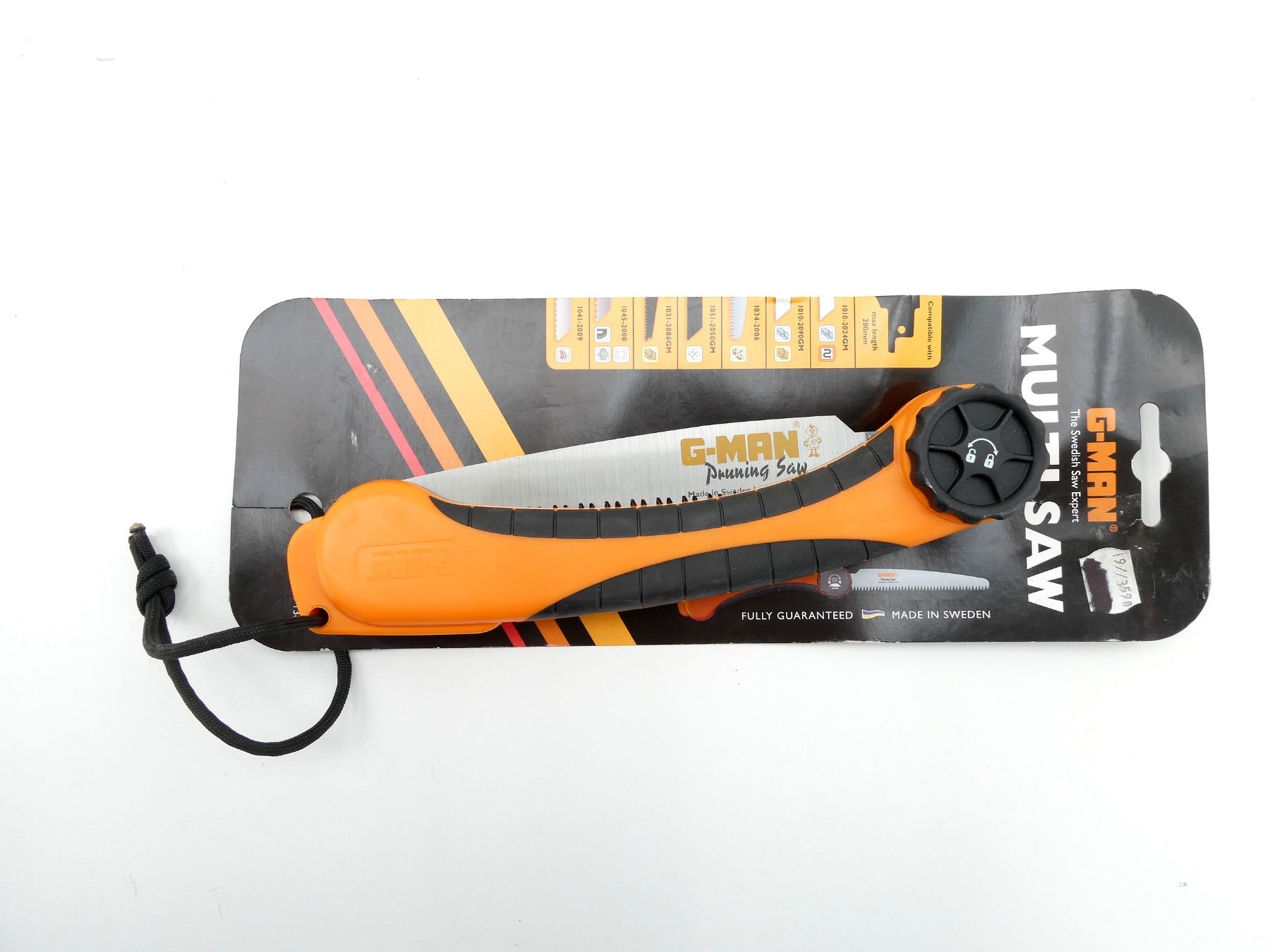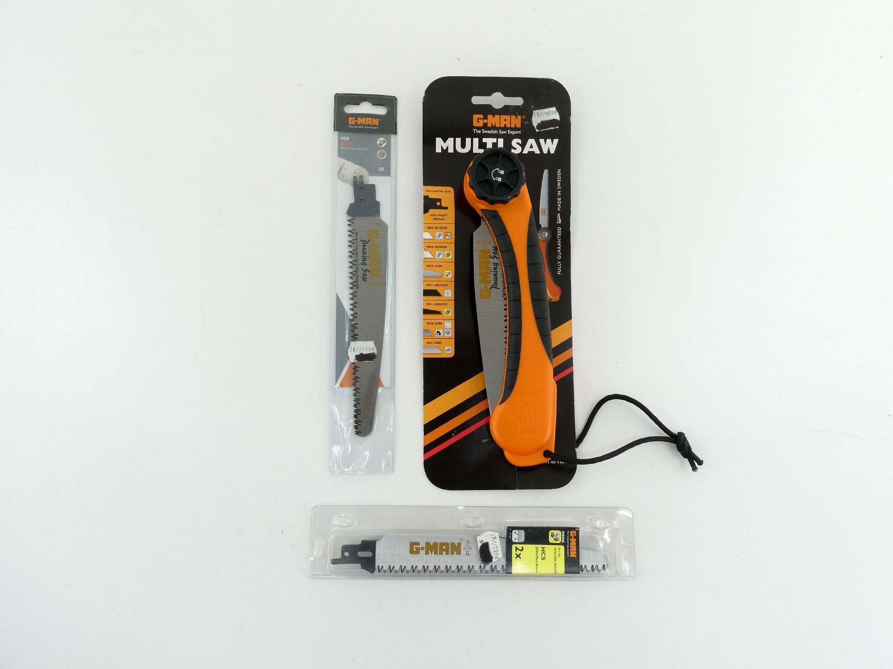 LOT INCLUDES; (1) G-MAN MULTI SAW, PRUNING SAW, ITEM #: 138-34, COMPATIBLE WITH VARIOUS BLADES, NEW OLD STOCK, SEALED IN ORIGINAL PACKAGING & (2) PRUNING SAW BLADES, 2 PACK, ITEM #: 1034-2006-002 & 1034-2006-002GM, NEW OLD STOCK, IN ORIGINAL PACKAGING. SEE PHOTOS.