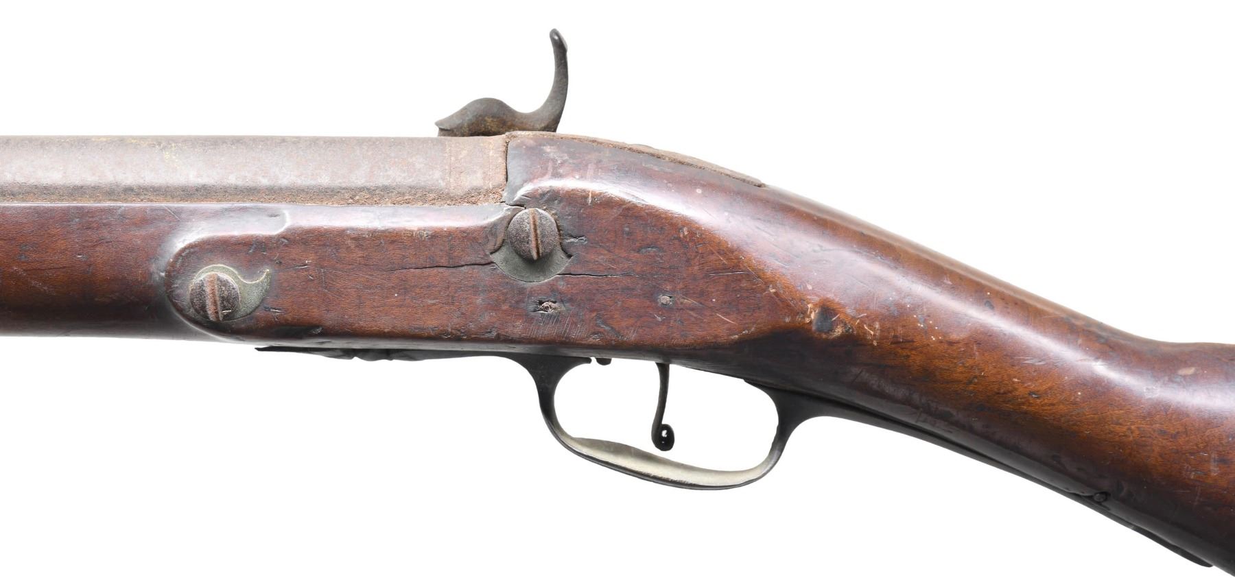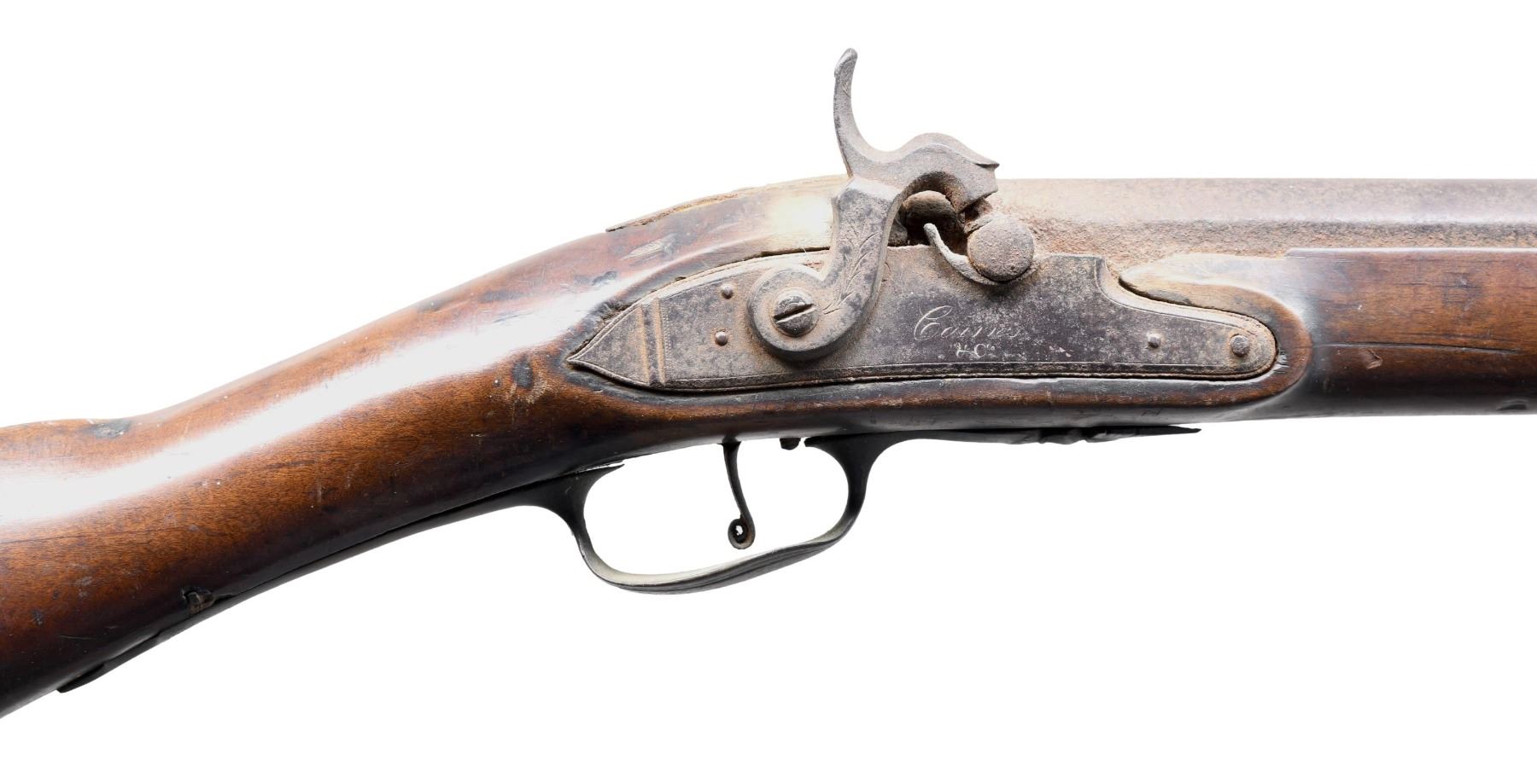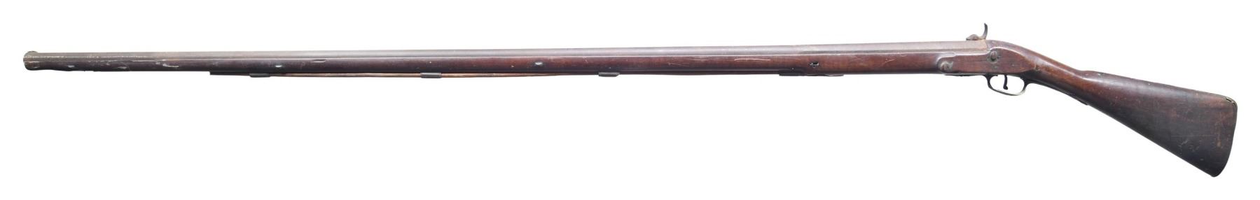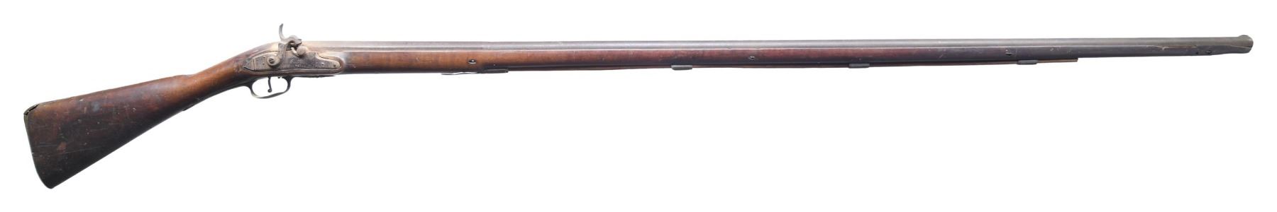 Cal. 72 (12 Ga.). NSN. Rnd. 57" barrel. Blade front sight. Lock marked "GAINES / VC". Wedge fastened walnut stock with spear tip finial triggerguard & musket style buttplate. Hardwood ramrod; appears ill suited to fowler as the length is approx. 12" short. CONDITION: metal has dark patina mixed with oxidation throughout; heavier oxidation & pitting around bolster & lock. Sprays of white paint on forward portions of barrel & forearm. Worn stock finish with scattered large cracks, numerous marks & gouges along with one missing ramrod piece & pieces of wood missing. Dark pitted bore. Lock appears to function when cycled by hand. (01-26981/MD). ANTIQUE. $500-800.