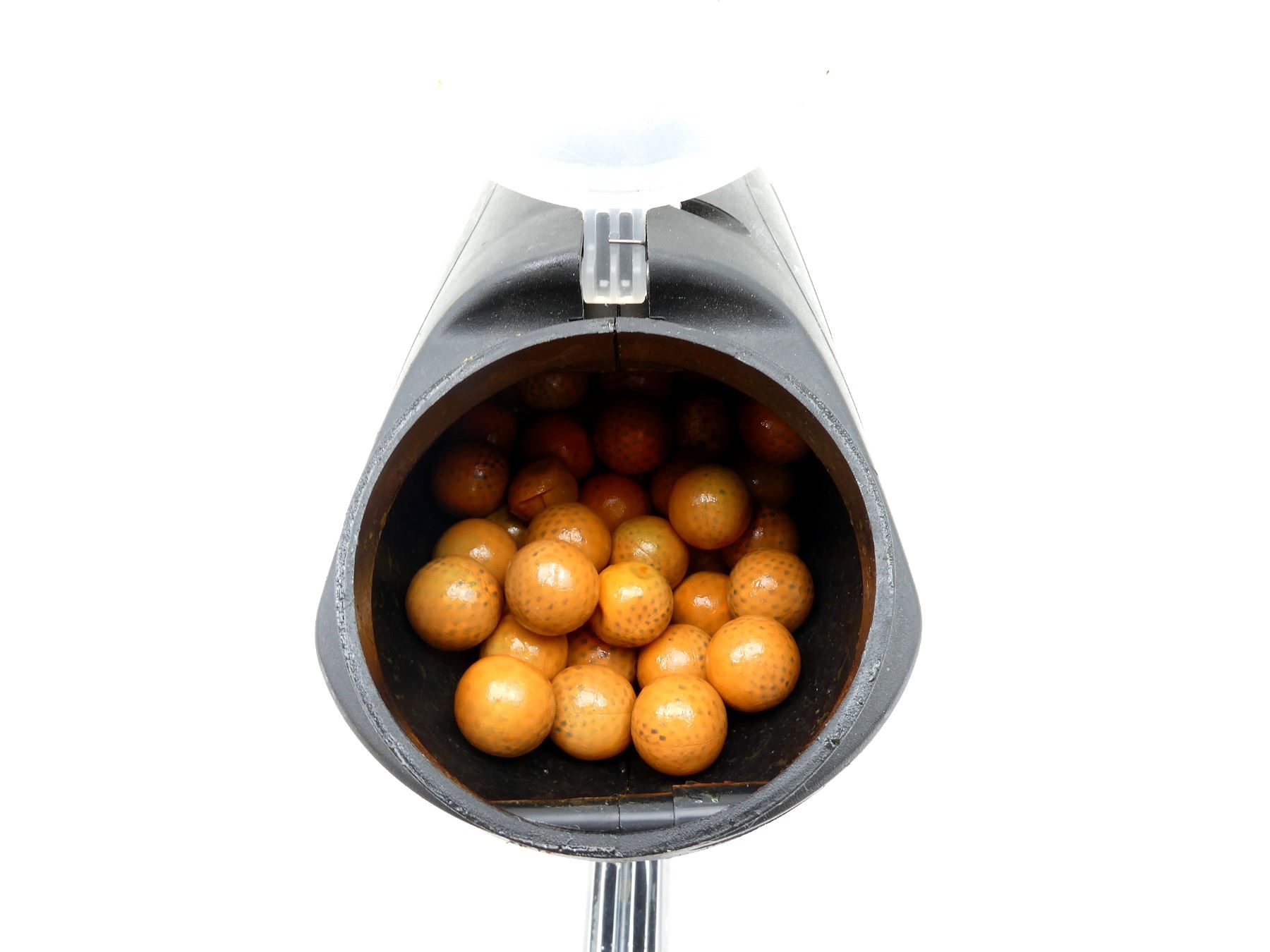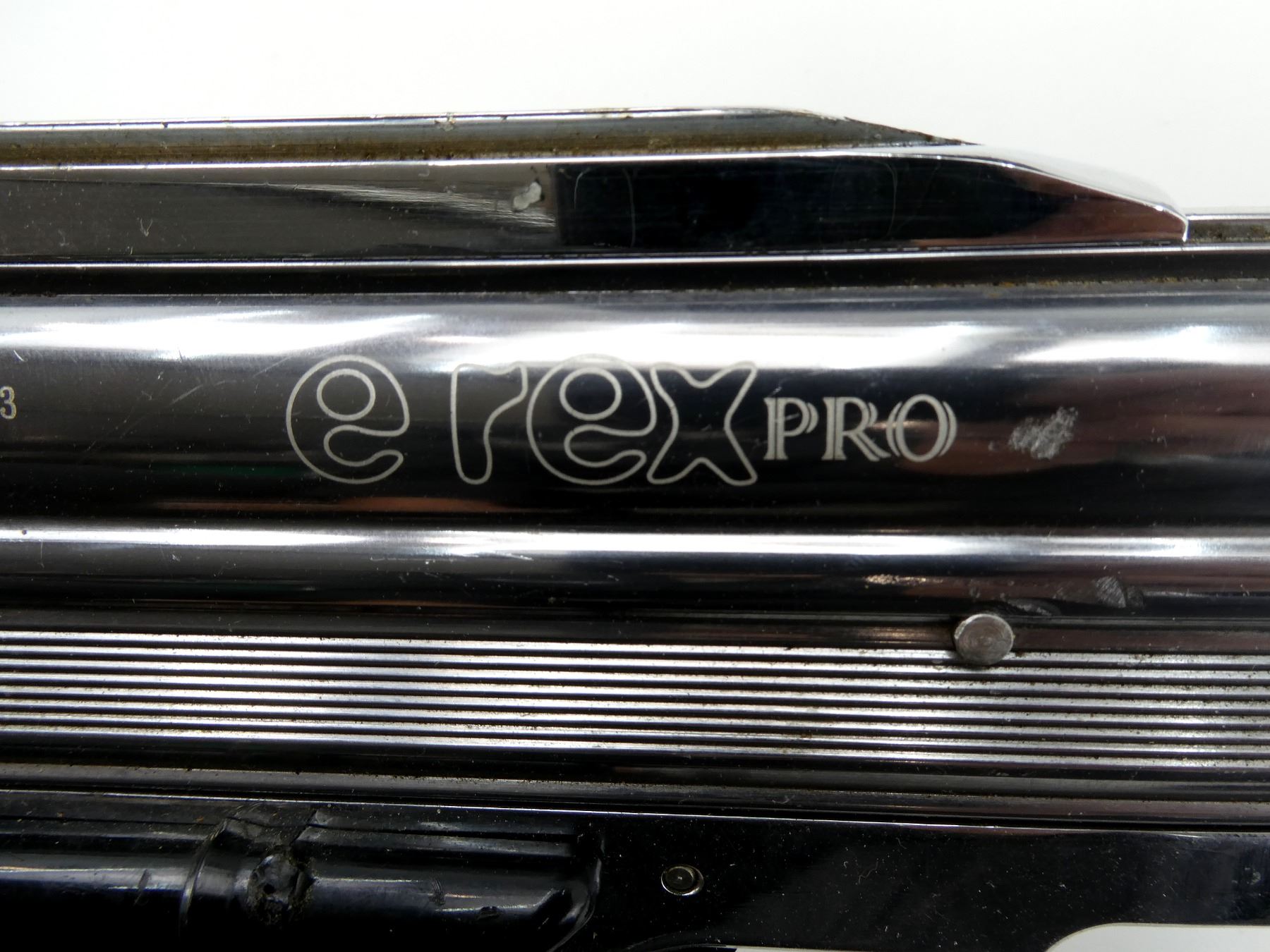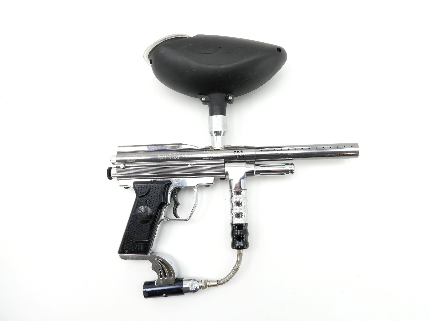 LOT INCLUDES; (1) E REX PRO PAINTBALL GUN, METAL & POLYMER CONSTRUCTION, MARKED "E REX PRO", ETC., UNTESTED, (1) JT REVOLUTION BLACK HOPPER & (89) ORANGE SPOTTED PAINTBALLS. SEE PHOTOS.