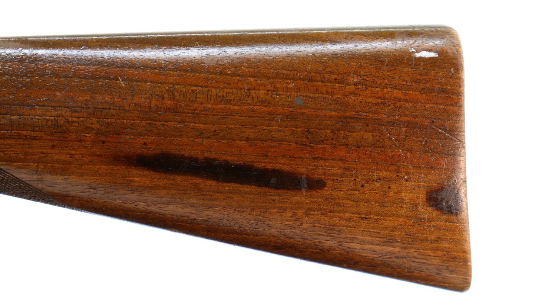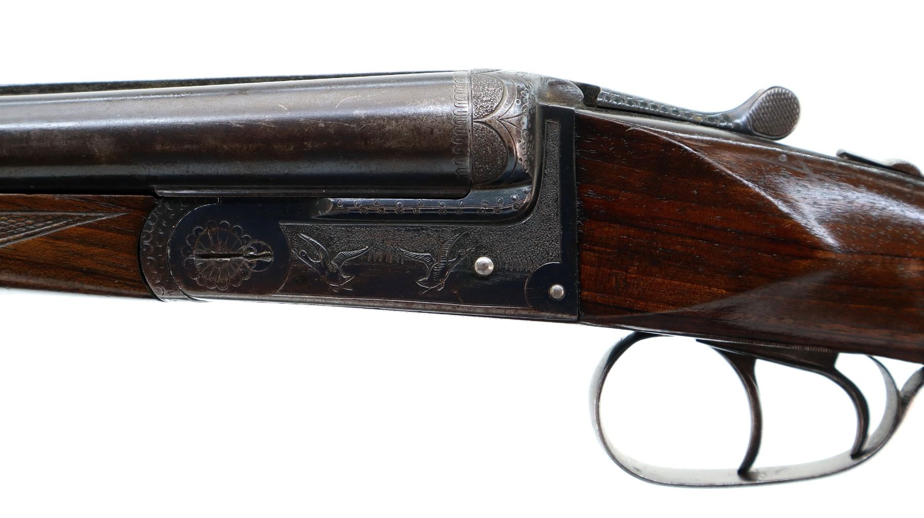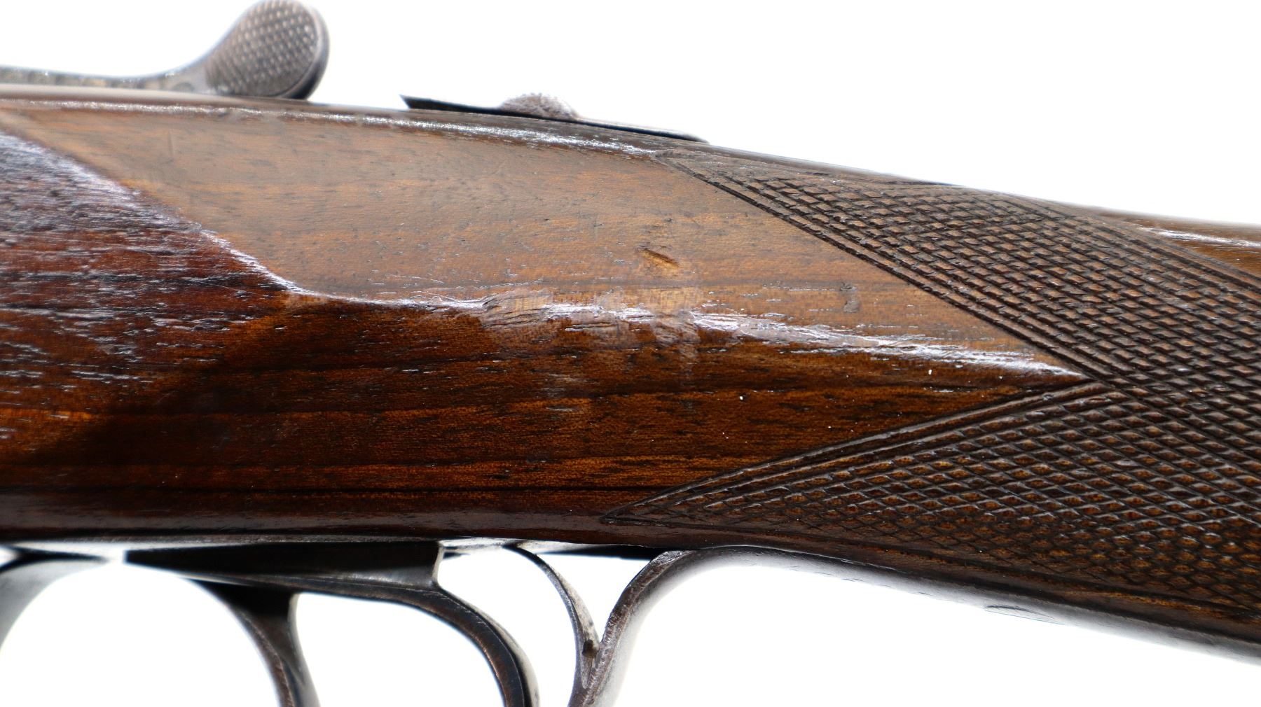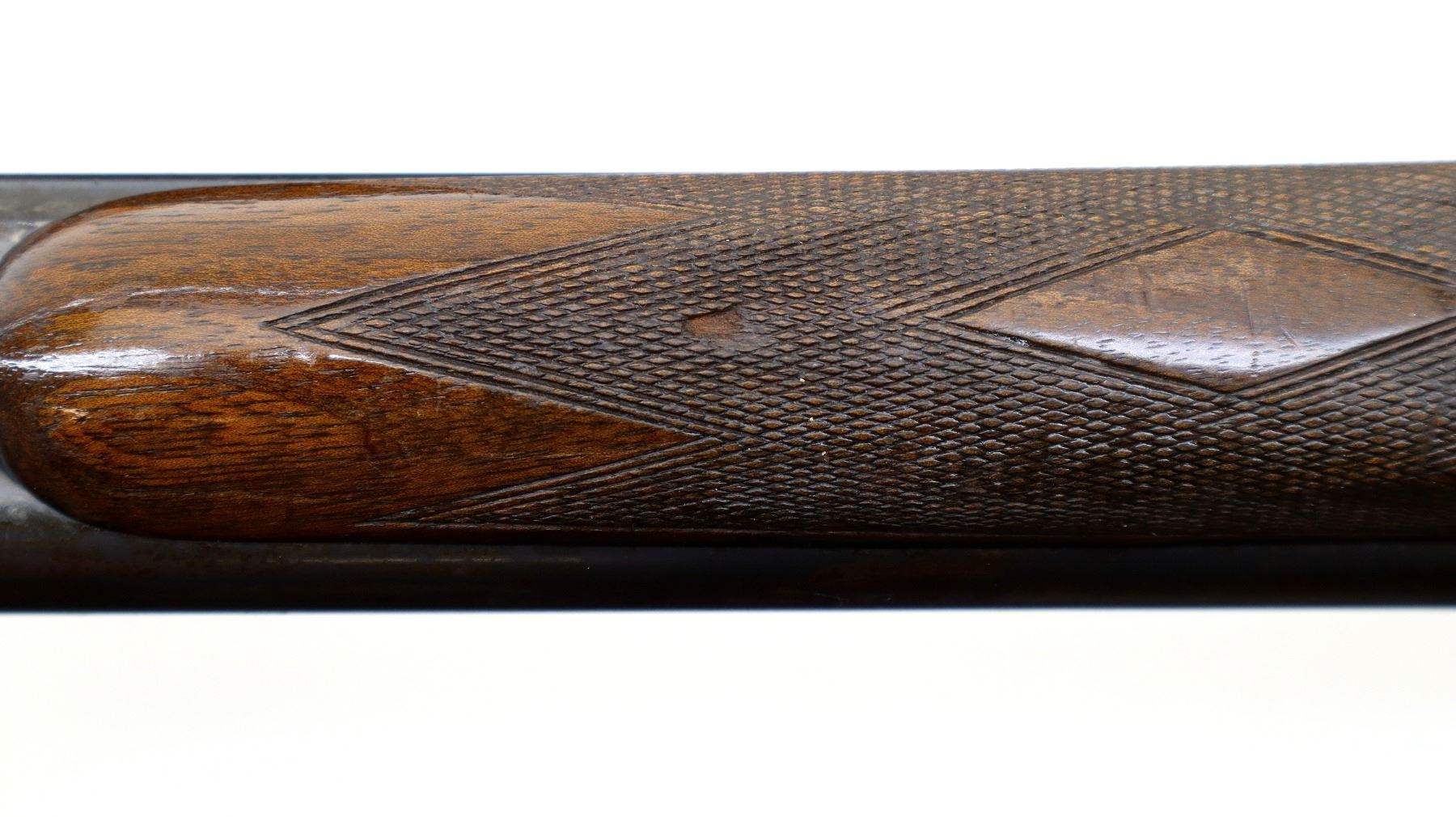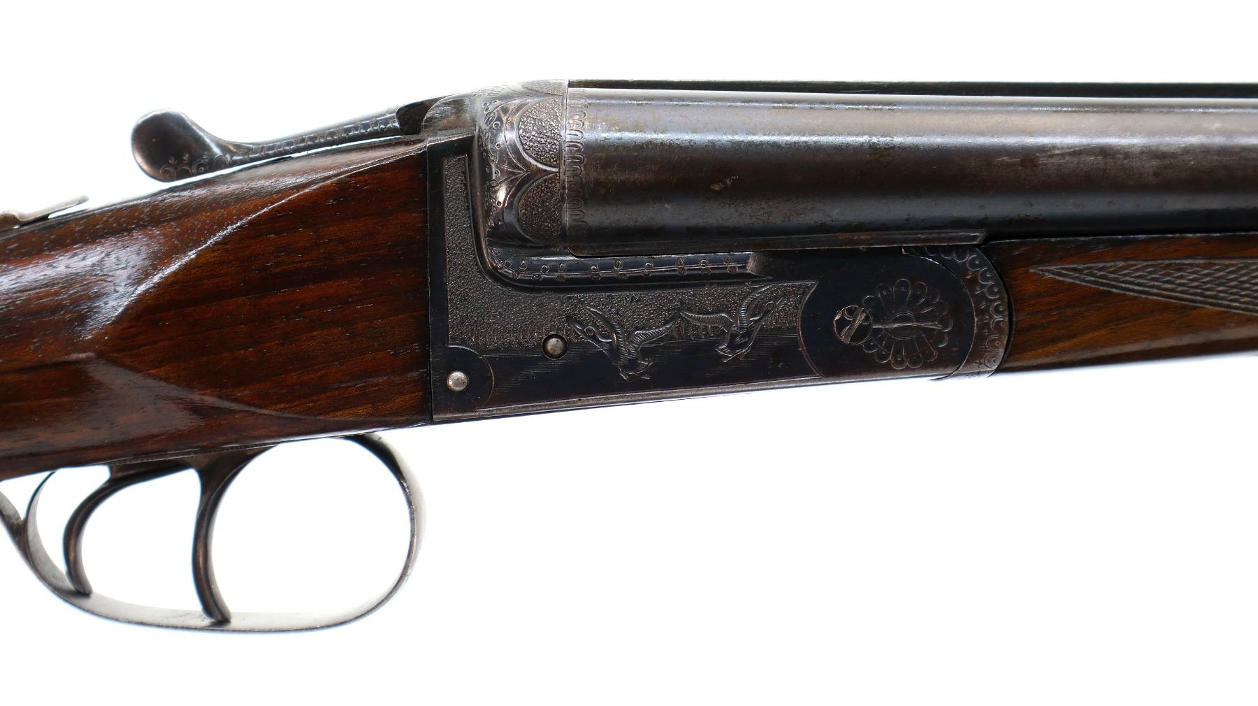 Main Description: Brass bead, blued finish, raised rib, engraved receiver, automatic safety, extractor, double triggers. Two piece wood stocks, checkered forearm and straight grip cracked on right side, grooved wood butt.