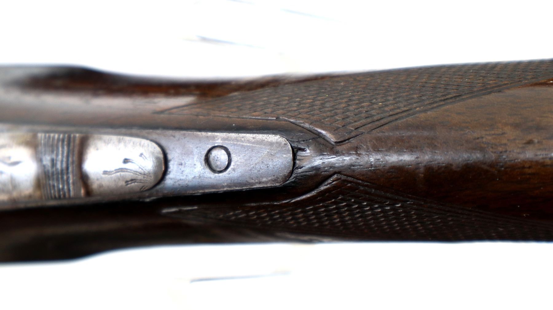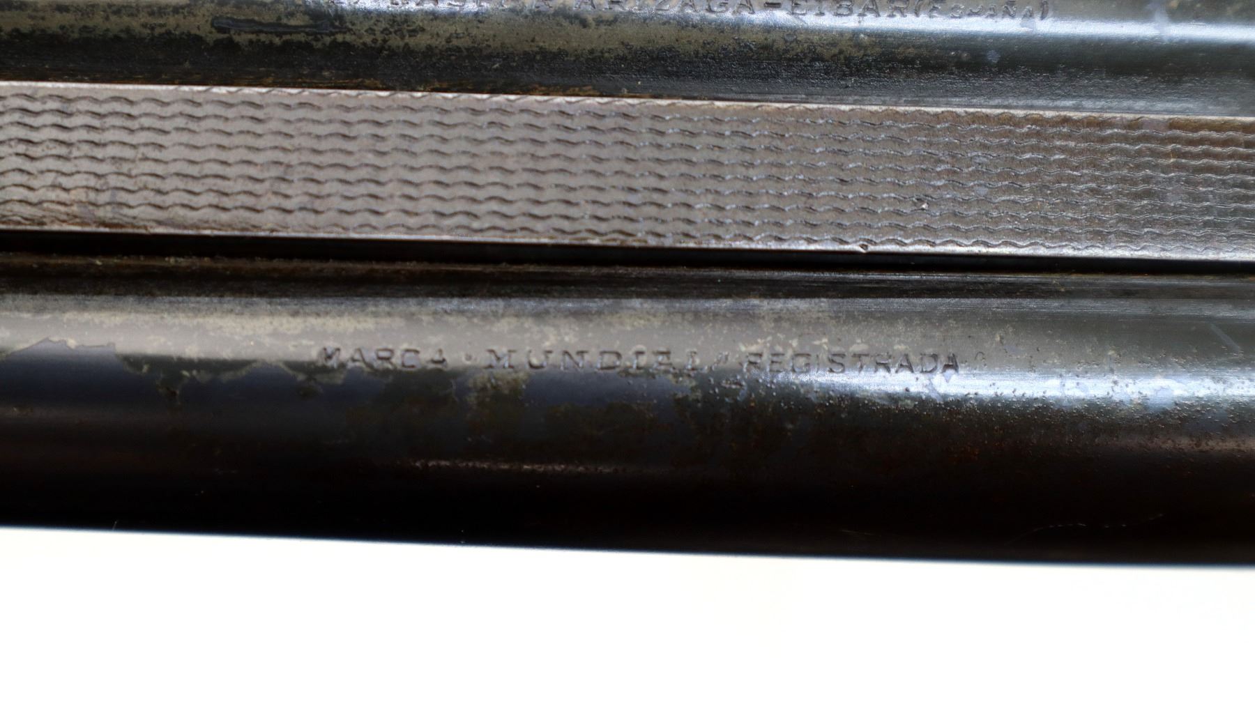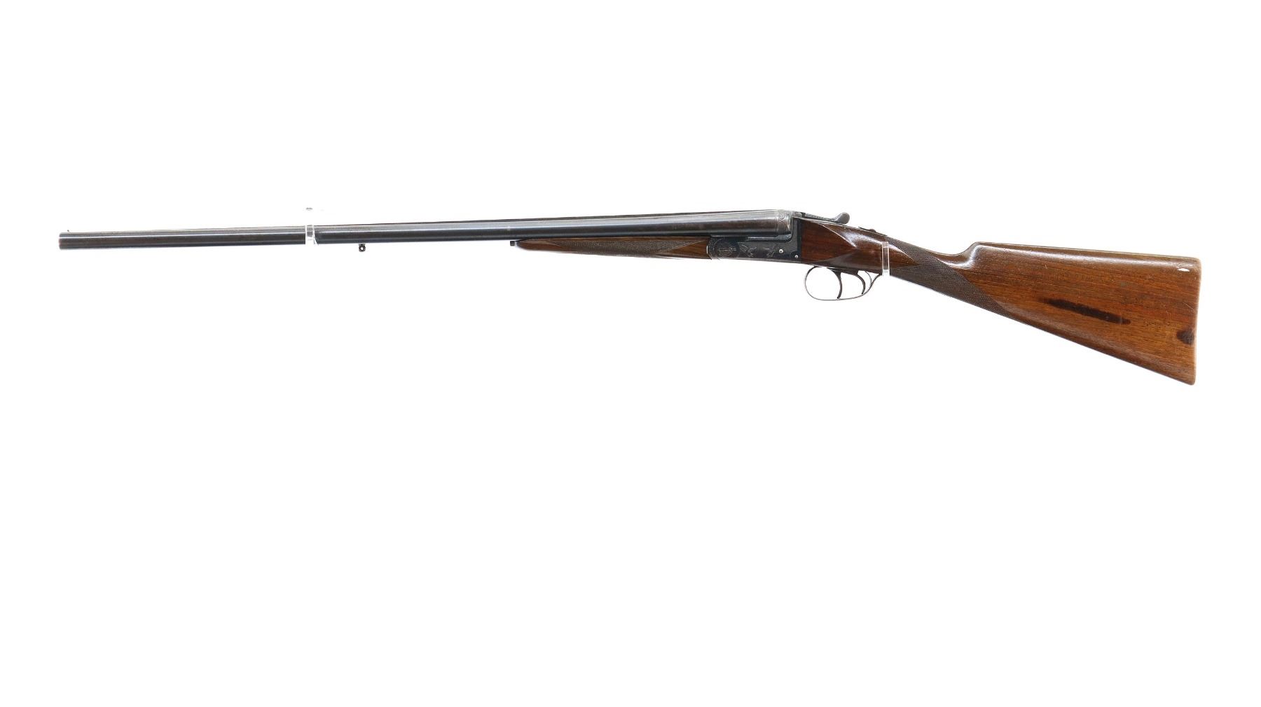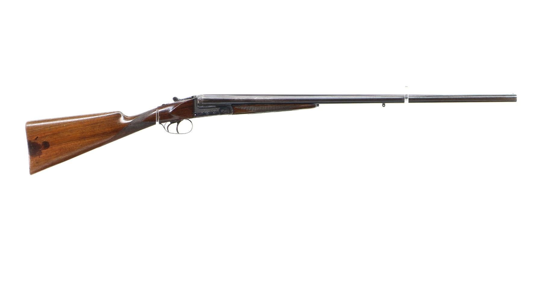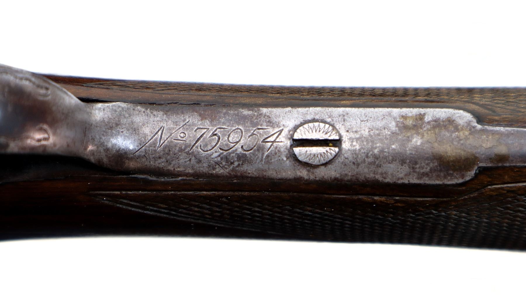 Main Description: Brass bead, blued finish, raised rib, engraved receiver, automatic safety, extractor, double triggers. Two piece wood stocks, checkered forearm and straight grip cracked on right side, grooved wood butt.