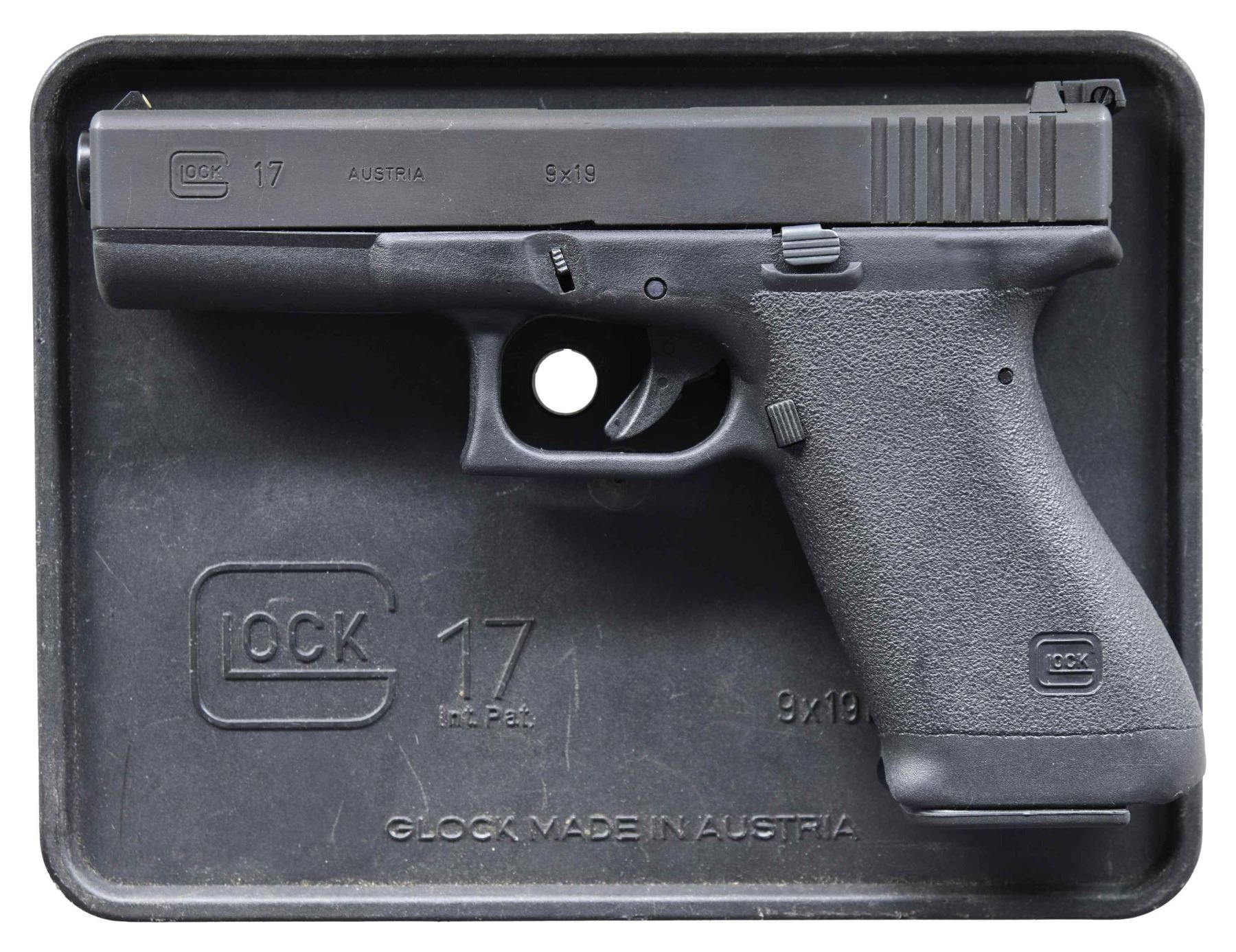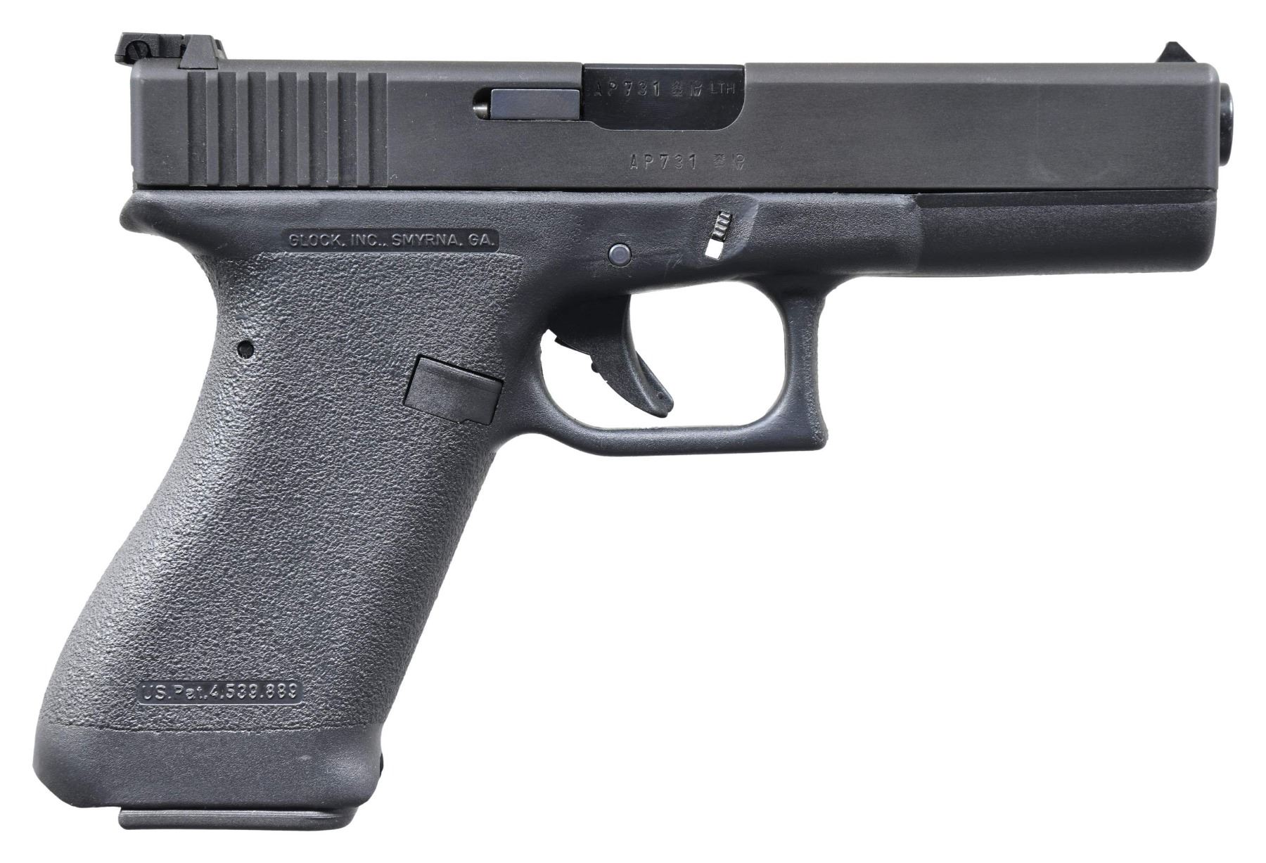 Cal. 9mm Parabellum S# AP731US. Bbl. 4.5" An early (manufactured February 1986) import of the very first generation of Glock model 17 pistols. Bearing "AP" prefix & "US" suffix w/ 3 digit SN. Black polymer frame w/ light stippling around entire circumference of the grip, and no accessory rail. Has correct early magazines w/ unmarked floorplates, complete in plastic "tupperware" container w/ cleaning brush & rod. White dot front sight & white outline "U" rear sight. Flat black, serrated slide. MAGS: 2 original 17rd. UNATTACHED ACCESSORIES: Factory black plastic numbered case, cleaning brush, rod & mag loader. CONDITION: All aspects indicate very little use, if any. Finish is void of typical thinning in areas of mechanical intervention aside from a tiny, thin drag line on top, right corner of chamber exterior, visible under close inspection. Bright bore w/ strong rifling. (25-3229/JZ). MODERN. $350-500