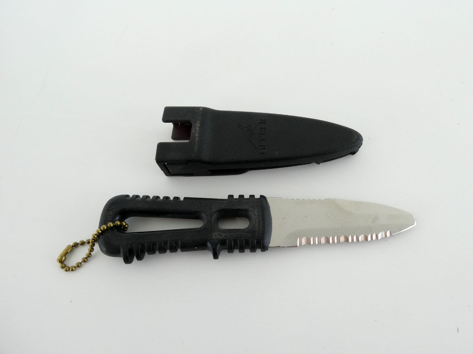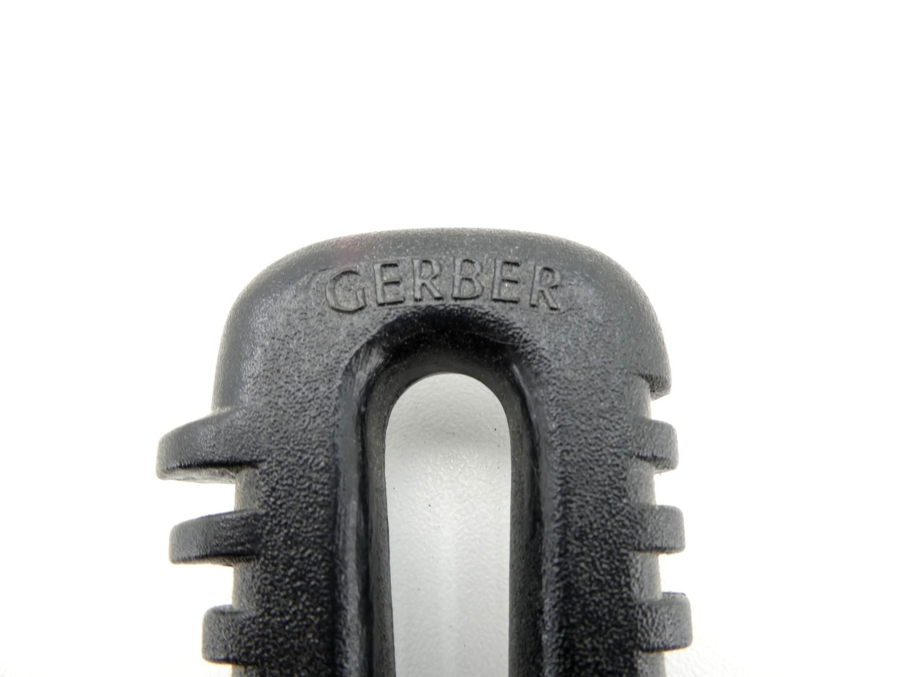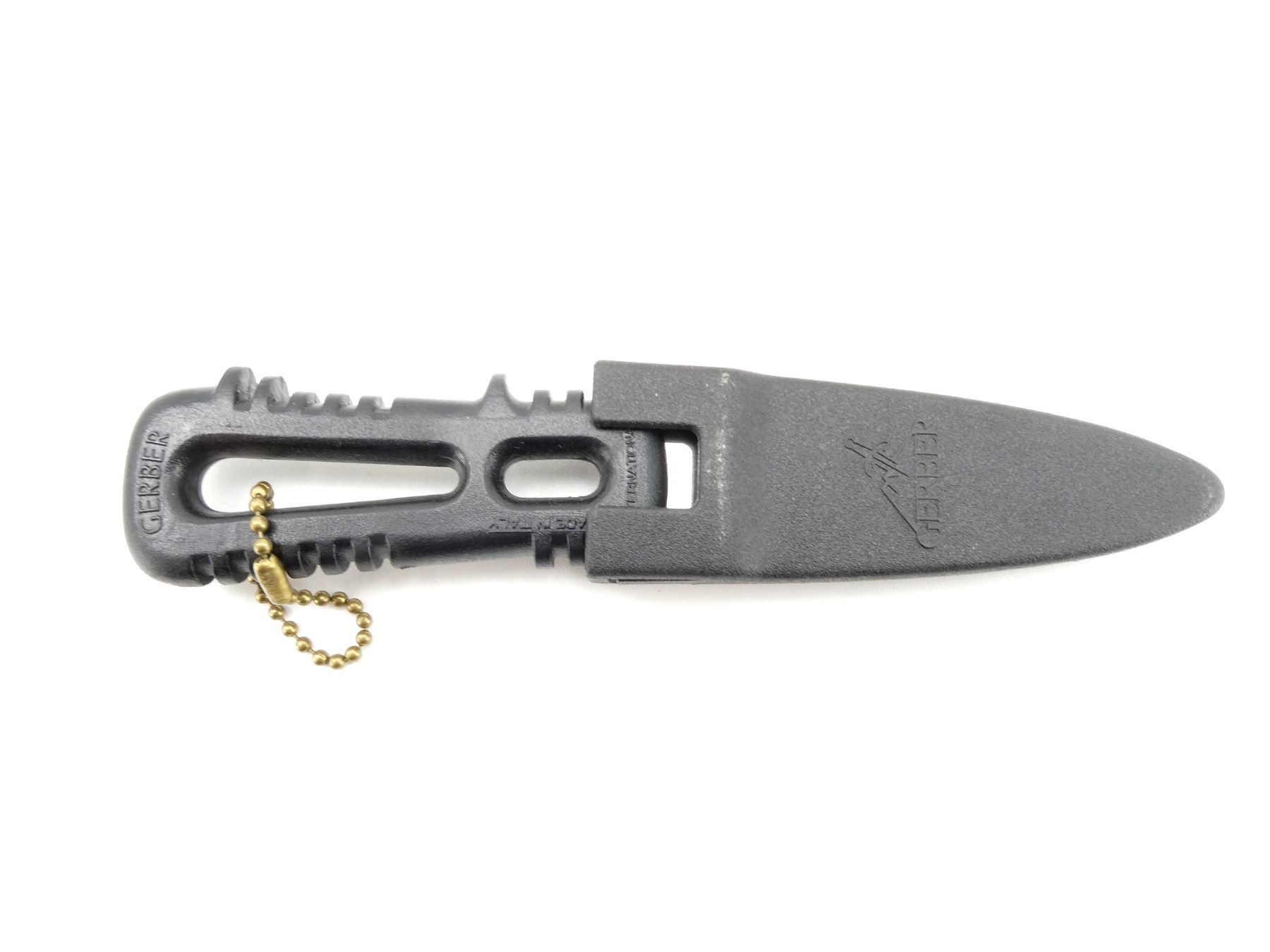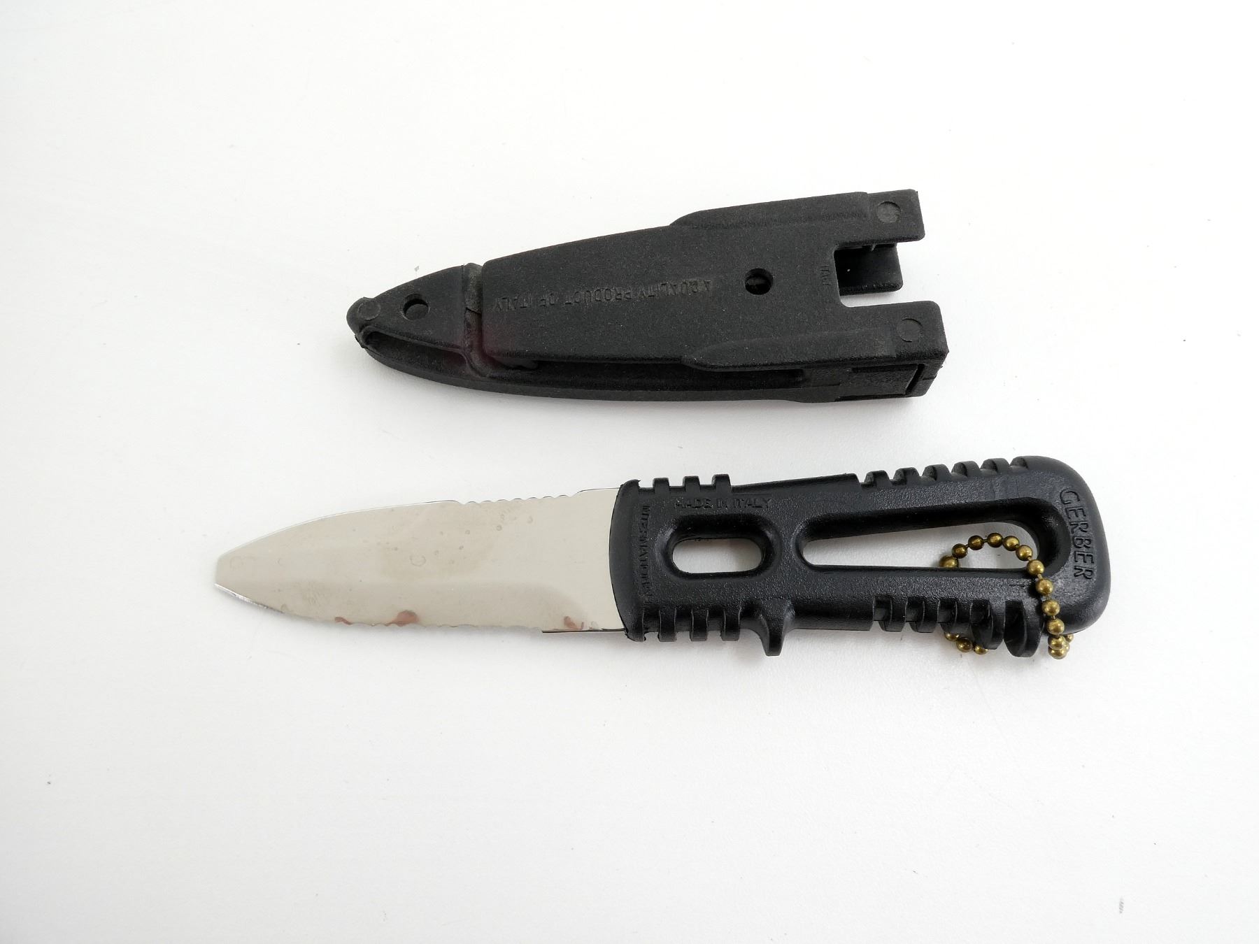 (1) STAINLESS STEEL BLADE, UNMARKED, SERRATED SHARP SIDE FACES UPWARDS & BLUNT TIP, BLACK POLYMER GRIP, MARKED: "MADE ITALY", BLACK POLYMER SHEATH MARKED: "GERBER", ETC., BLADE APPROX. 3 1/8" & OVERALL LENGTH APPROX. 6 7/8". SEE PHOTOS.