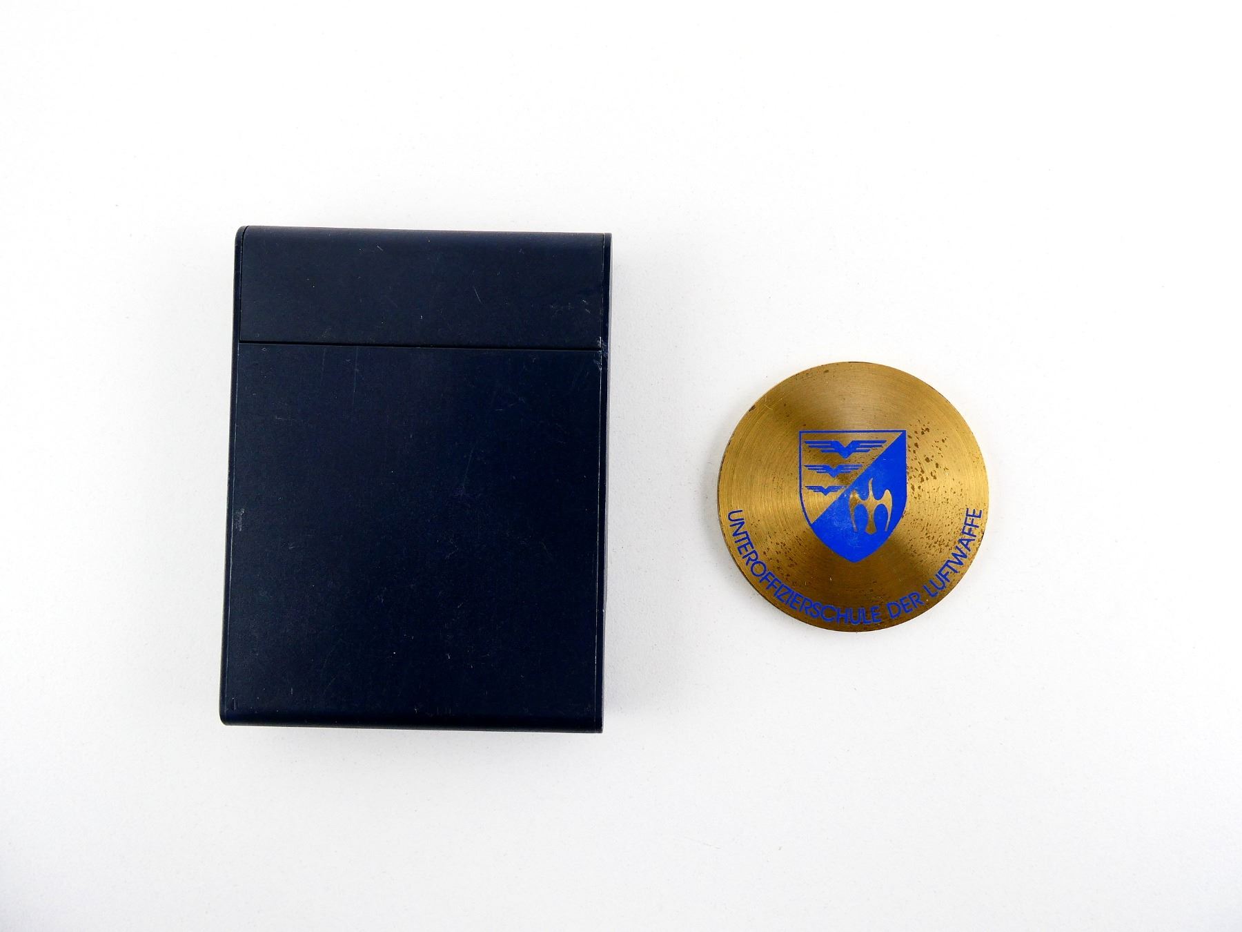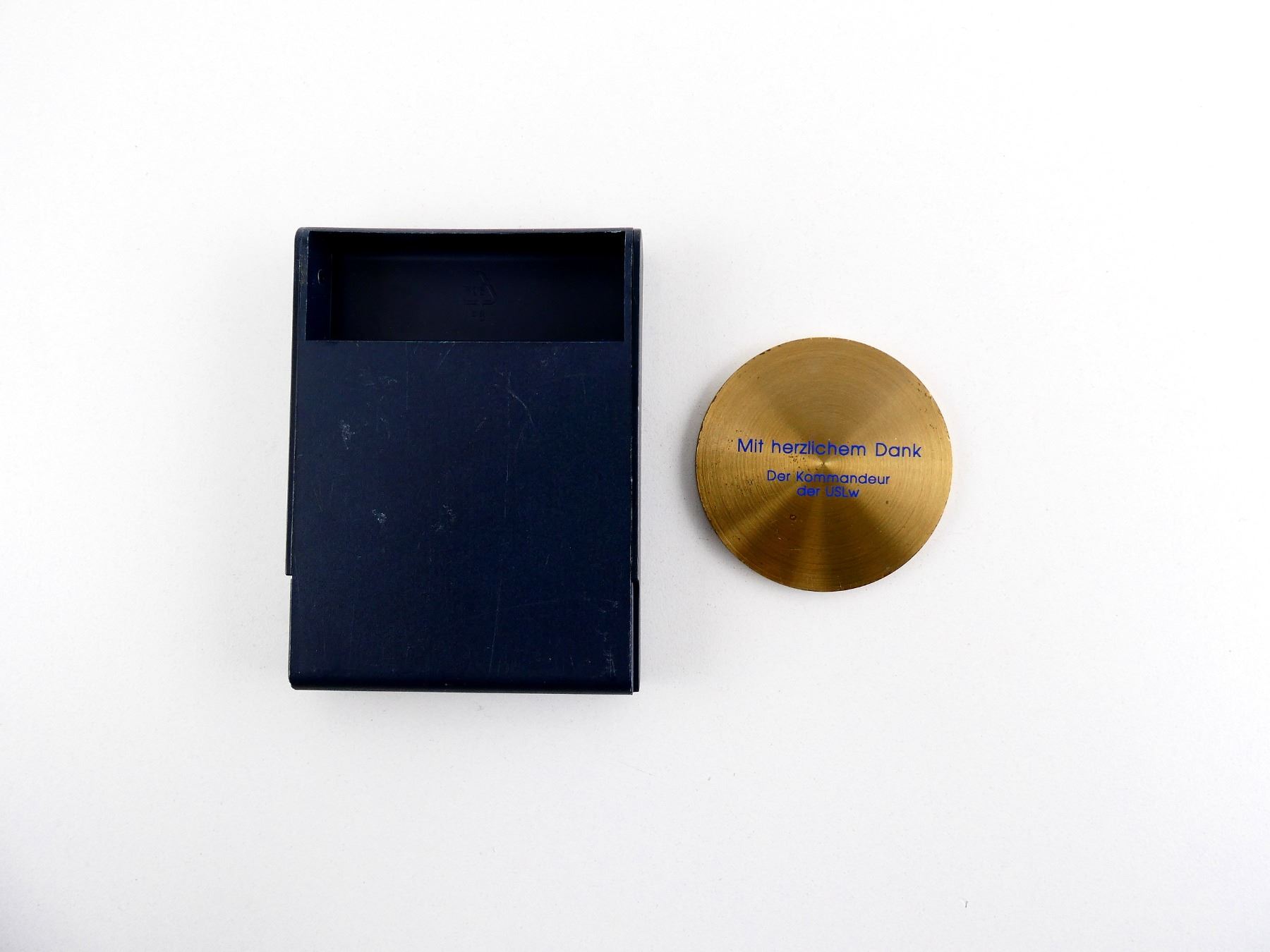 (1) BRASS CHALLENGE COIN MARKED: "UNTEROFFIZIERSCHULE DER LUFTWAFFE (NON-COMMISSIONED OFFICERS' SCHOOL OF THE AIRFORCE)", OTHER-SIDE MARKED: "MIT HERZLICHEM DANK, DER KOMMANDEUR, DER USLW (WITH HEARTFELT THANKS, THE COMMANDER OF THE USLW)", APPROX. 2 3/8". SEE PHOTOS.