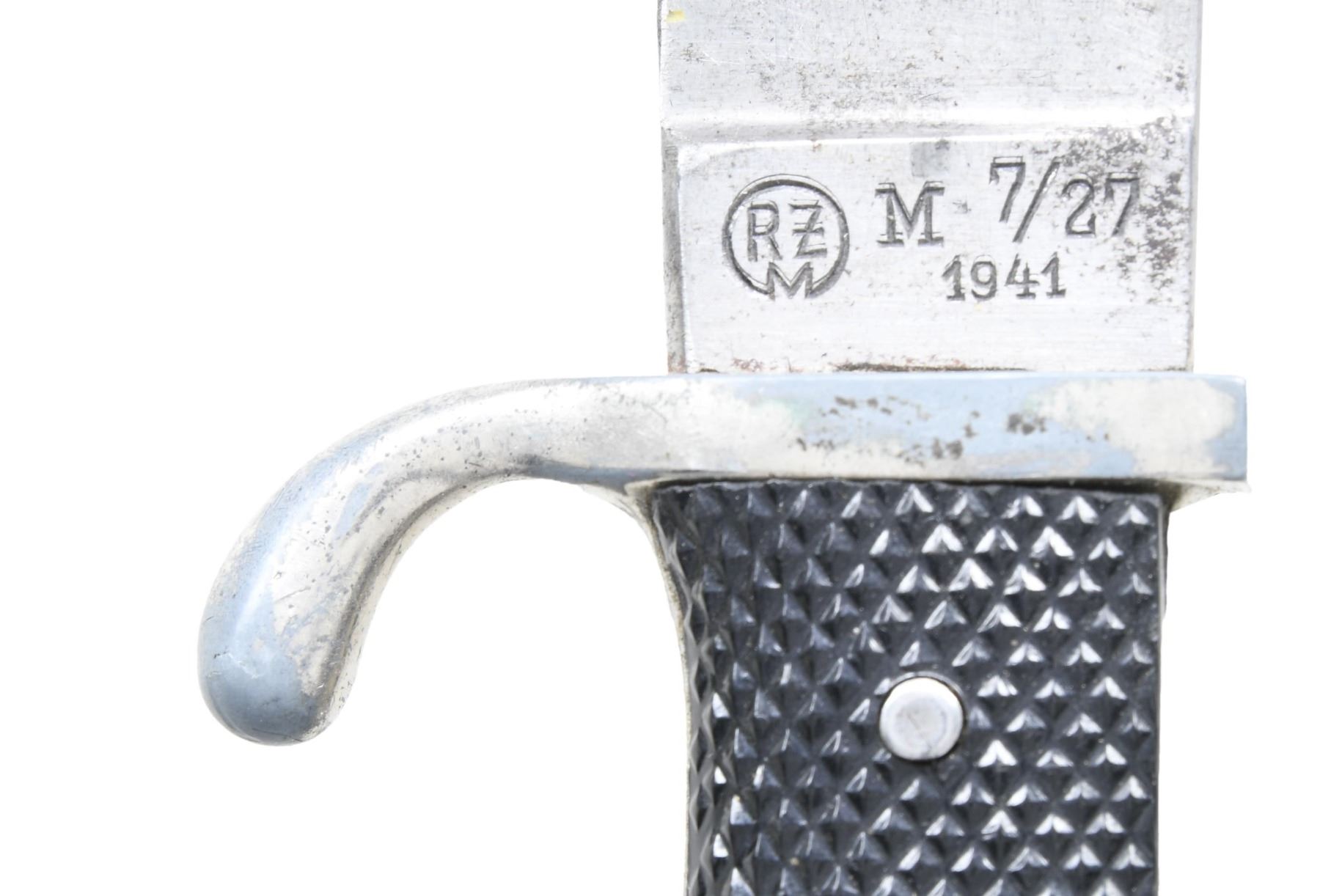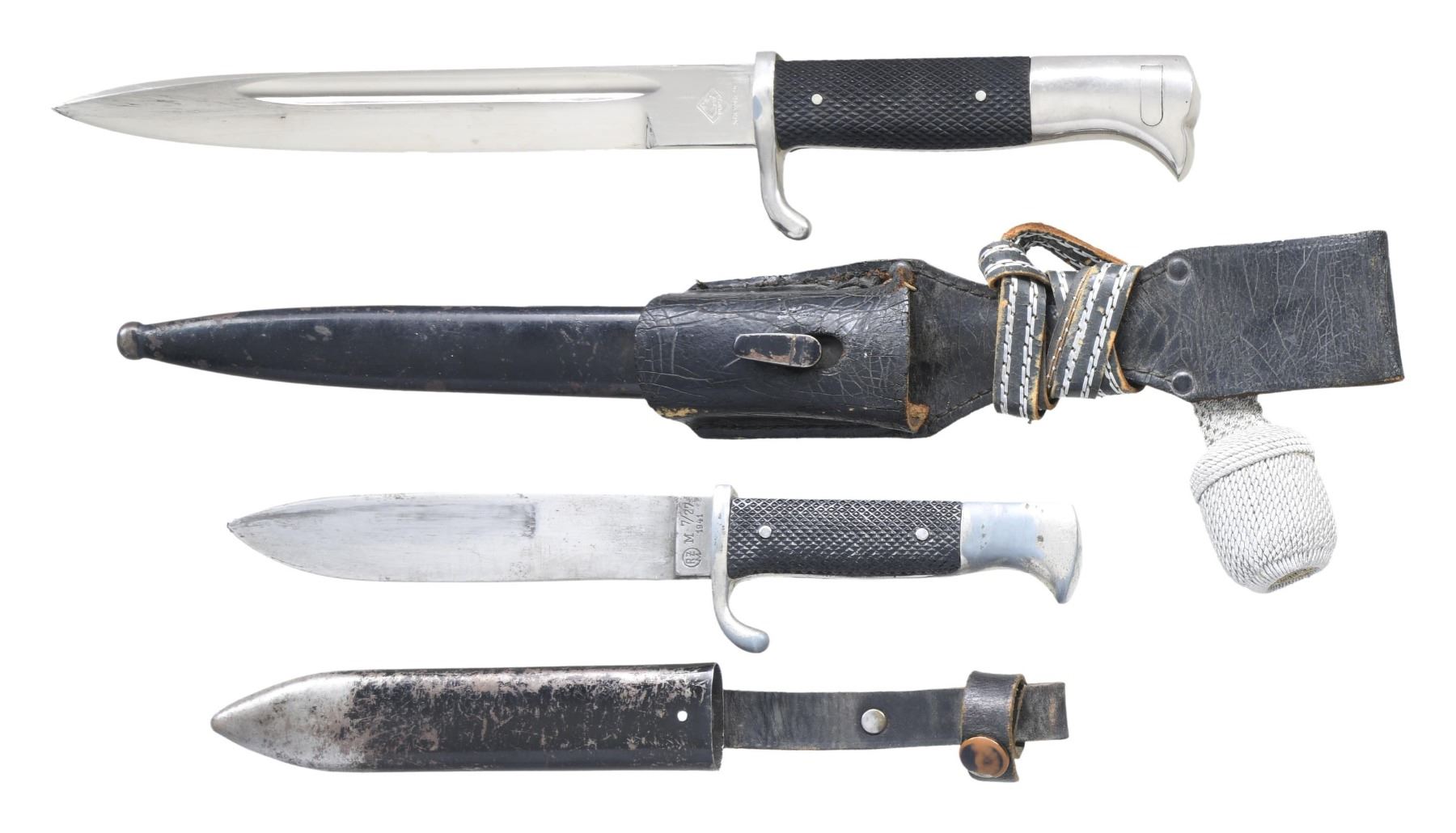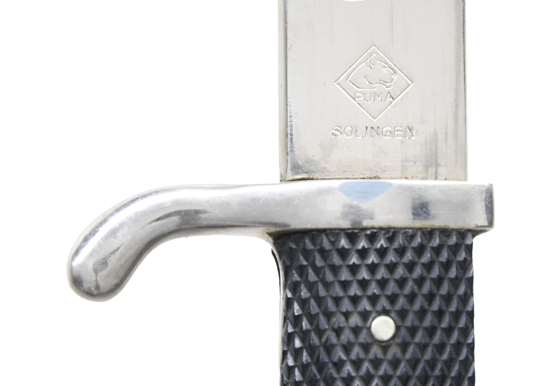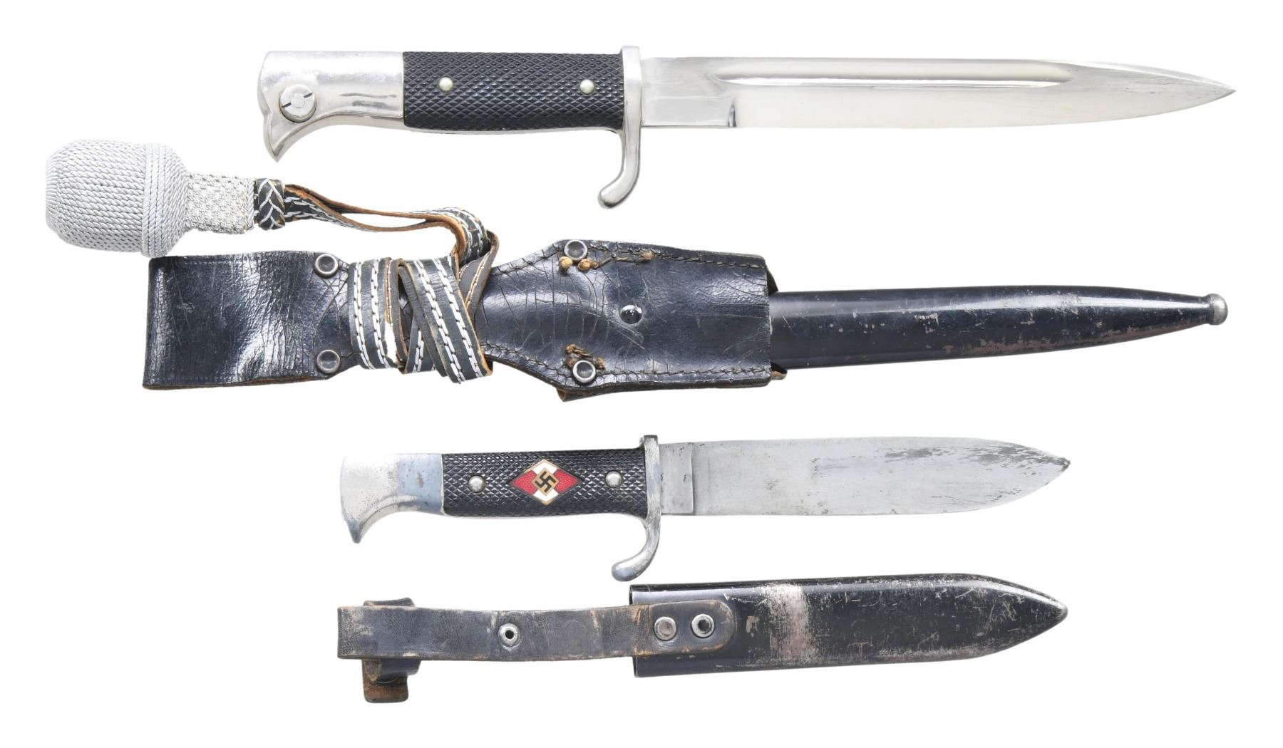 1) Bayonet. This bayonet has an overall length of 14 1/8". Plain blade has a single medium fuller and is marked near the hilt "(logo) PUMA SOLINGEN". Plated guard and pommel with 2-piece black composite grip. Black enamel scabbard with black leather frog. Frog has a green leather and silver bullion knot attached. CONDITION: blade shows original factory polish. Hilt, scabbard, and knot show light wear. The frog shows moderate wear. 2) HJ knife. Overall length: 9 7/8". Plain blade marked on the ricasso "RZM M 7/27 1941". Plated guard and pommel with 2-piece black composite grips. An enameled HJ diamond is inset in the front grip. Black enameled sheath with integral black leather belt loop. CONDITION: blade shows some light sharpening. Hilt and sheath generally show light wear. (02-24047/BF). $300-500.