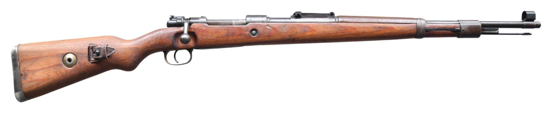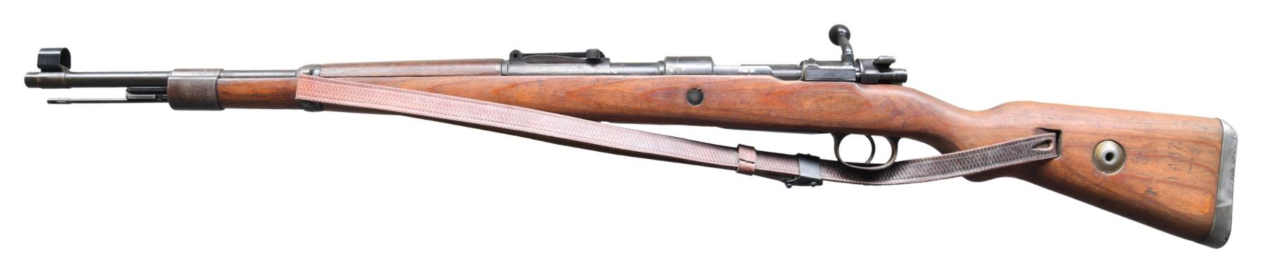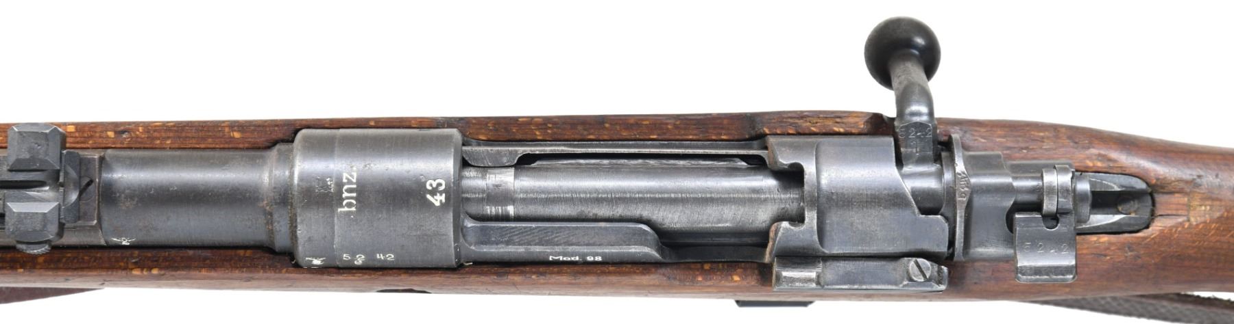 Cal. 8mm Mauser. S# 5242e. Bbl. 23 1/2". Blade front sight with replacement hood. Tangent rear sight graduated to 2000m. Matching numbers on receiver, bands, bolt release, floorplate, trigger guard, rear sight parts & bolt parts. Other visible parts appear unnumbered or mismatched. Receiver has "bnz 43" markings denoting Steyr mfr. in 1943. Various receiver markings have added white highlight. Locking screws missing. Arsenal blued finish. Replacement laminated stock set with post war Yugoslavian markings on left side. Left side sling provisions with repro K98k sling. Repro cleaning rod present that does not stay seated. CONDITION: stock set shows scattered staining, dings, scratches & handling marks. Metal retains 50% arsenal blue with overall fading to gray, scattered oxidation & handling marks. Action functions properly when hand cycled. Bore has scattered pitting & frosting but strong rifling. (25-3750/MJC). CURIO. $500-700.
