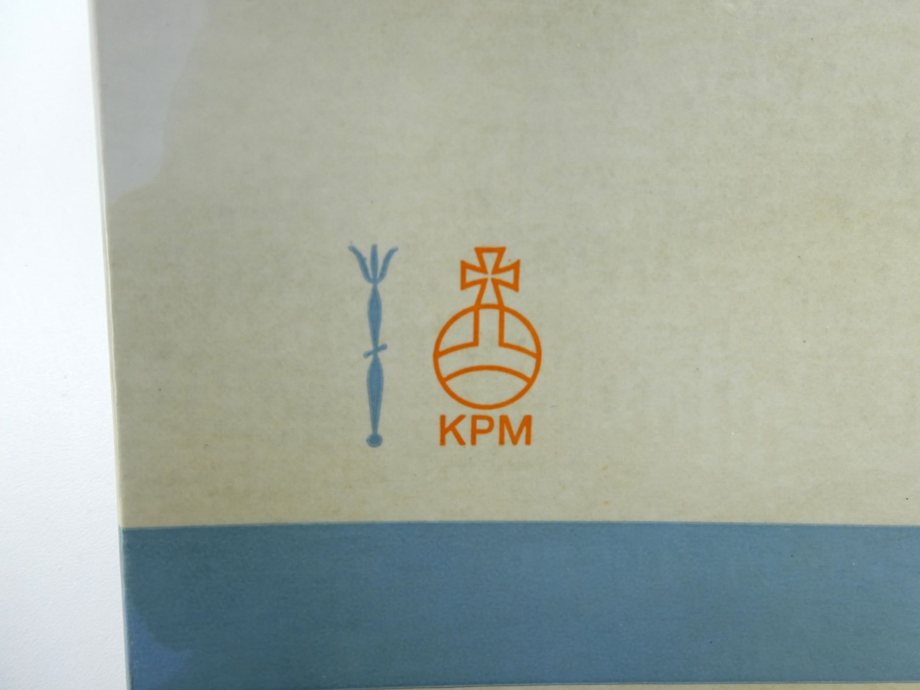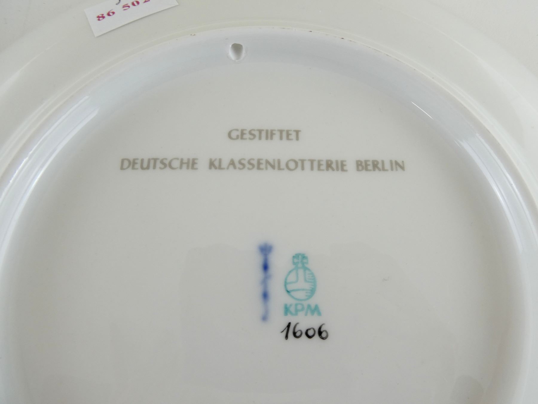 (1) COMMEMORATIVE PLATE FOR BERLIN FIRE BRIGADE, PLATE MARKED: "125 JAHRE, BERLINER FEUERWEHR, 1851-1979", ROYAL BLUE COLOURED PLATE WITH GOLD TRIM / WRITING / DESIGN, BACK MARKED: "GESTIFTET, DEUTSCHE KLASSENLOTTERIE BERLIN", "KPM, 1606" WITH MAKER'S MARK / STICKER, HOLE THROUGH BOTTOM LIP, POSSIBLY FOR HANGING, WITH ORIGINAL BOX, PLATE APPROX. 7.75" DIA. SEE PHOTOS.