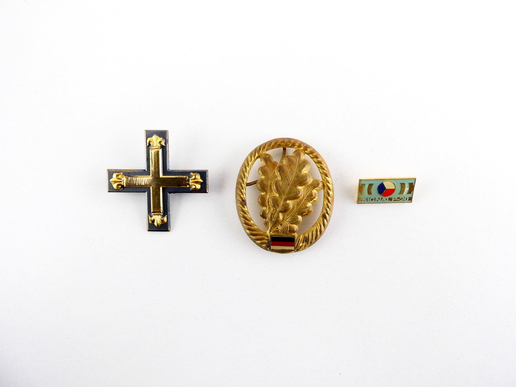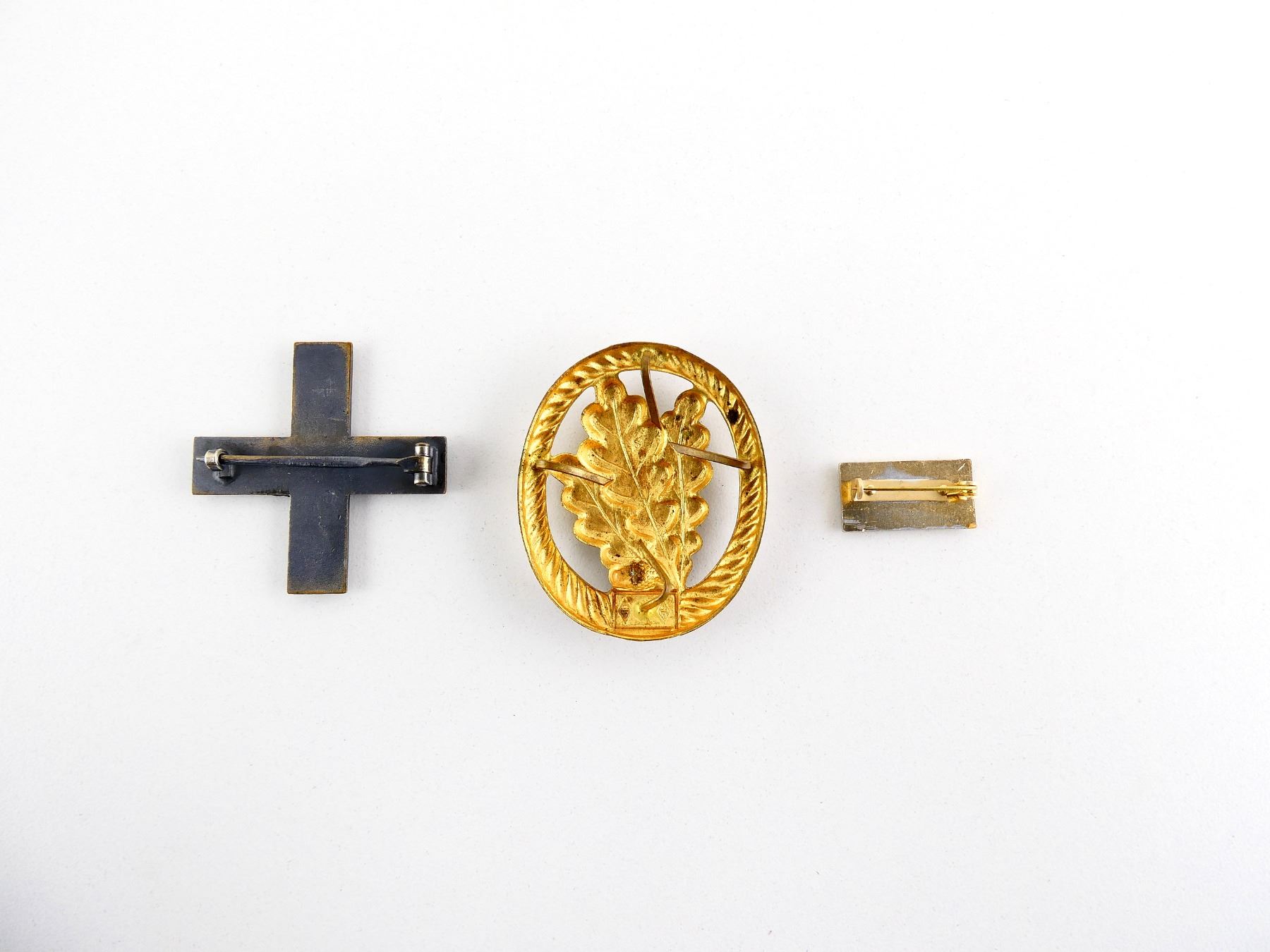 LOT INCLUDES; (1) GERMAN BUNDESWEHR JAGER TROOPS CAP BADGE, BRASS WITH GERMAN FLAG, PIN BACKING, MAKER'S MARKS ON BACK, (1) GERMAN BALTIC CROSS, NON-MAGNETIC, NO VISIBLE MAKER'S MARKS, FLAT PIN BACKING INTACT & (1) CZECH MILITARY AVIATION BADGE. SEE PHOTOS.