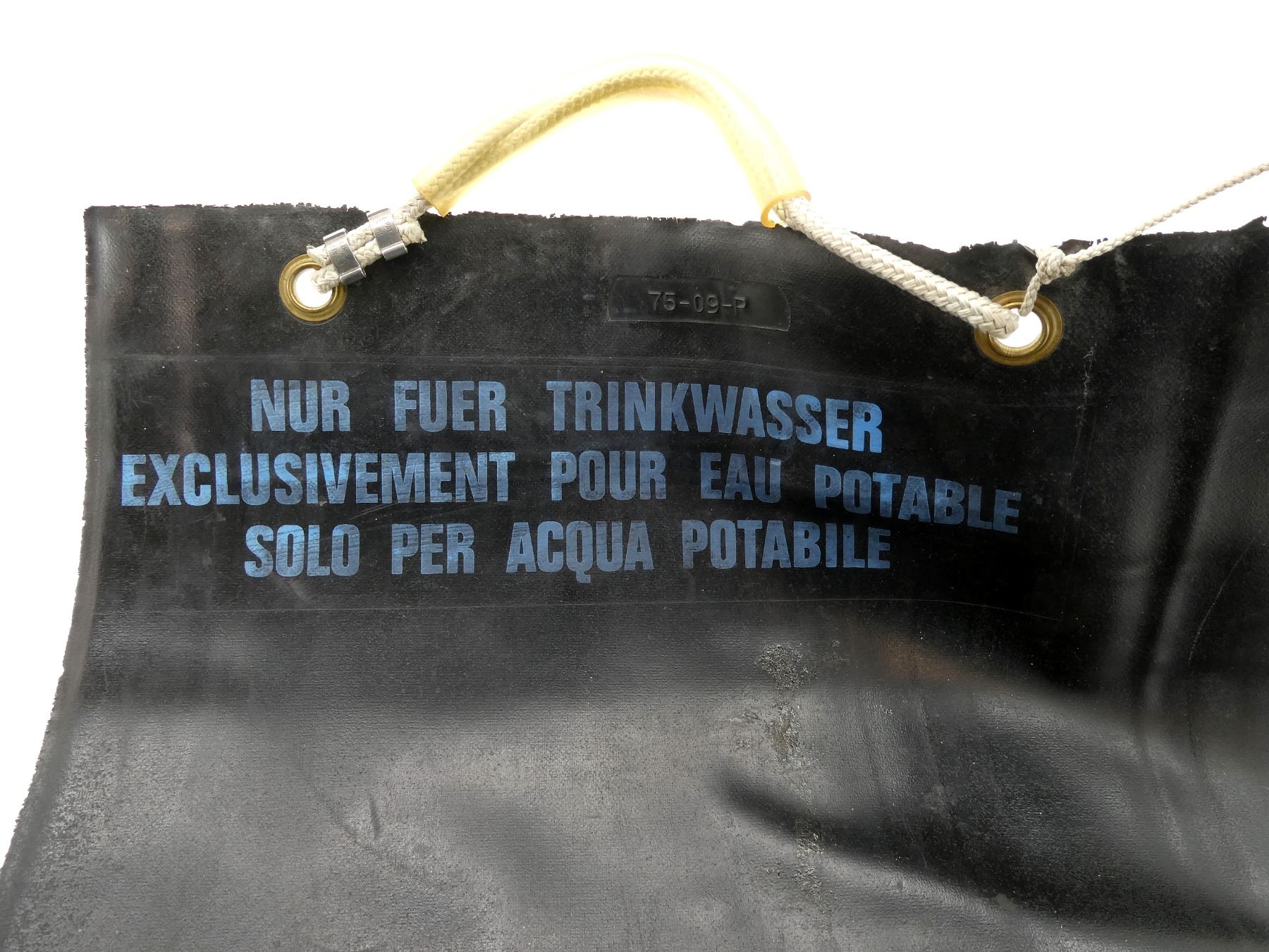 (1) 20 L WATER BAG, BLACK RUBBER WITH ROPE / PLASTIC HANDLES & BLACK PLASTIC FILLER NECK, MARKED: "NUR FUER TRINKWASSER EXCLUSIVEMENT POUR EAU POTABLE SOLO PER ACQUA POTABILE" & "75-09-P", SHOWS AGE / WEAR, APPROX. 17.75" X 24". SEE PHOTOS.