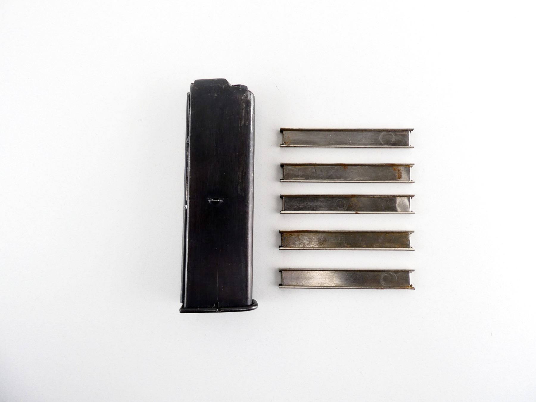 LOT INCLUDES; (1) M712 SCHNELLFEUER 7.63 MAUSER, 10/20 ROUND PINNED MAG, BLUED STEEL CONSTRUCTION, BASE MARKED: "23688" & (5) CZECH SMG 9MM STRIPPER CLIPS, 10 RNDS, STEEL CONSTRUCTION, VARIUS MARKINGS. SEE PHOTOS. PAL REQUIRED.