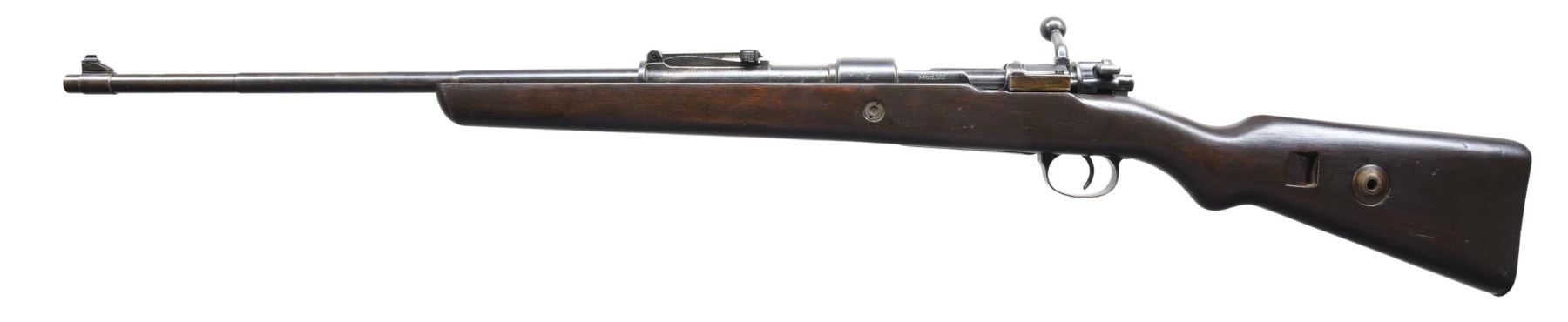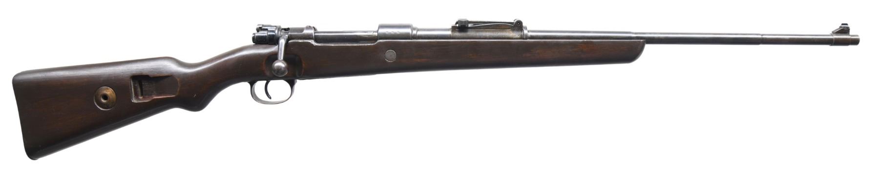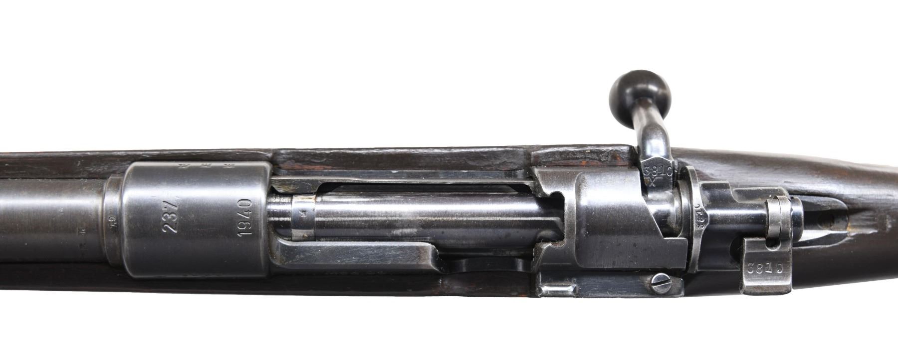Cal. S# 9000H. Bbl. 24". Replacement white bead front sight w/ graduated leaf military rear sight. Front receiver ring is dated "1940" below number "237" indicating mfg. by Berlin Lubecker Machinefabrik. Bolt & bottom metal have non-matching number "3810S". Laminated stock is cut to sporter length. Handguard is removed. CONDITION: metal retains over 50% blue fading to brown. Stock has a dark refinish. Good bore. PROVENANCE: from the renowned collection of quality sporting arms from Lewis Drake together with inventory of Lewis Drake Associates. (24-6574/DS). CURIO. $300-500.