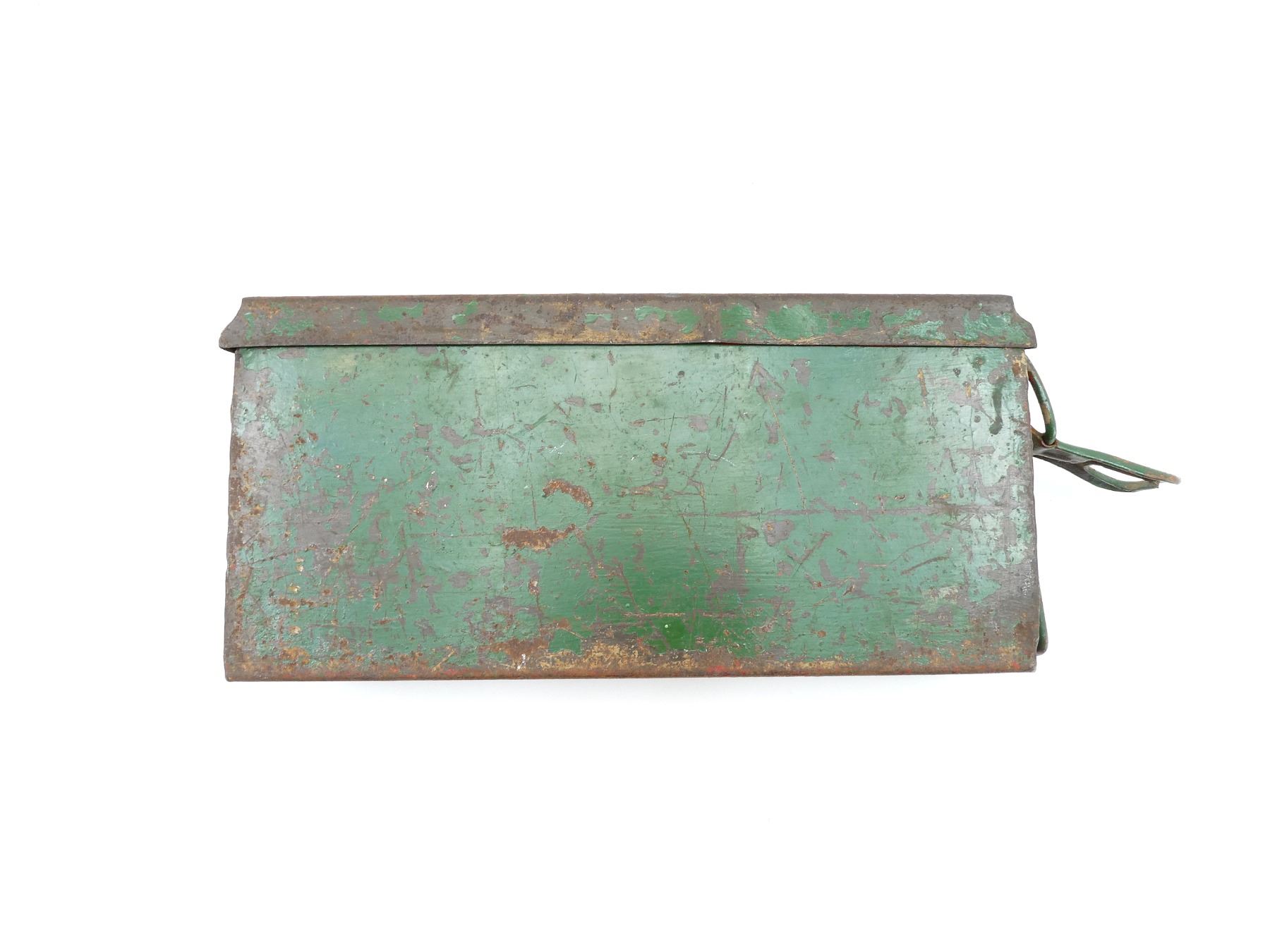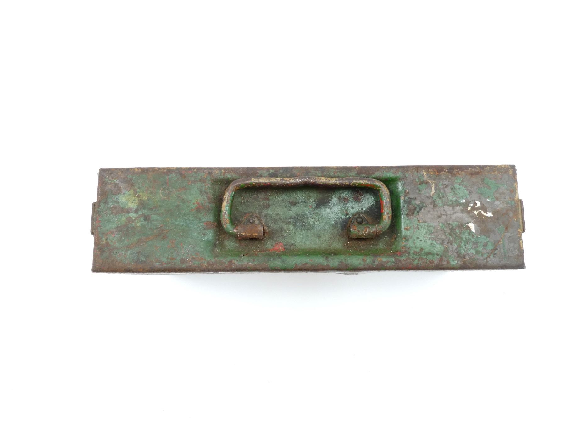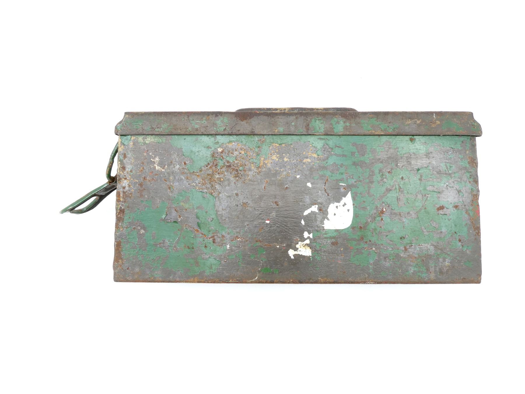 (1) GREEN PAINTED STEEL AMMO TIN WITH CARRY HANDLE, NO VISIBLE MARKINGS, APPROX. 14.75" X 3.5" X 7". SEE PHOTOS.