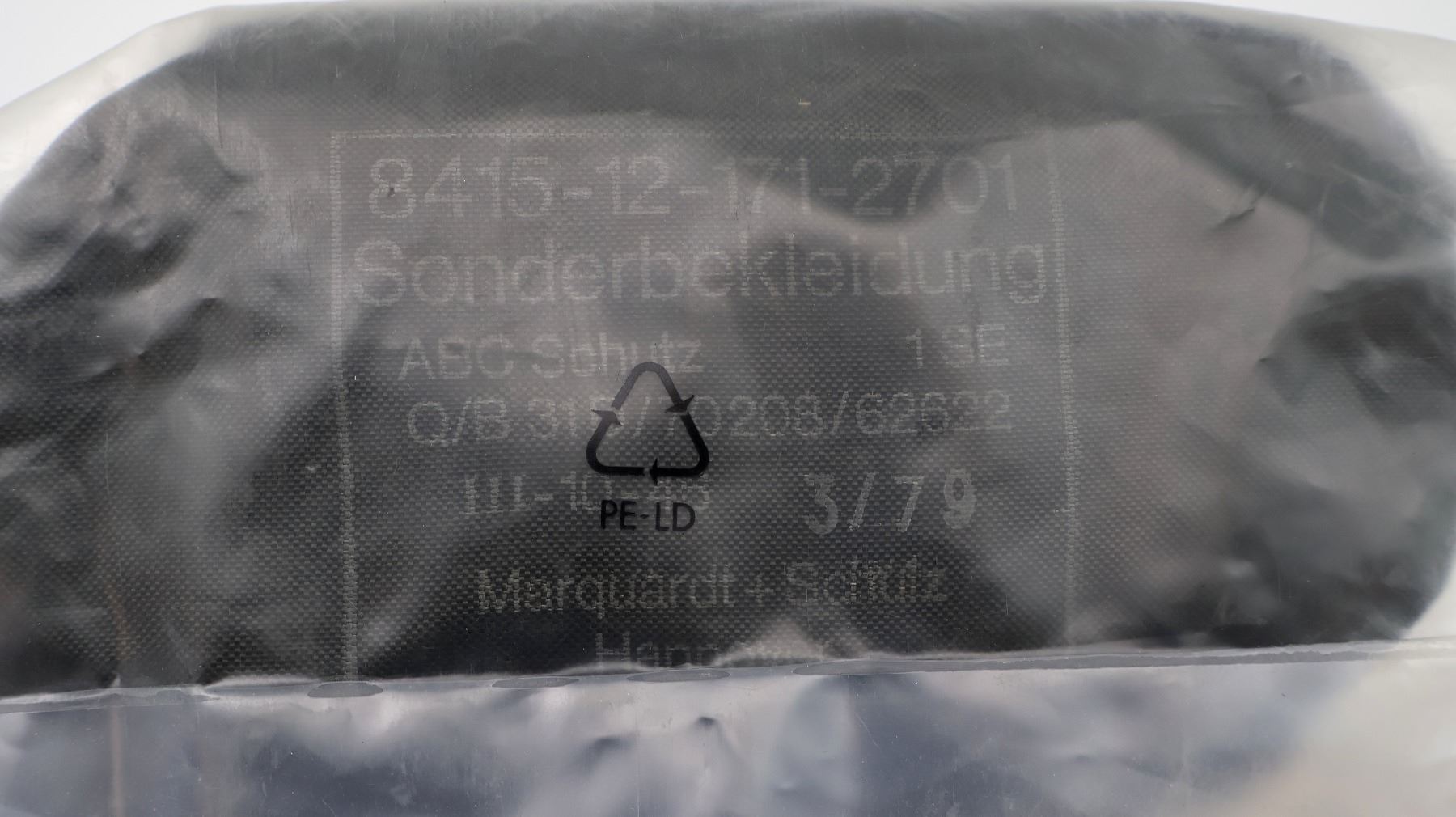 C\(1) GREEN NYLON, APPEARS NEW OLD STOCK, IN CARRIER BAG, BAG MARKED: "8415-12-171-2701, SONDERBEKLEIDUNG, ABC SCHUTZ, 1SE, Q/B 31D/70208/62622, III-10-46, 3/79, MARQUARDT+SCHUTZ, HANNOVER". SEE PHOTOS.