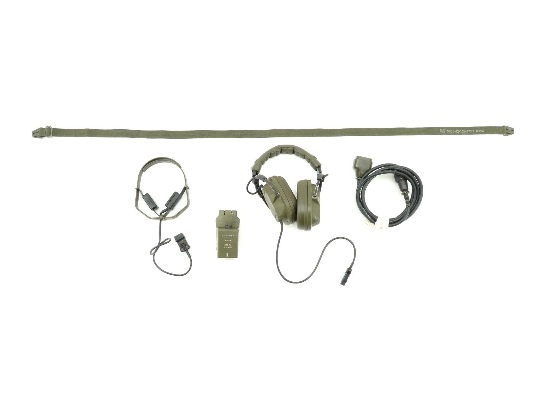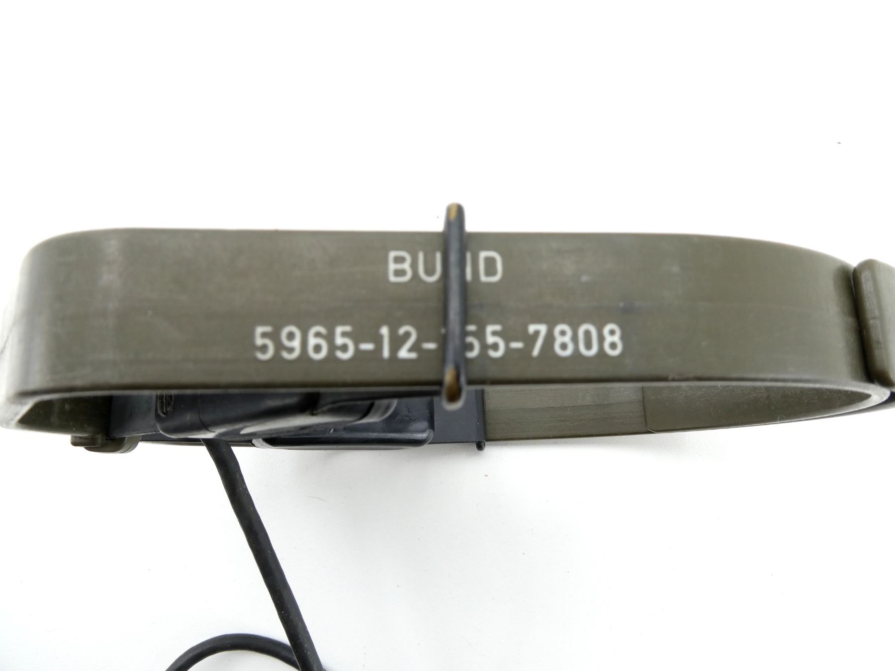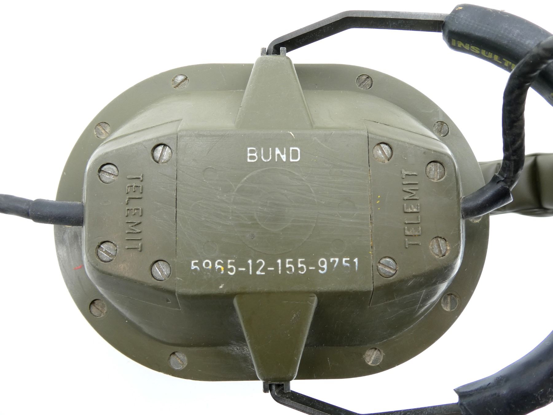 LOT INCLUDES; (1) GREEN / BLACK PLASTIC / RUBBER HEAD SET, MARKED: "TELEMIT, BUND, 5965-12-155-9751", WITH CONNECTOR CABLE, (1) GREEN / BLACK PLASTIC THROAT MICROPHONE WITH CONNECTOR CABLE, MARKED: "BUND, 5965-12-155-7808", VARIOUS MARKINGS ON CABLE, (1) BLACK RUBBER WRAPPED CABLE WITH TWO CONNECTOR ENDS, CABLE MARKED: "BUND-TELEMIT", "5995-12-155-9755", DATED: "1983, 1988" WITH VARIOUS OTHER MARKINGS, (1) GREEN PLASTIC / METAL CONTROL BOX / SWITCH, MARKED: "SA-267/SEM, BUND, 5965-12-155-9752", VARIOUS CONNECTOR PORTS, CLIP ON BACK & (1) GREEN STRAP WITH METAL FITTINGS, MARKED: "5965-12-155-9753, BUND" WITH MAKER'S MARK, OVERALL LENGTH APPROX. 43", ADJUSTABLE. SEE PHOTOS.