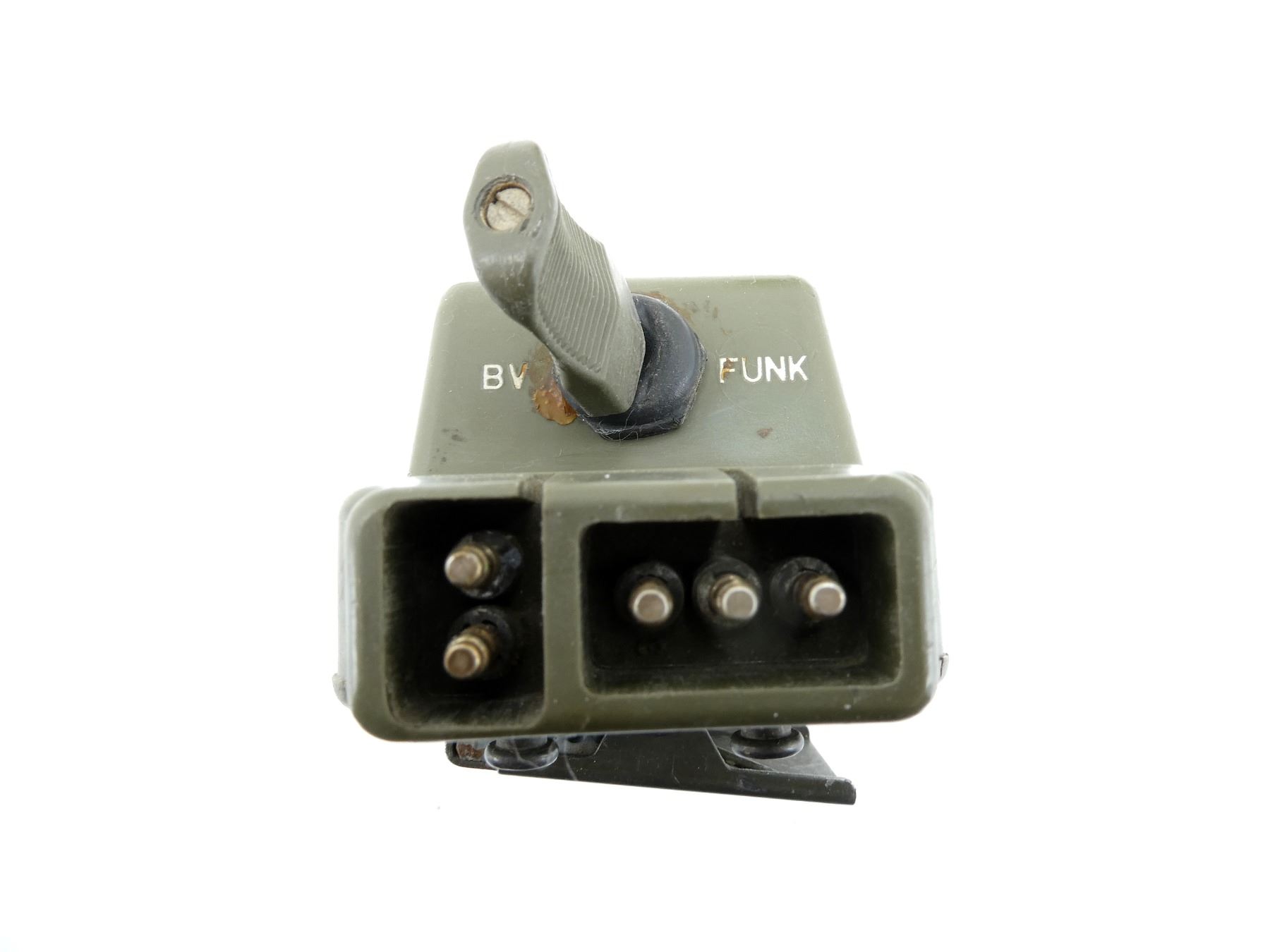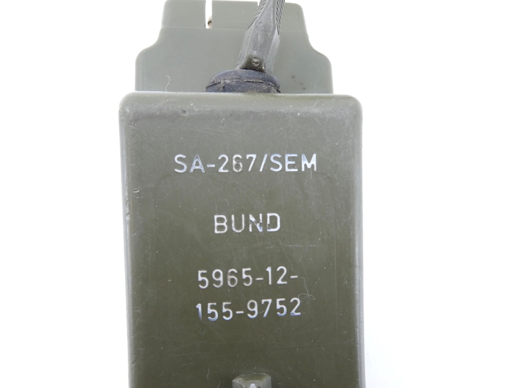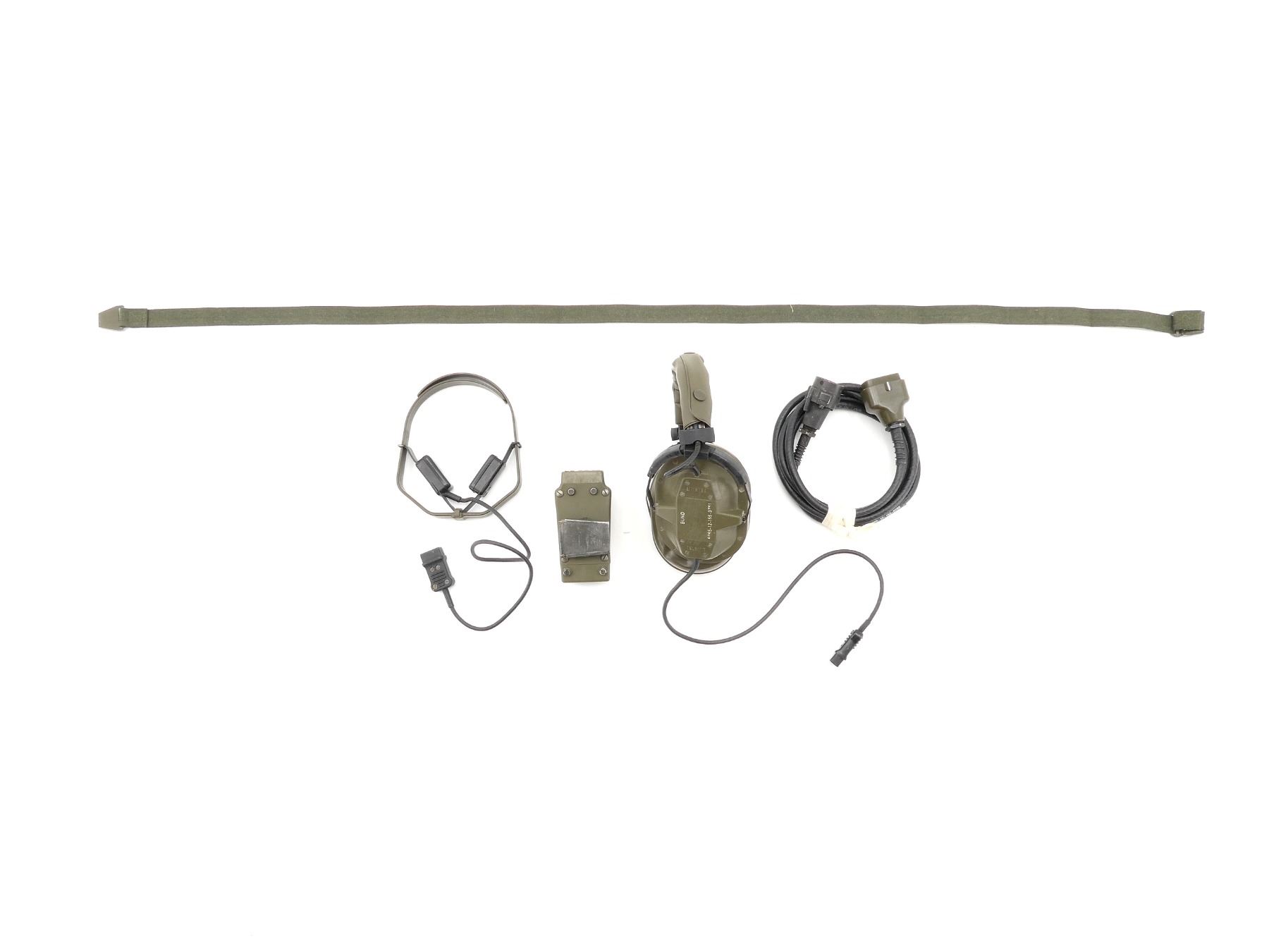 LOT INCLUDES; (1) GREEN / BLACK PLASTIC / RUBBER HEAD SET, MARKED: "TELEMIT, BUND, 5965-12-155-9751", WITH CONNECTOR CABLE, (1) GREEN / BLACK PLASTIC THROAT MICROPHONE WITH CONNECTOR CABLE, MARKED: "BUND, 5965-12-155-7808", VARIOUS MARKINGS ON CABLE, (1) BLACK RUBBER WRAPPED CABLE WITH TWO CONNECTOR ENDS, CABLE MARKED: "BUND-TELEMIT", "5995-12-155-9755", DATED: "1983, 1988" WITH VARIOUS OTHER MARKINGS, (1) GREEN PLASTIC / METAL CONTROL BOX / SWITCH, MARKED: "SA-267/SEM, BUND, 5965-12-155-9752", VARIOUS CONNECTOR PORTS, CLIP ON BACK & (1) GREEN STRAP WITH METAL FITTINGS, MARKED: "5965-12-155-9753, BUND" WITH MAKER'S MARK, OVERALL LENGTH APPROX. 43", ADJUSTABLE. SEE PHOTOS.