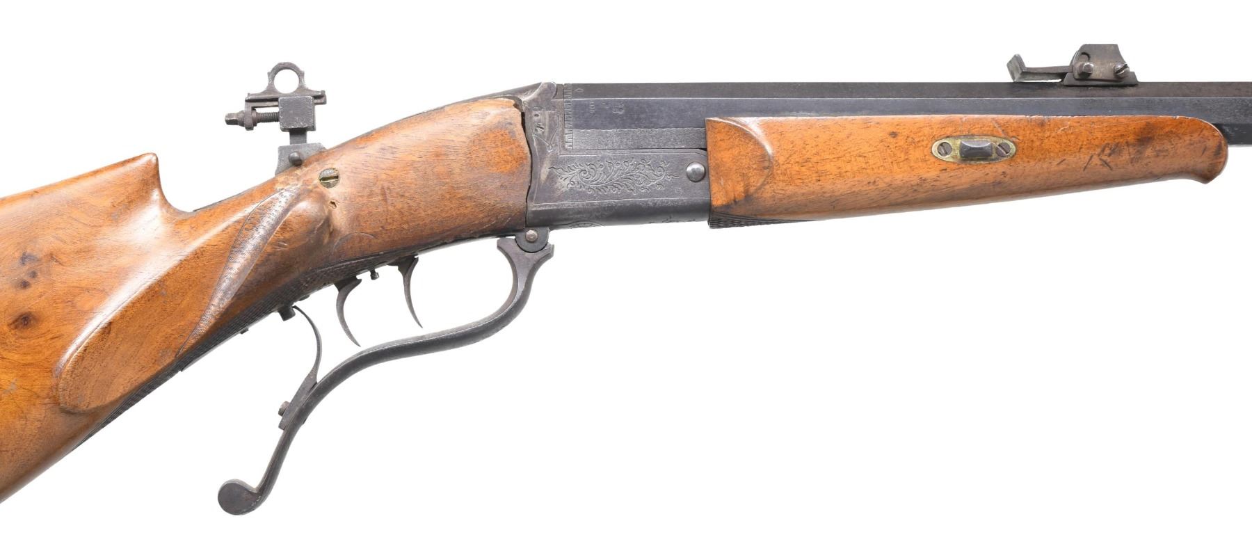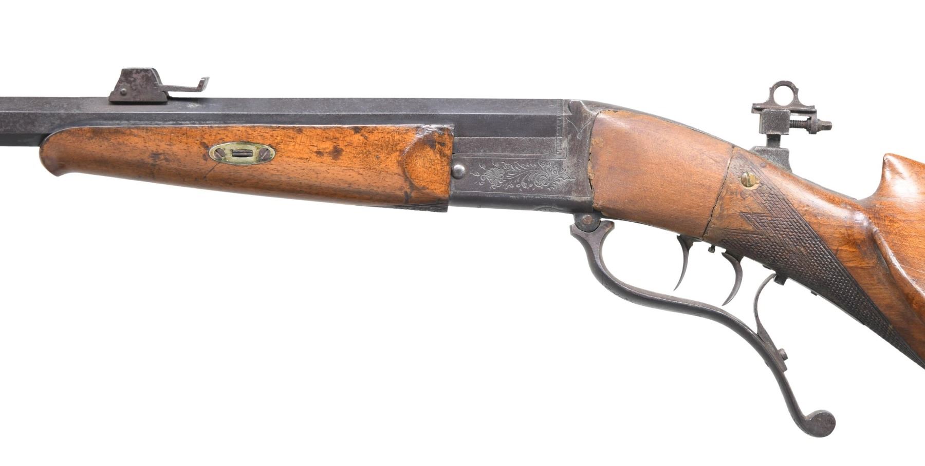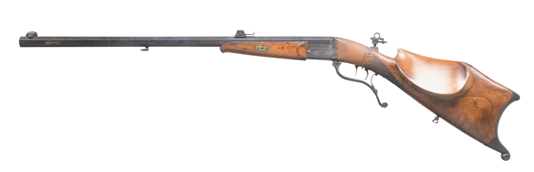 Cal. 4mm RF. NSN. Oct. 26" bbl. has about 8" of rifled bore showing German "BUG" proofs along with "1198" gauge proof indicating 4mm. Protected post front sight, tangent notch rear sight & tang staff for aperture disk. Top break action w/ finger rest trigger guard acting as release lever. Dbl. set triggers. Wedge fastened walnut forearm. Straight grip walnut stock w/ right side thumb rest, left side offset cheek rest & Scheutzen buttplate. CONDITION: Barrel has faded blue mixed with oxidation & patina. Receiver has faded case colors mixed with brown patina & oxidation. Lefty side wrist has replacement wood piece at break with screw type repair being loose to frame. Most of wood shows good varnish with handling marks. Buttplate has brown patina with oxidation. Oxidized bore. (25-2016/MD). CURIO. $500-800.