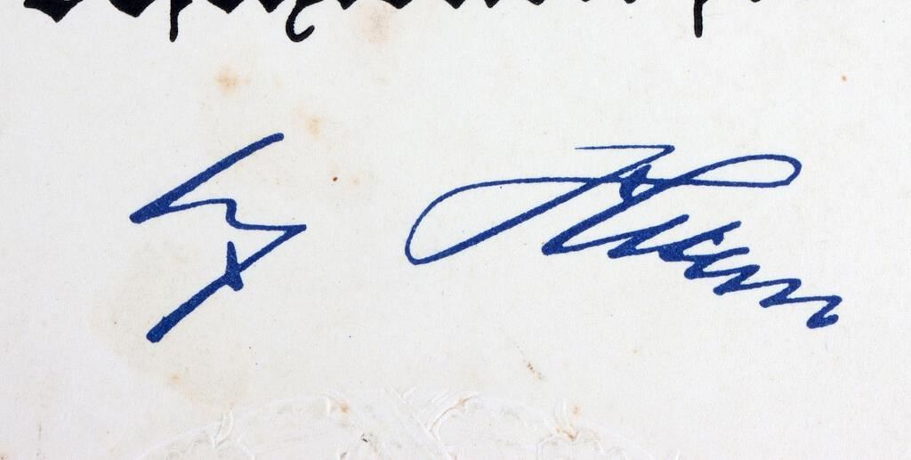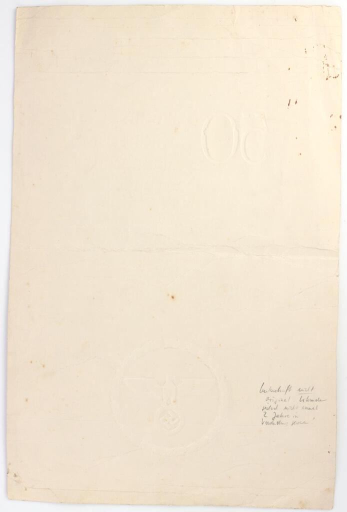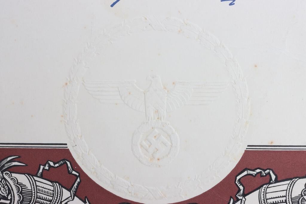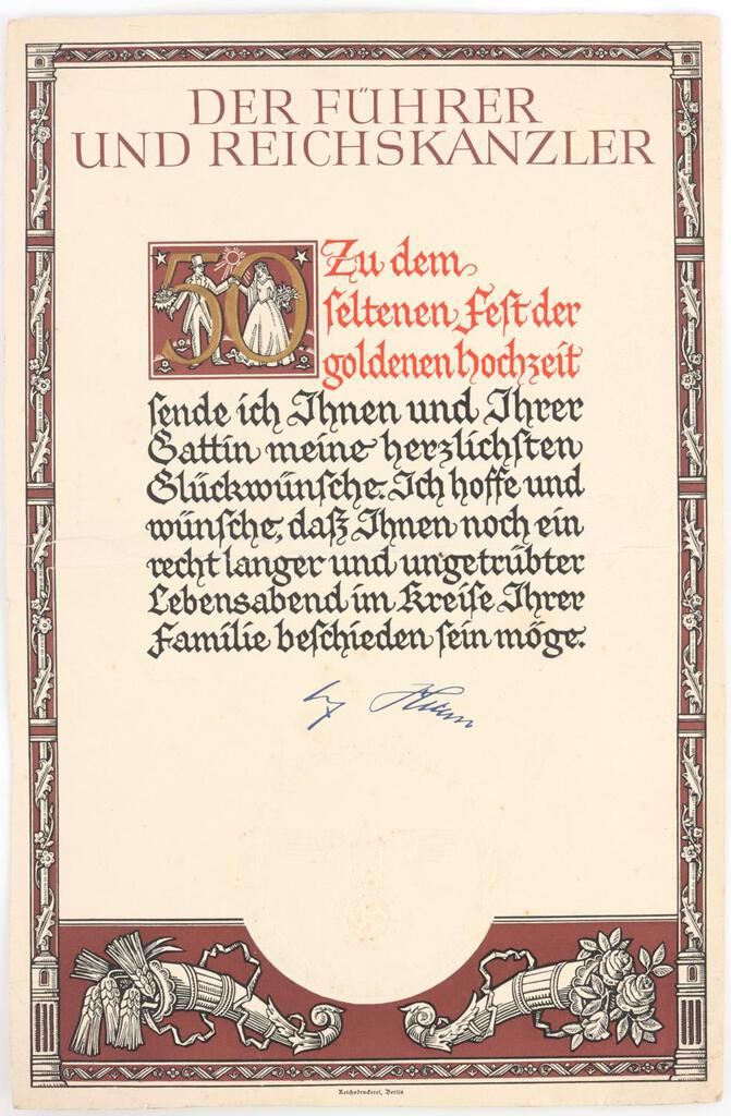 A fifty year marriage recognition certificate presented by Adolf Hitler(Der Fuhrer und Reichskanzler). Certificate features a facsimile Hitler signature and a large embossed, 3" diameter, eagle/swastika/wreath, seal. Document is approx. 13 inches by 8 1/2 inches. Good condition. This lot has a reserve.