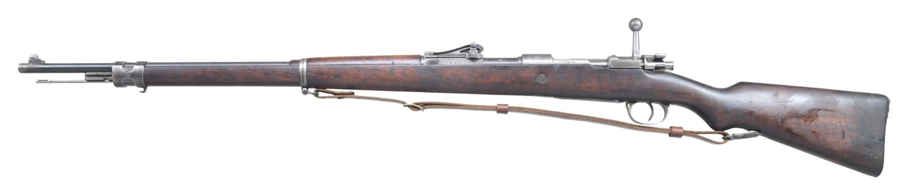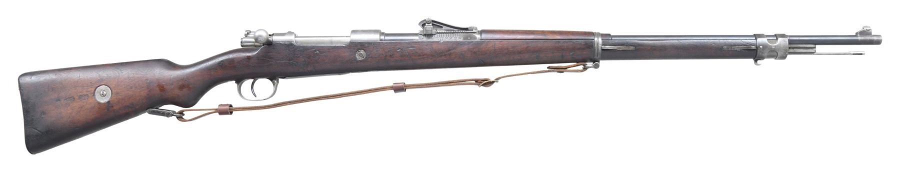 Cal. 8mm Mauser. S# 2958x. Bbl. 29". Blade front sight. "Lange vizier" rear sight graduated to 2000m. Front band & small bolt parts are mismatched. Bolt handle & sleeve were renumbered to match in a modern font without suffix. Other visible parts are matching to receiver. Receiver ring has Spandau arsenal markings & 1916 date. Receiver, bolt assembly & buttplate are all "In-the-white". Balance of other parts are blued. Walnut stock set with bottom mounted sling swivels & aftermarket leather sling. Right side of butt has partially faded Imperial cartouches. Matching numbered cleaning rod present. CONDITION: stock set appears lightly cleaned with scattered dings, staining & handling marks. Buttplate shows heavy oxidation & foreign residue from improper storage. Bolt & receiver appear lightly cleaned with some light oxidation & areas turning gray. Balance of metal is mostly gray with bottom metal being a silvery color, scattered oxidation, edge wear, handling marks & traces of original blue. Action functions properly when hand cycled. Very good plus bright bore. (25-3872/MJC). CURIO. $400-600.
