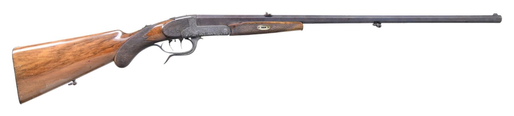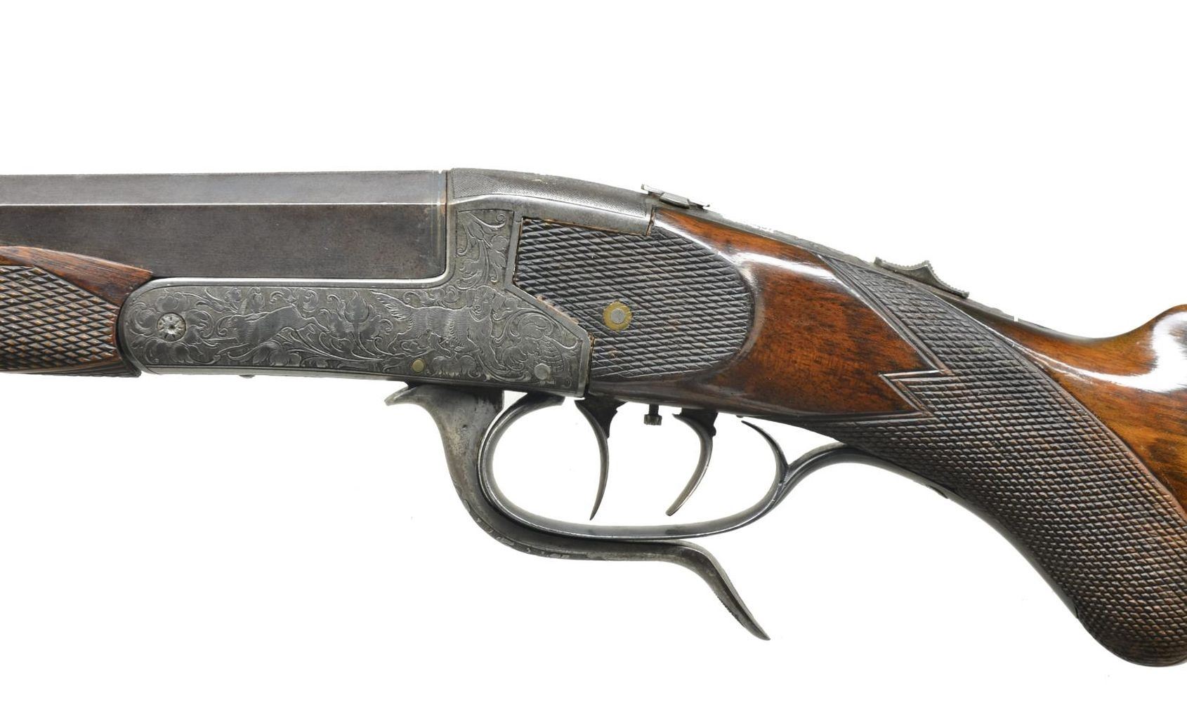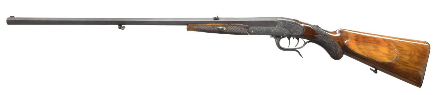 Cal. 9x72R. NSN. Bbl. 26" oct. w/ maker's name & address on matted top flat. Bbls. mounted w/ 1 standing 1 folding leaf rear sight & silver bead front. Rounded box lock underlever action features tang safety ("SAFE" in forward position). Folding flip up tang sight & dbl. set triggers. Action engraved w/ 80% coverage, sprays of shaded acanthus surrounding canine & game scenes on sides w/ setter pointing a departing rabbit on left & fox flushing a duck on right. Well streaked European walnut rnd. knob pistol grip buttstock measures 14" over steel buttplate & features sm. right hand cheekpiece & point pattern checkering. Matching sm. schnabel forend attaches w/ side bolt through oval German silver escutcheons. CONDITION: bbl. retaining some original blue, action mostly silver gray, stocks w/ nearly all old refinish & checkering recut. Bore is fair to good, dark rifling throughout. Missing chip 1 1/2 x 1/4" at right rear of forearm. Action is tight. Set triggers do work. DANGER: firing mechanism is often slip-hammered & fires upon closing bbl.; this should be put right before use. (21-650/MGM). CURIO. $200-400.