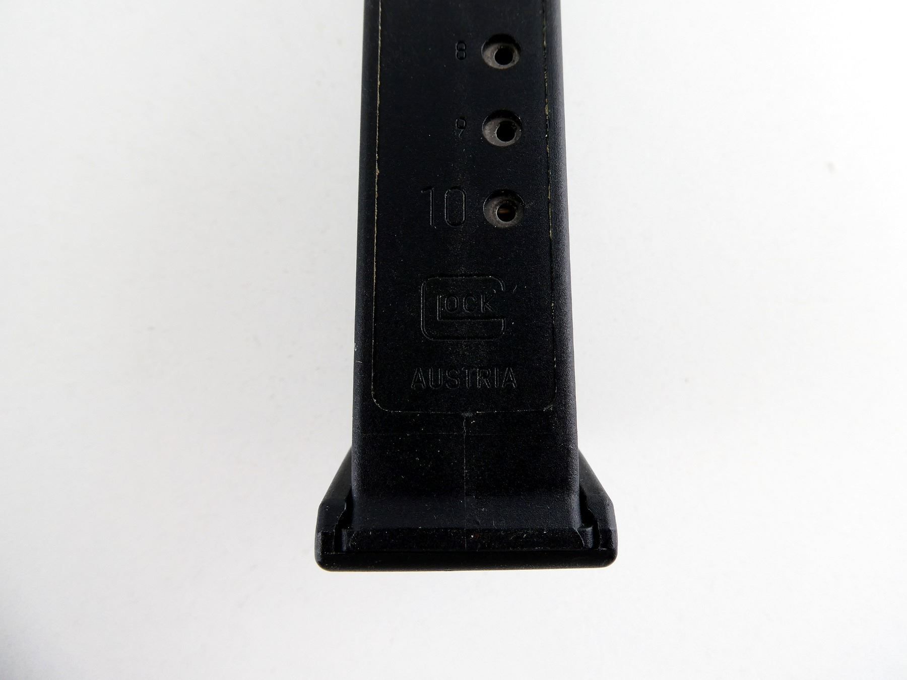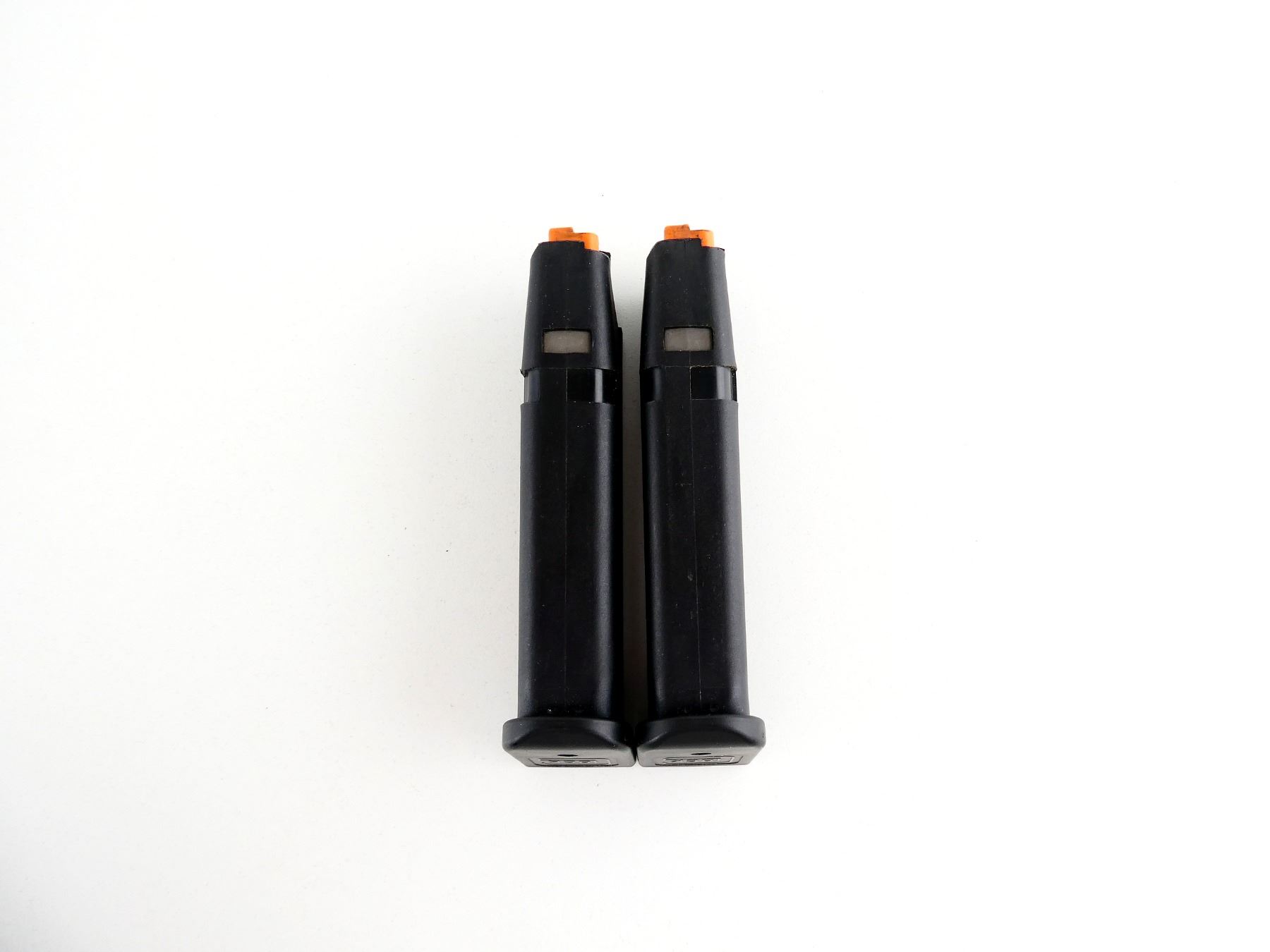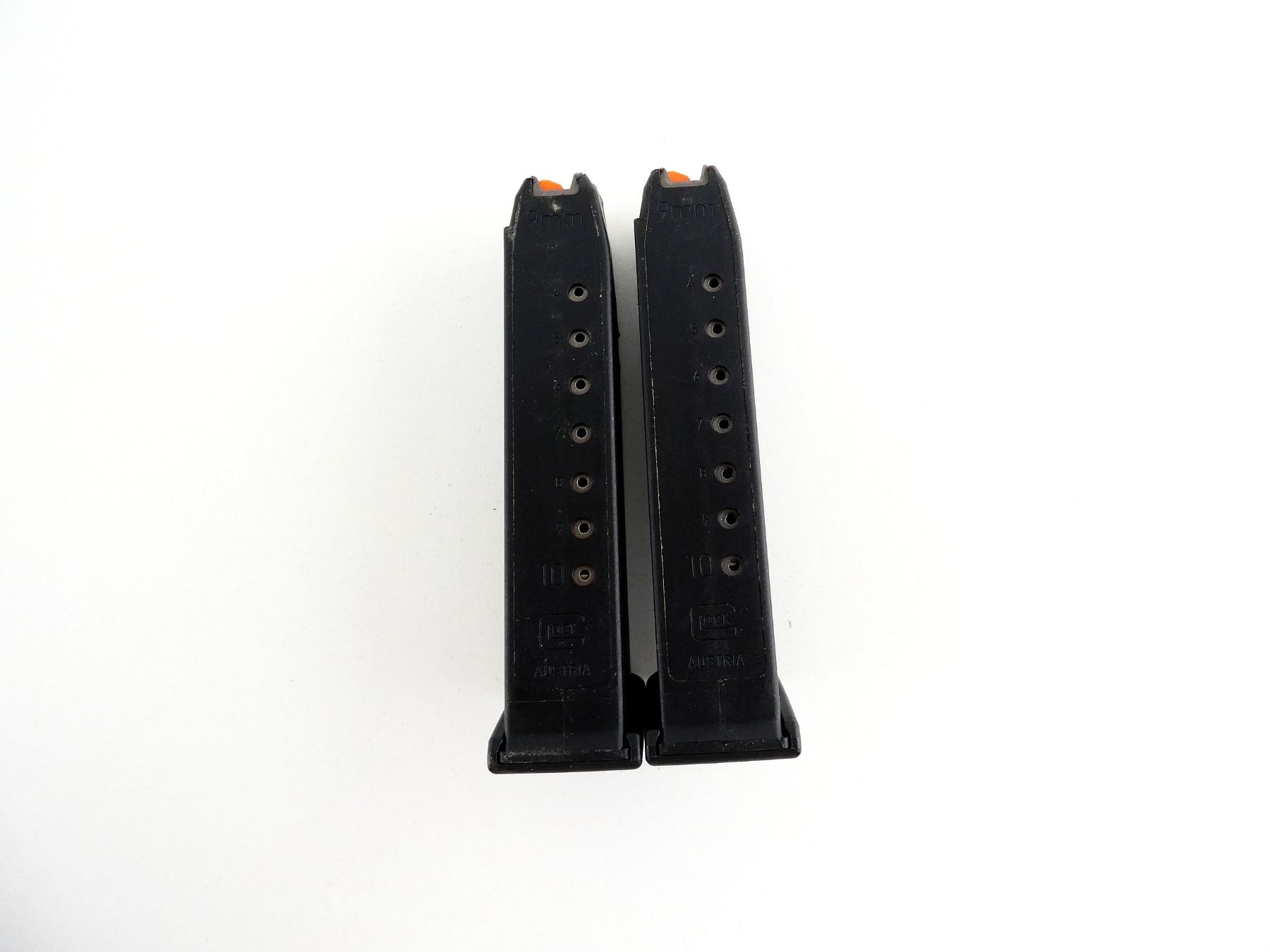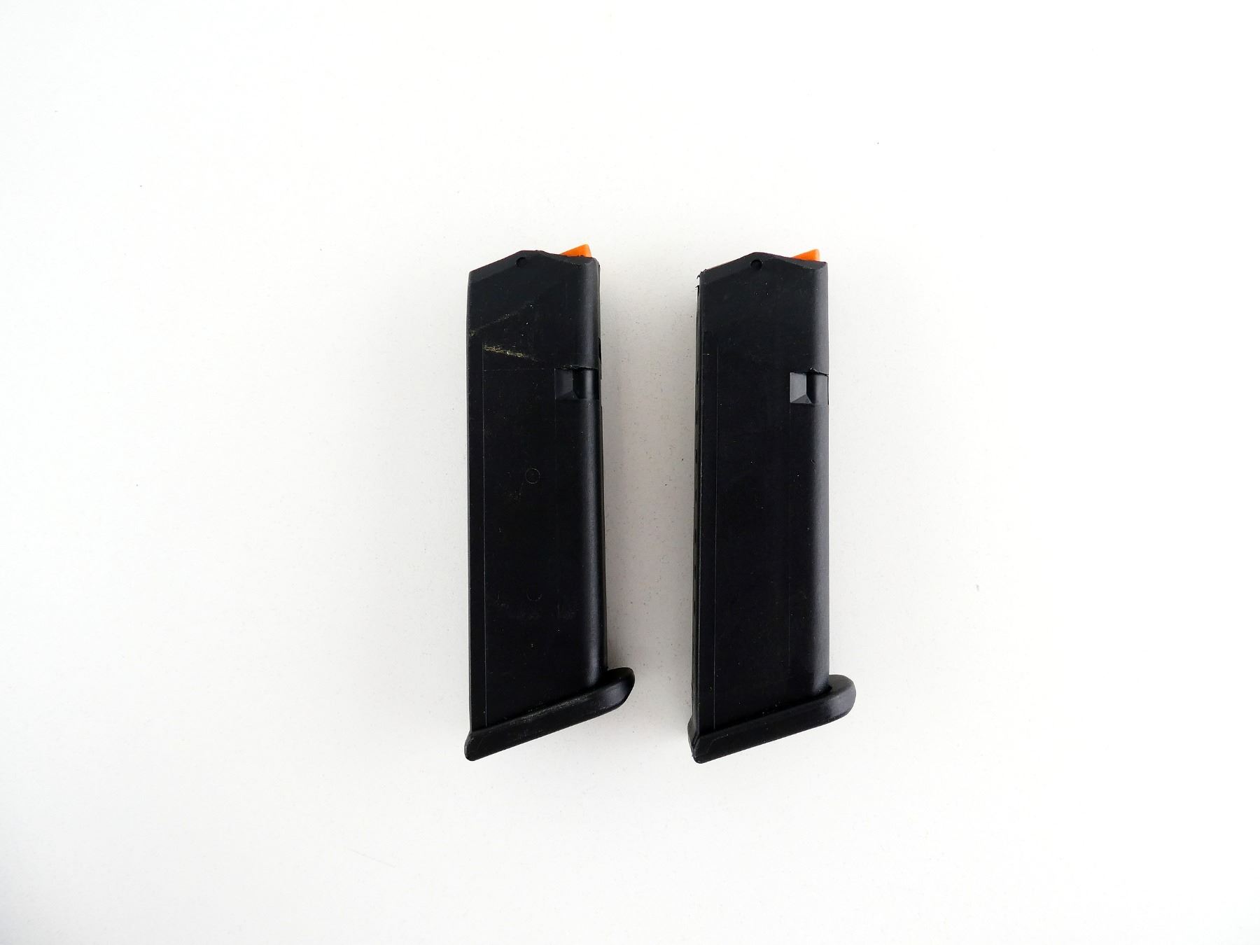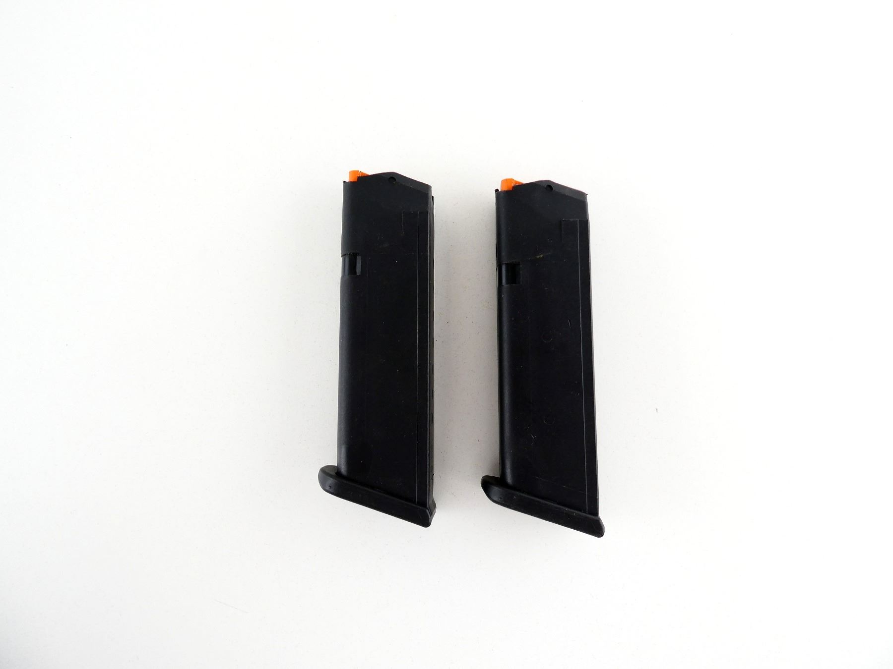 (1) 9MM LUGER MAG, 10 RNDS, BLACK POLYMER CONSTRUCTION WITH ORANGE POLYMER FOLLOWER, MARKED: "GLOCK", "9MM", ETC. SEE PHOTOS. PAL REQUIRED.