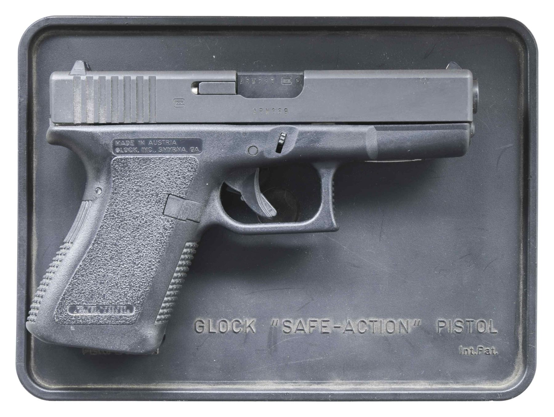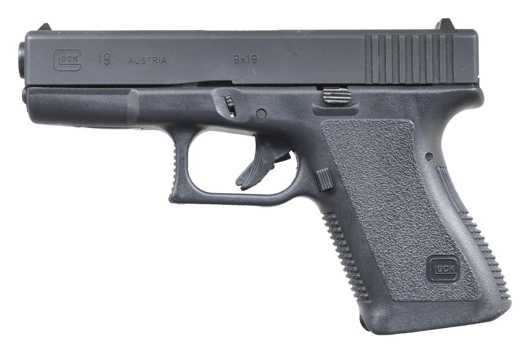 Cal. 9mm Luger. S# ARW389US. Bbl. 4.01" with hexagonal rifling. Mfg. as reduced sized Model 17 for compact carry and often used by law enforcement for that very purpose. Factory 5 pound trigger and white sight set (dot front, notch rear). Checkered grip straps and front of hooked trigger guard; no accessory rail on dust cover. MAGS: NONE; readily available by Glock and aftermarket suppliers. UNATTACHED ACCESSORIES: original factory black plastic "Tupperware" case with packaging. CONDITION: all aspects near excellent including bore. (25-3681/NW). MODERN. $300-450.
