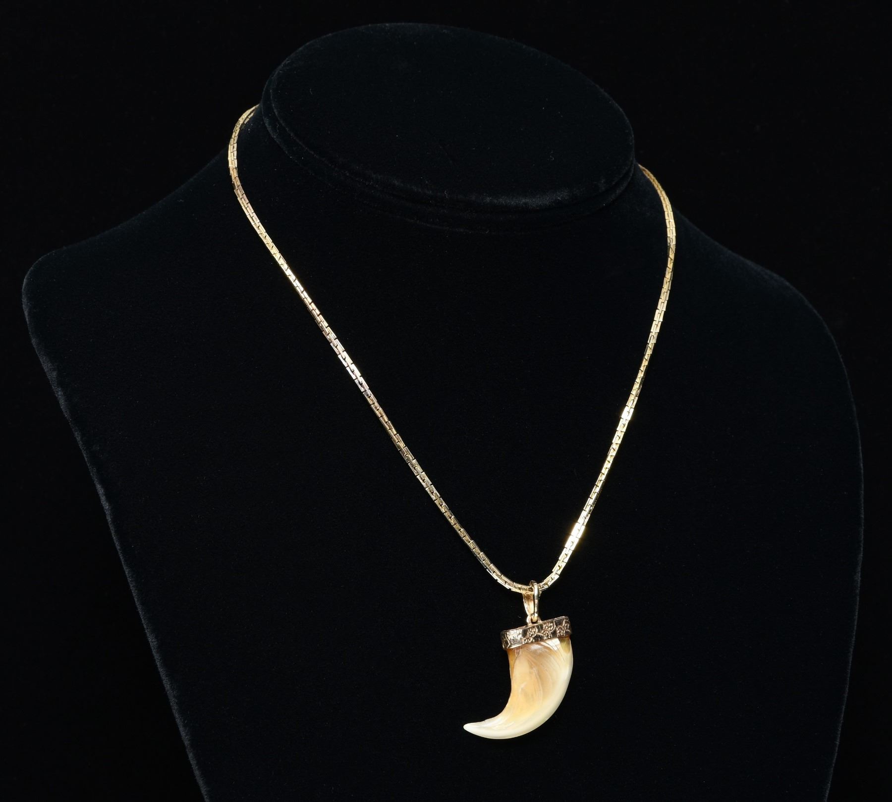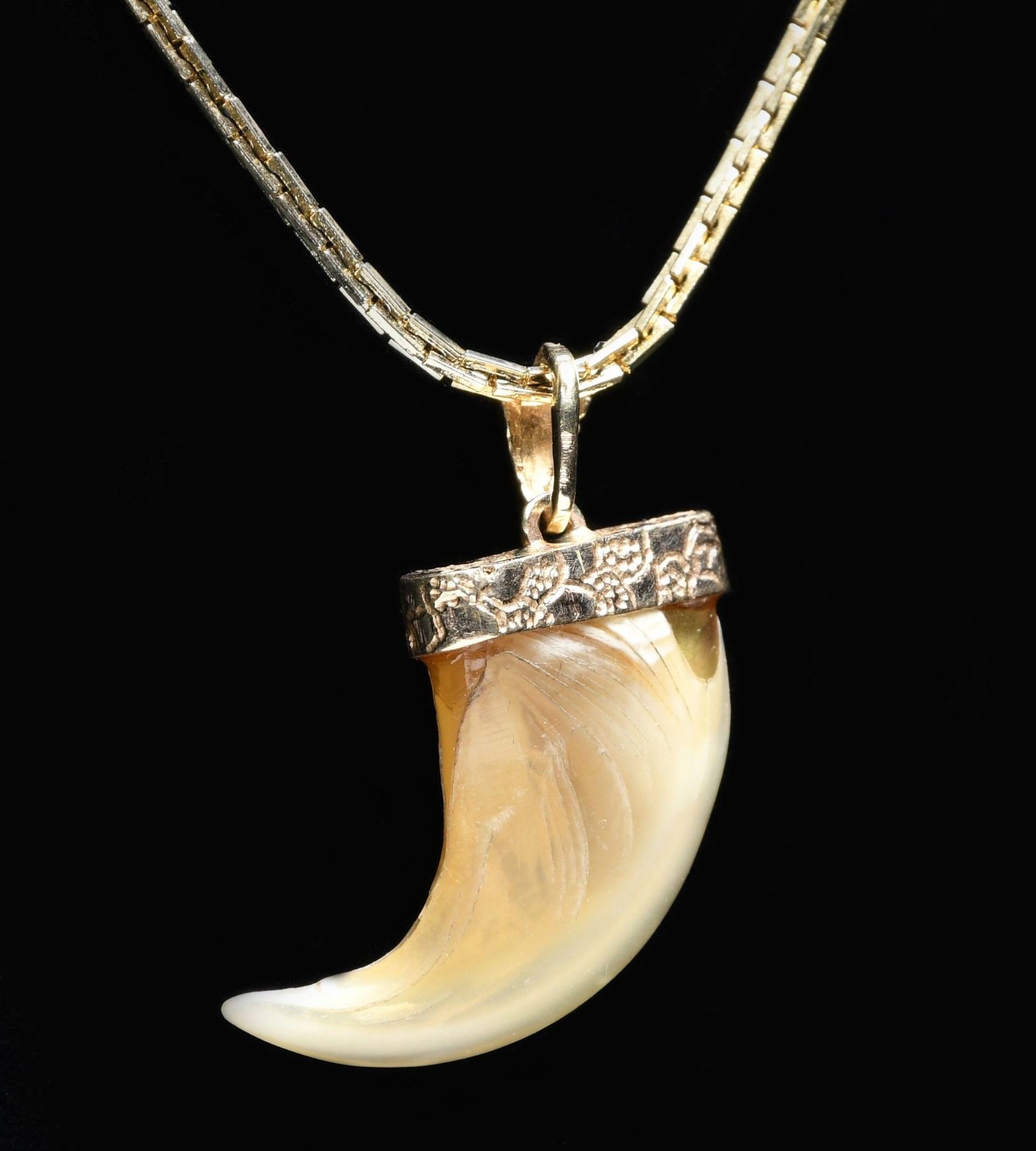 A 16" gold chain of interlocking square links that tests at 9-10 karats and weighs approx. 4.7 grams. The pendant is approx. 1" long and has a gold cap with a loop that attaches it to the chain. It is not possible to weigh the pendant without removing the tooth. CONDITION: light wear. PROVENANCE: from the renowned collection of quality sporting arms from Lewis Drake together with inventory of Lewis Drake Associates. (02-23573-7/BF). $200-300.