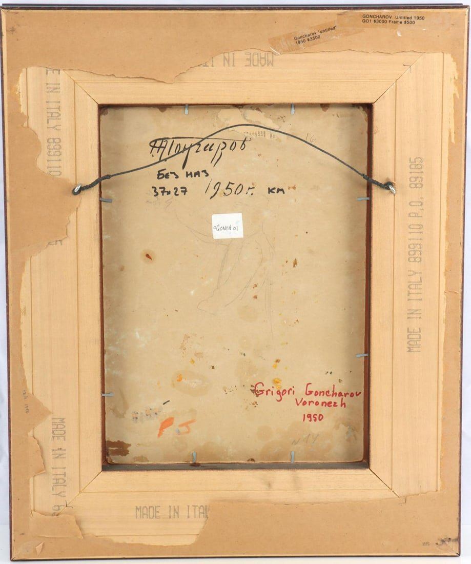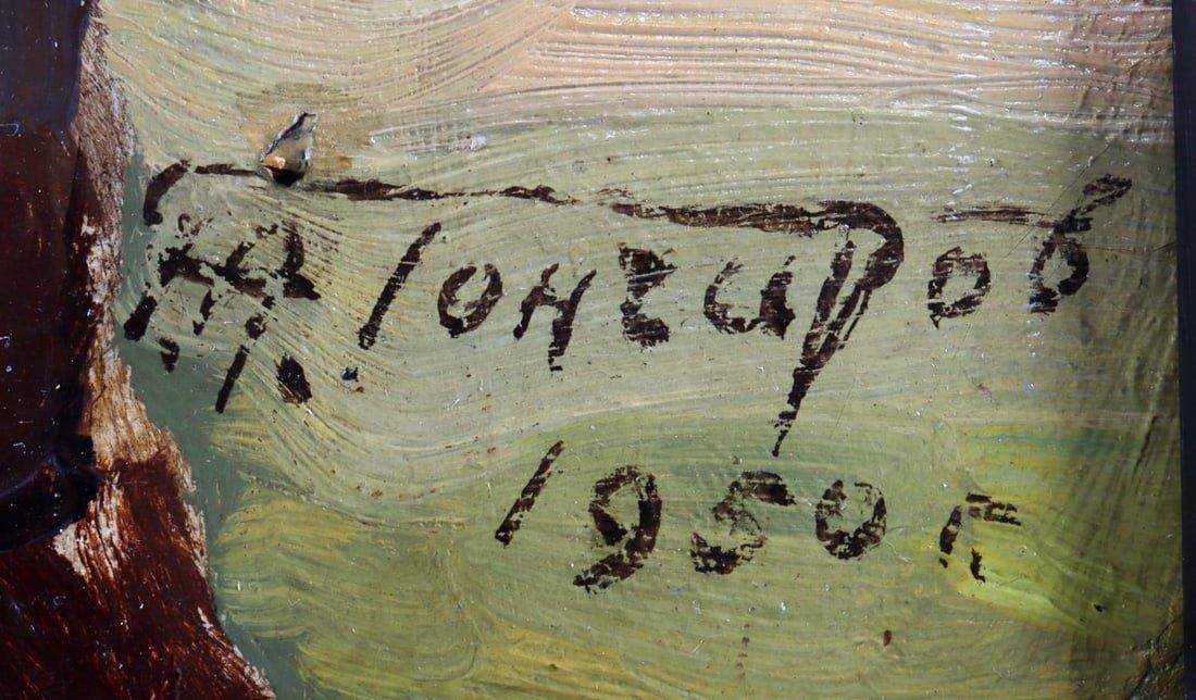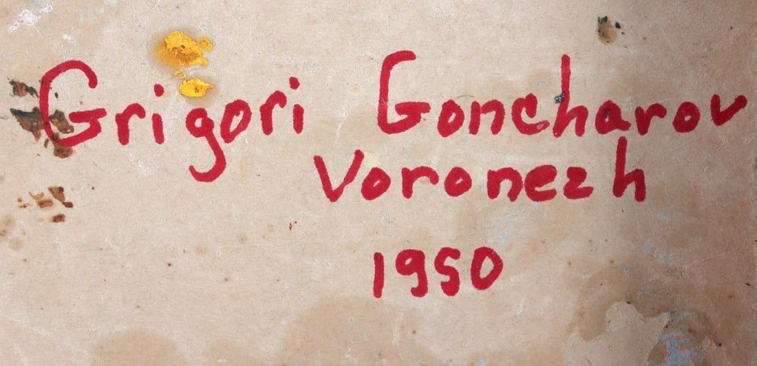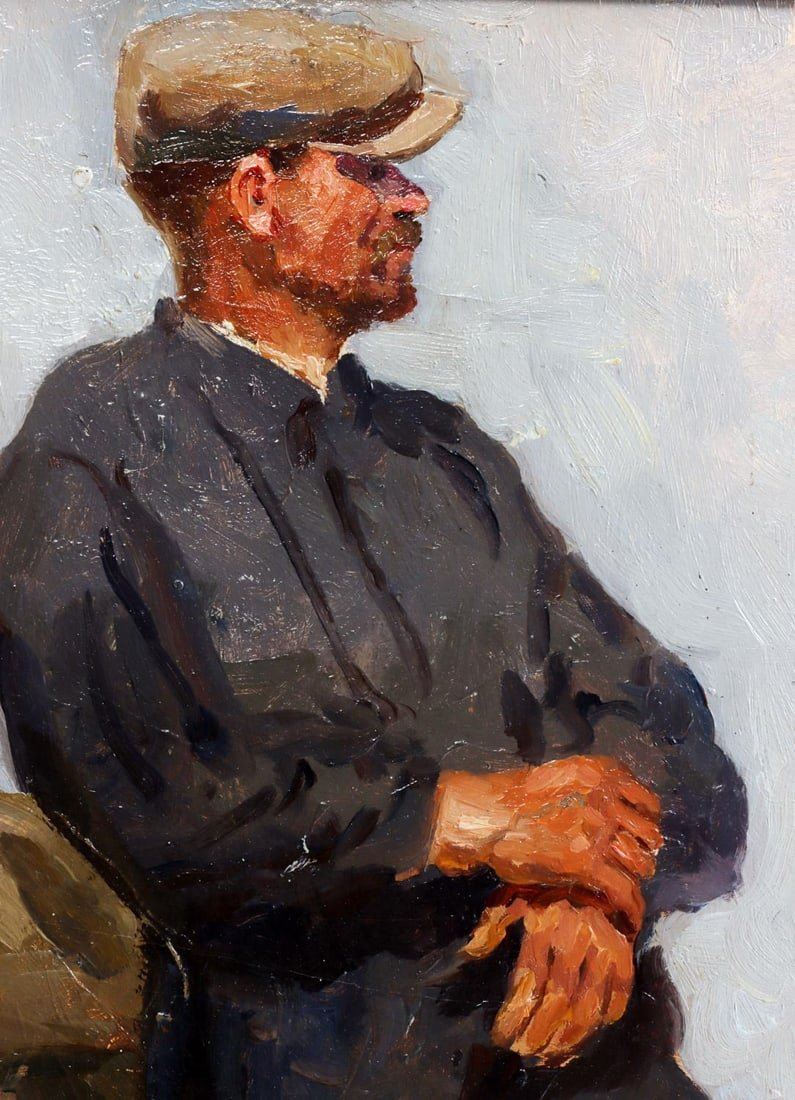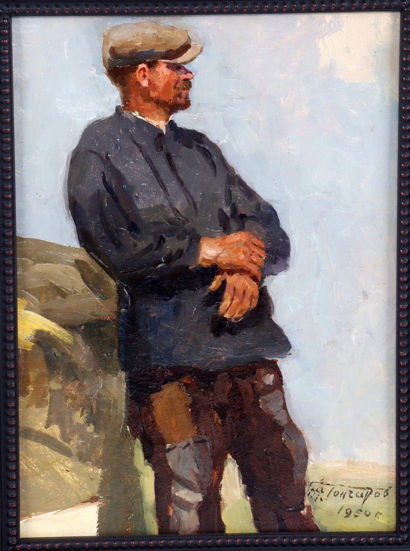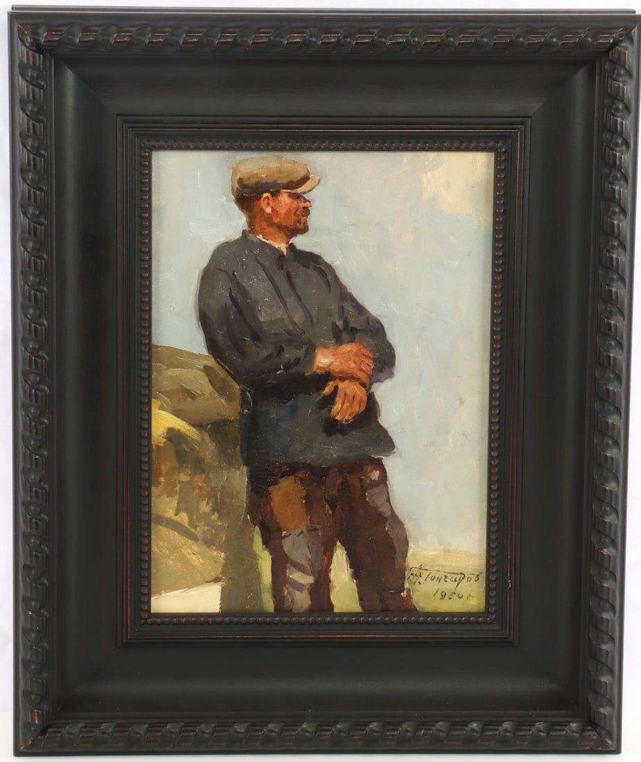 Grigory Andreyevich Goncharov (Russian Federation, 1913-2001) oil on board portrait titled "Man in Cap". Signed in cyrillic lower right and dated 1950. Housed in a contemporary wood frame. Condition: very good. Dimensions: approx 22 x 18 inches. Provenance: Studio B Gallery Henderson, NC. This lot has a reserve.