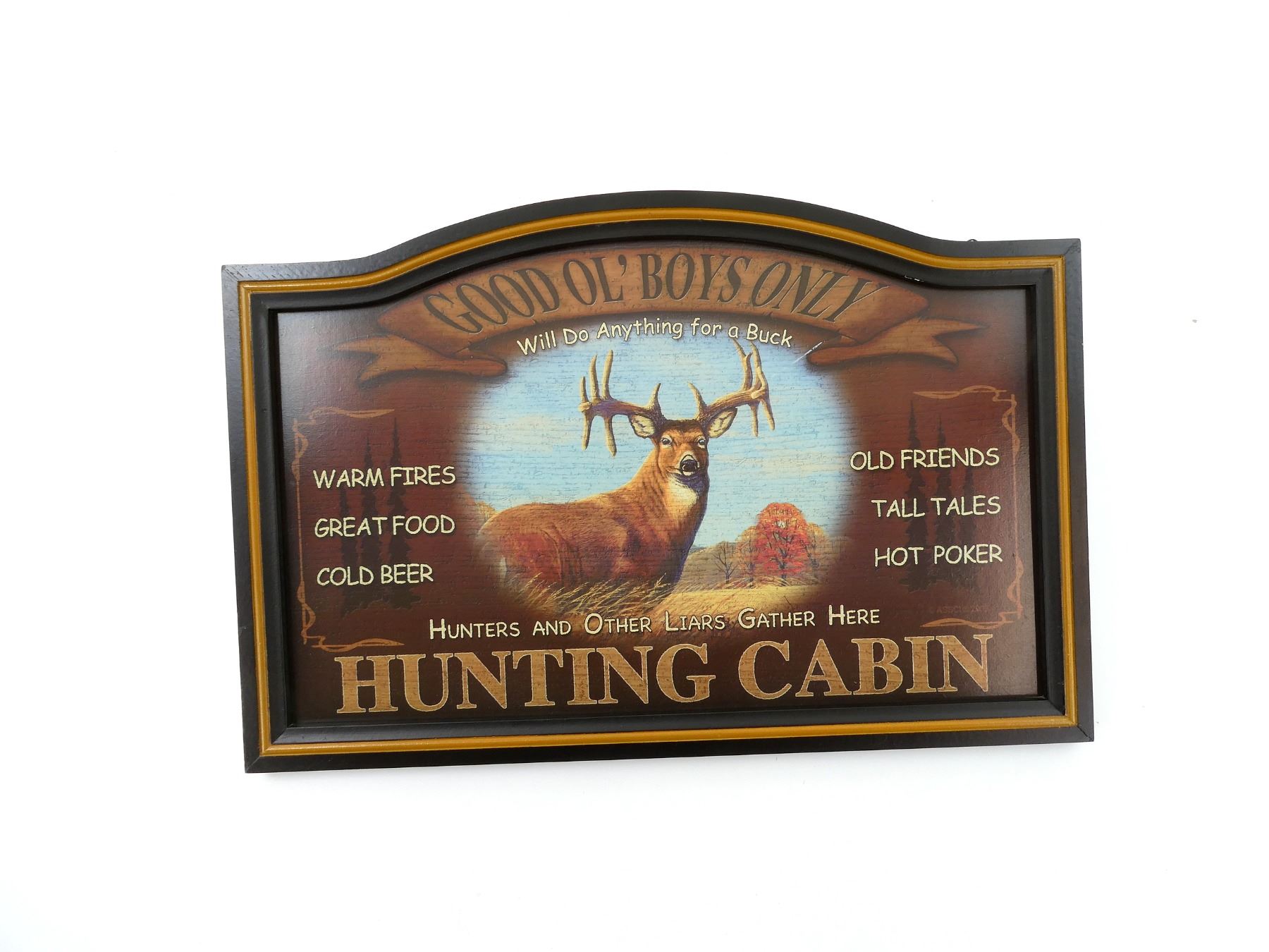 (1) WOOD "GOOD OL' BOYS ONLY, HUNTING CABIN" SIGN BY AMERICAN SPORTSMAN COMPANY INC., APPROX. 23.75" X 15.75". SEE PHOTOS.