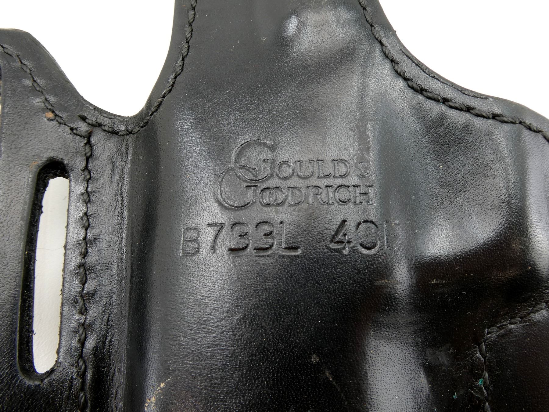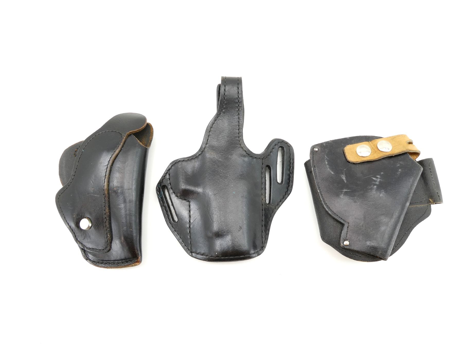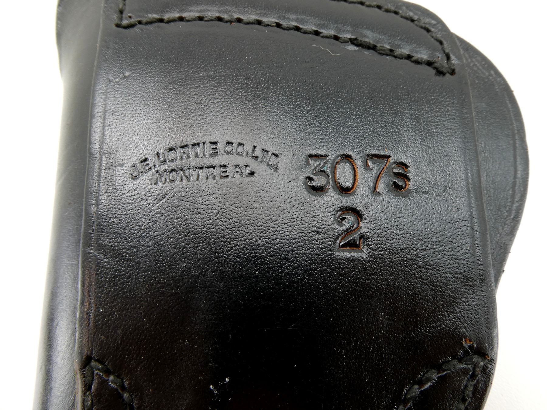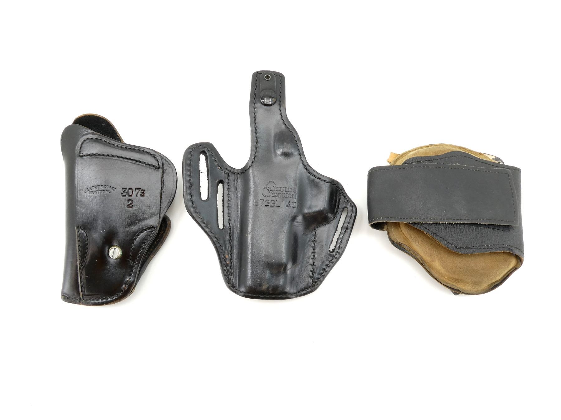 LOT INCLUDES; (1) GOULD & GOODRICH BLACK LEATHER HOLSTER, MARKED "B733L 40F", ETC., FITS RH, OVERALL LENGTH APPROX. 8.25", (1) J.E. LORTIE CO. LTD. BLACK LEATHER HOLSTER, MARKED "307S 2", ETC., FITS RH, OVERALL LENGTH APPROX. 6.75" & (1) UNKNOWN POSSIBLY ANKLE BLACK LEATHER HOLSTER, UNMARKED, FITS RH, OVERALL LENGTH APPROX. 5.5". SEE PHOTOS.