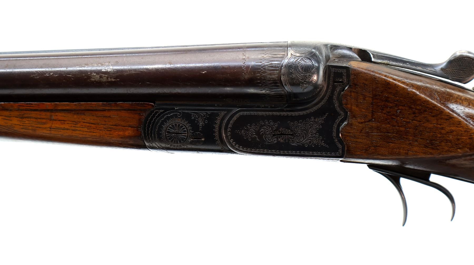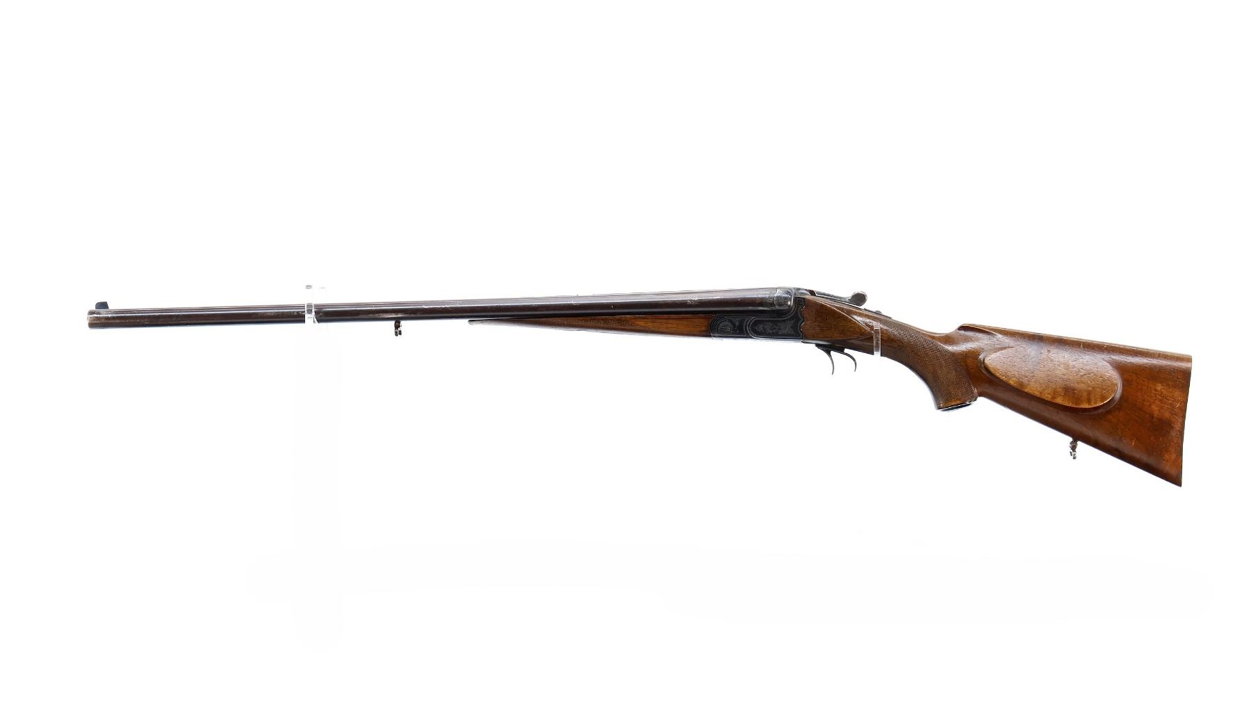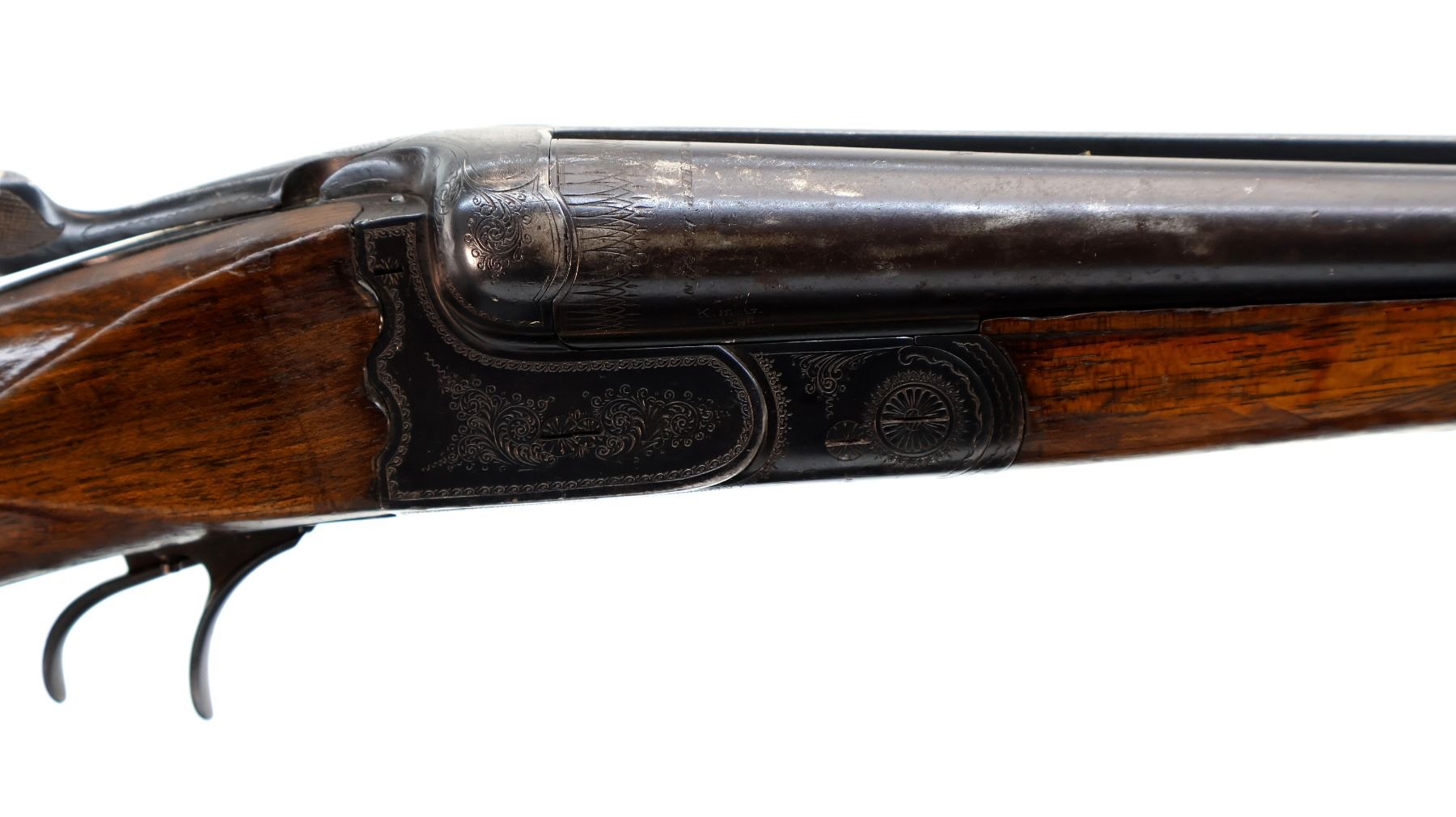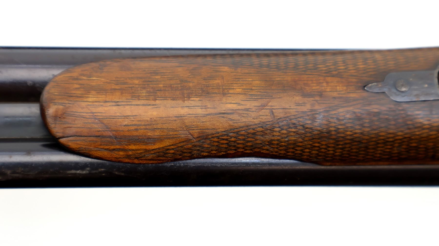 Main Description: Blade front sight, missing rear sight, dovetail present, blued finish, barrels slightly loose on face, engraved receiver, automatic safety, cocking indicators, extractor, double triggers. Missing trigger guard, butt plate and screws. Two piece wood stocks, checkered forearm which is chipped, checkered pistol grip chipped and cracked behind receiver, European cheek rest, 13.5" LOP, grip cap, sling swivels.