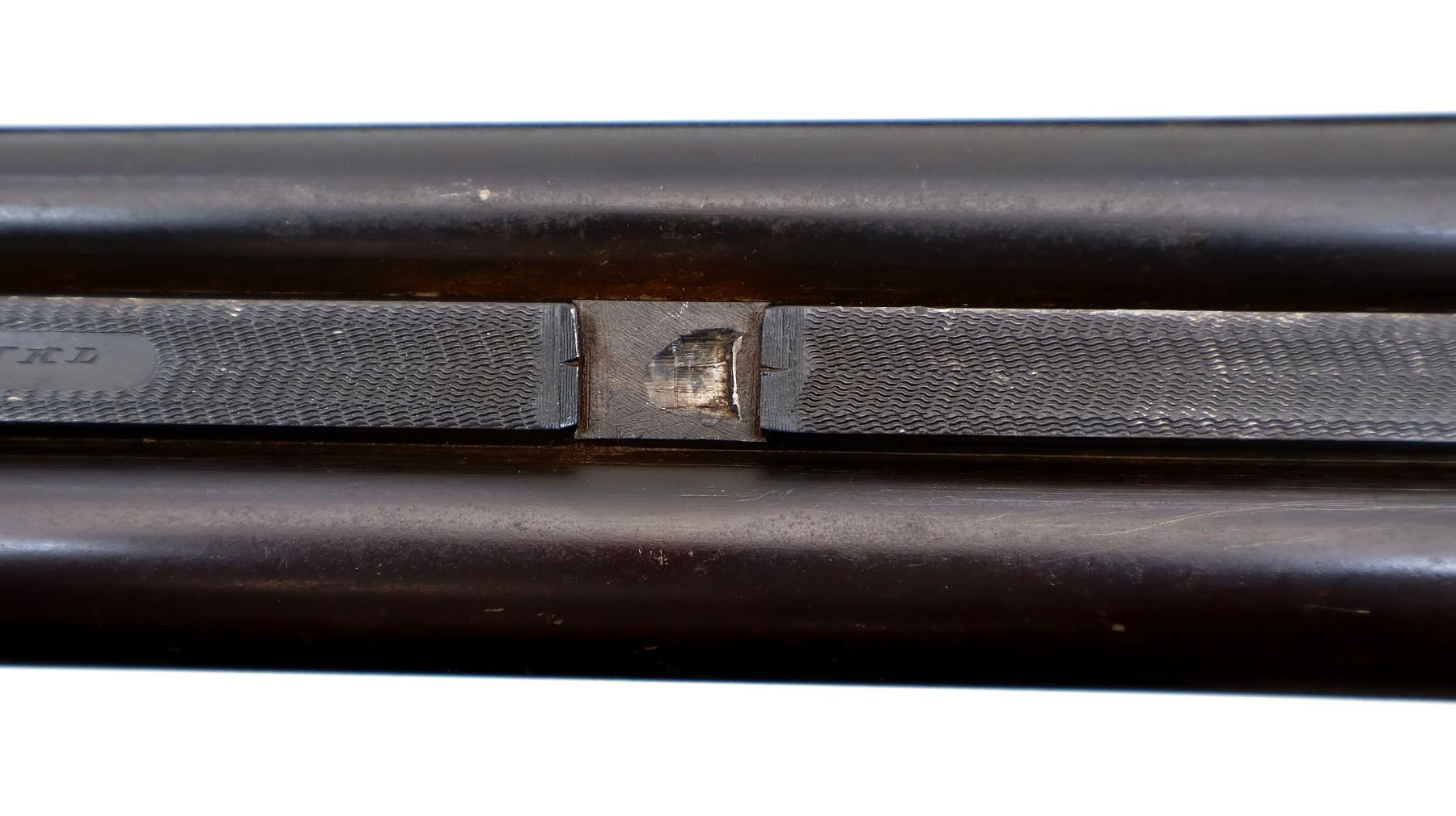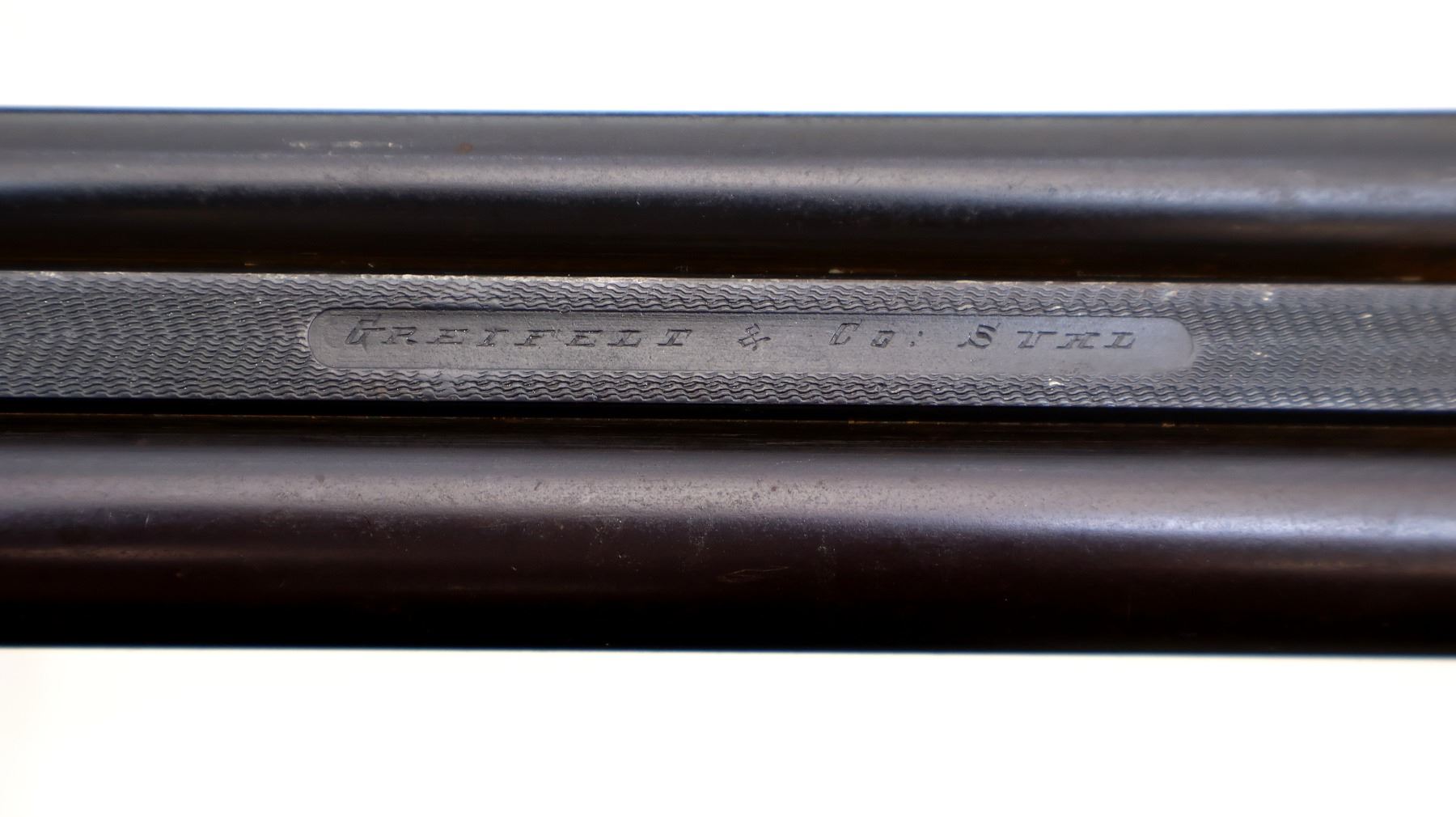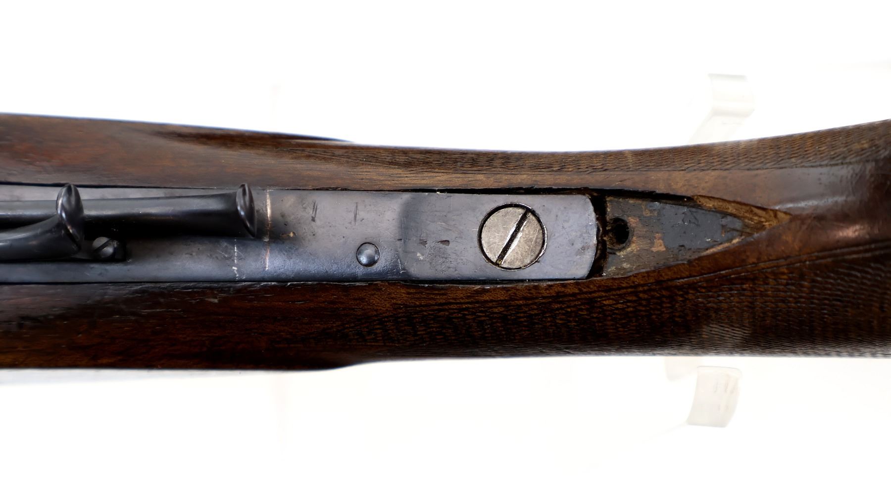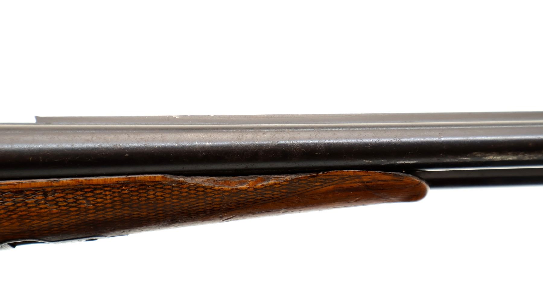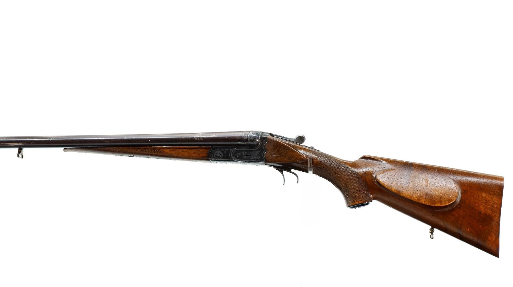 Main Description: Blade front sight, missing rear sight, dovetail present, blued finish, barrels slightly loose on face, engraved receiver, automatic safety, cocking indicators, extractor, double triggers. Missing trigger guard, butt plate and screws. Two piece wood stocks, checkered forearm which is chipped, checkered pistol grip chipped and cracked behind receiver, European cheek rest, 13.5" LOP, grip cap, sling swivels.