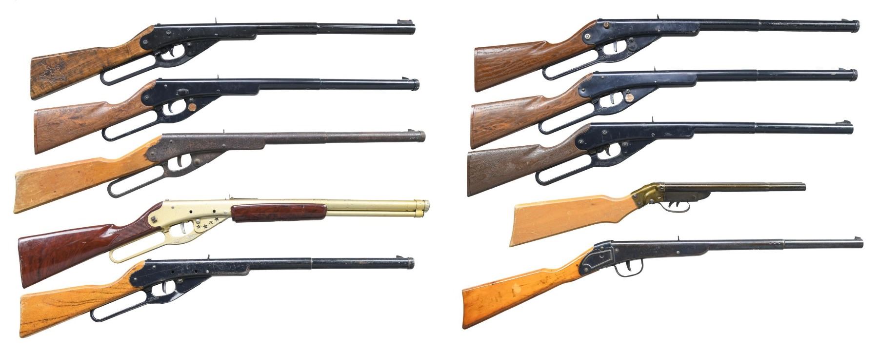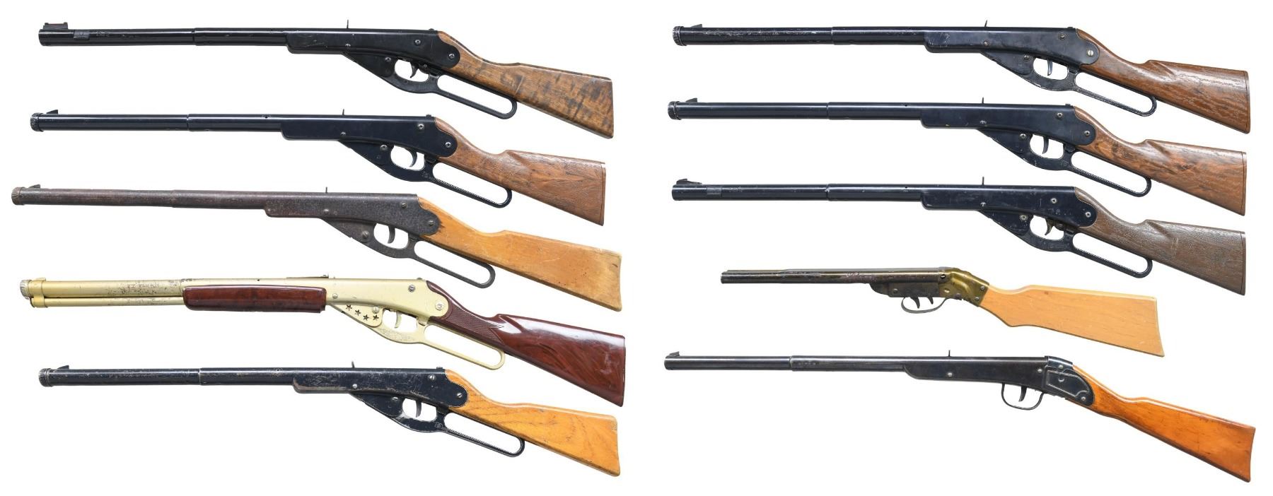Guns 1-9 all; Cal. BB. (1). Number 100 Model 38, break open single shot. Breaks forward of stock to cock. Sheet metal construction, blue finish, Hardwood stock. Mfg. 1938-41 & 1948-52. CONDITION: over 70% fading blue. Wood shows handling marks & wear spots. Action has strong compression. (2). Model 105 B, lever action repeater. 400 shot capacity at 275 FPS. Black painted sheet metal construction w/ plastic lever. Loads on left side of bbl. Red fiber optic front sight. Right side of hardwood stock is marked "BUCK" below a carved whitetail deer portrait. 1980's mfg. CONDITION: 90% paint, wood shows handling marks. Action has good compression. (3). Model No 1201 lever action repeater. Sheet metal construction w/ gold finish. Loading tube inserts into bbl. Wood grained plastic stocks. Mfg. 1976-77. CONDITION: 75% gold finish showing scratches. Stocks show handling marks. Action has compression. (4). Model 102 Cub, lever action 350 shot repeater. Black painted sheet metal construction Hardwood stock. Loading port is on the bbl. Mfg. 1952-1978. CONDITON: 50% metal finish showing scratches & wear. Stock show handling marks w/ chips at around butt. Action has compression. (5). Model 1105 lever action 500 shot repeater. Black finished sheet metal construction. Wood grained plastic stock. Loading port on the bbl.bbl. Mfg. 1975-1979. CONDTION: over 95% finish. action has good compression. (6). No. 102 Model 36 lever action 500 shot repeater. Blued sheet metal construction. Hardwood stock. Loading port on bbl. Mfg. 1941-42 & 1945-47. CONDITON: metal shows general pitting & corrosion. Stock shows heavy wear & is loose on the frame. Action has strong compression. (7). Model 102 lever action 500 shot repeater. Pained sheet metal construction w/ aluminum lever. Wood grained plastic stock. Loading port on the bbl. CA. 1950. CONDITION: 80% painted finish. Stock shows handling marks. Action has compression. (8). Model 105 B lever action 400 shot repeater. Painted sheet metal construction w/ plastic lever. Wood grained hardwood stock. Loading port is on the left side of the bbl. 1980's mfg. CONDITION: 80% finish showing scratches & spots. Action has good compression. (9). Model 102 lever action 500 shot repeater. Painted sheet metal construction w/ aluminum lever. Wood grained plastic stock. Loading part is on top of bbl. Ca. 1950. CONDITION: over 80% showing scratches. Action has good compression. (10). Double barrel toy gun. Bronze finished sheet metal construction. Break open action. Double triggers. Hardwood stock. Overall length 22". CONDITION: 75% finsh having a sizable area of rust & pitting on the left side. Action has good compression. (02-24583-1/DS). NON GUN. $250-500.