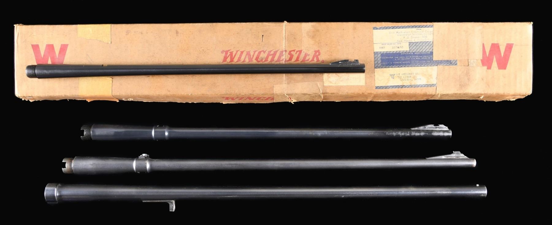 BARRELS. Lot consists of: (1.) Post-64 style Model 94 carbine bbl. 20" length with front sight ramp. Standard roll markings. Top of breech has encircled "P" parts proof and standard "WP" proof. UNATTACHED ACCESSORIES: original Winchester parts box, label is dated "12/15/63". CONDITION: as new and unused. (2.) Pre-64 Model 70 Westerner bbl. Cal. is .264 Winchester mag. Bbl. is shortened to 23 1/4" with reinstalled front sight ramp. CONDITION: 90% original blue showing scratches and spots of corrosion. Bore is generally bright with rifling erosion forward of the throat. (3.) Model 70 Pre-64 standard weight bbl. Cal. is .220 Swift. 26" stainless steel with blued iron plating. Bbl. retains its ramp mounted bead front sight and original folding leaf rear sight. Bottom of bbl. shows a date of "50". CONDITION: over 80% blue showing muzzle wear with spots of corrosion. Bore is bright with lightly worn rifling. (4.) Model 50 shotgun bbl. 28" plain with fixed Mod. choke and steel bead. CONDITION: 70% blue showing areas of light fading with gun rack wear spots. Bore is generally bright with evidence of a shallow ring bulge approx. 6" from the muzzle. Ideal bbl. to cut to riot gun length. (02-24462-5/DS). $250-400.