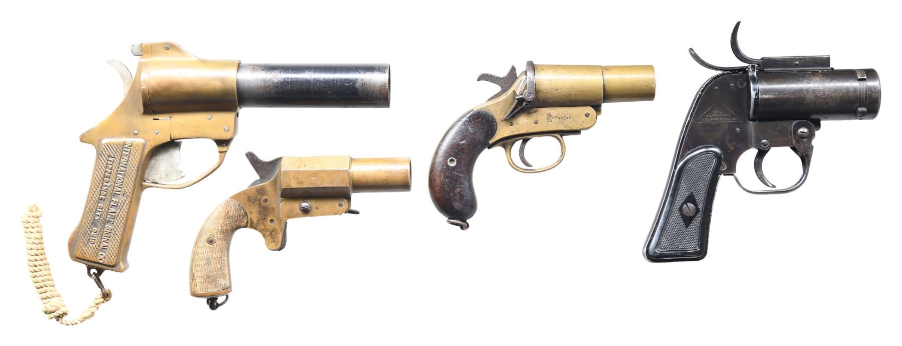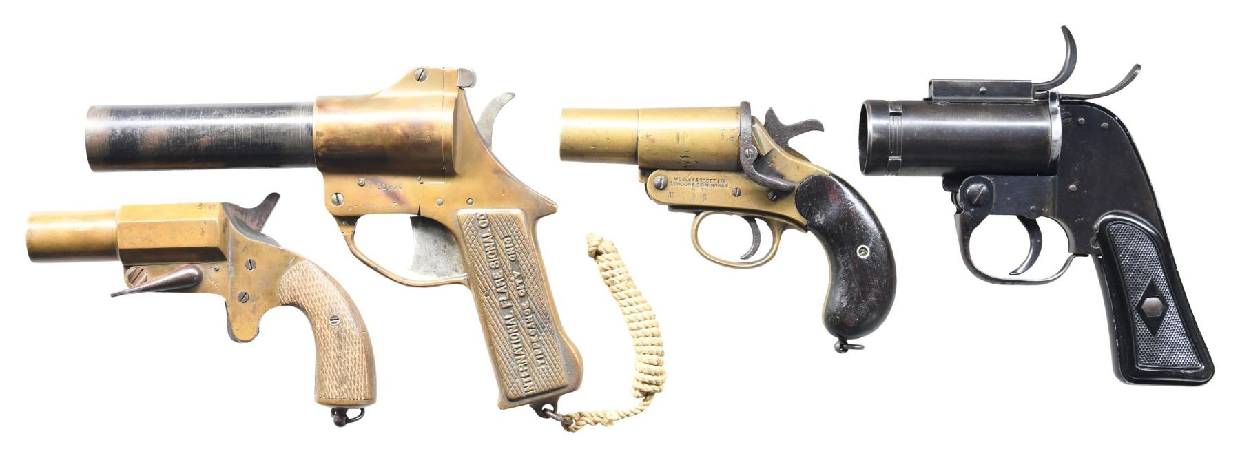 No.1: US WWII M8 Flare Pistol. Cal. 37mm. S# E-060044. Bbl. 4 1/8" smooth bore. Pistol was used by the United States Army Air Force during WWII & later the Air Force until 2002. Single shot break-open design. Marked on right side of frame in triangle "CEC / V / 1942 / US PROPERTY / PISTOL PYROTECHNIC M-8". Blued steel construction except black plastic checkered grips. CONDITION: grips have light wear & handling marks. Left grip has repaired crack. Metal retains 60% original worn thinning blue. Notable area of oxidation on right side of bbl. No.2: US WWII International Flare Signal Co. Pistol. Cal. 37mm smooth bore. S# 21950. Bbl. 8 1/8". This break-open single shot pistol is of brass construction w/ a steel bbl. Grips are marked on both sides "INTERNATIONAL FLARE SIGNAL COMPANY / TIPPECANOE CITY OHIO". Frame is marked on left side "PT NOV '43". Lanyard ring on butt & original cotton lanyard is present. CONDITION: brass has turned a pleasing patina w/ areas of dark staining. Steel bbl. retains 50% of its original blue-black finish. No.3: Webley & Scott Flare Pistol. Cal. 25mm smooth bore. S# 48399. Numbers match on frame & extractor. Bbl. 4 1/8". Pistol is of brass construction w/ wooden grips. Marked on left side of frame "WEBLEY & SCOTT LTD / LONDON & BIRMINGHAM". Marked on right side of frame "Webley winged bullet logo". Pistol also has numerous view marks. Walnut bird's head grips. Lanyard ring in butt. CONDITION: grips have moderate wear & handling marks throughout. Well-worn brass parts are turned patina w/ numerous handling marks. Steel parts are turned patina w/ notable oxidation. No.4: Very Flare Pistol. Cal. 25mm. S# 1540. Matching numbers on frame & opening lever. Bbl. 4 1/8" smooth bore. Single shot break-open design. Brass construction. Frame marking on the left side appears to be "G.G & C?". Butt is marked "80.F. / 125TH.". Checkered wooden grips appear to be replacements. CONDITION: grips have wear, staining & handling marks. Metal has extensive wear & handling marks. Has turned a dark patina w/ areas of darker staining. (02-24534/RW). NON-GUN. $400-600.