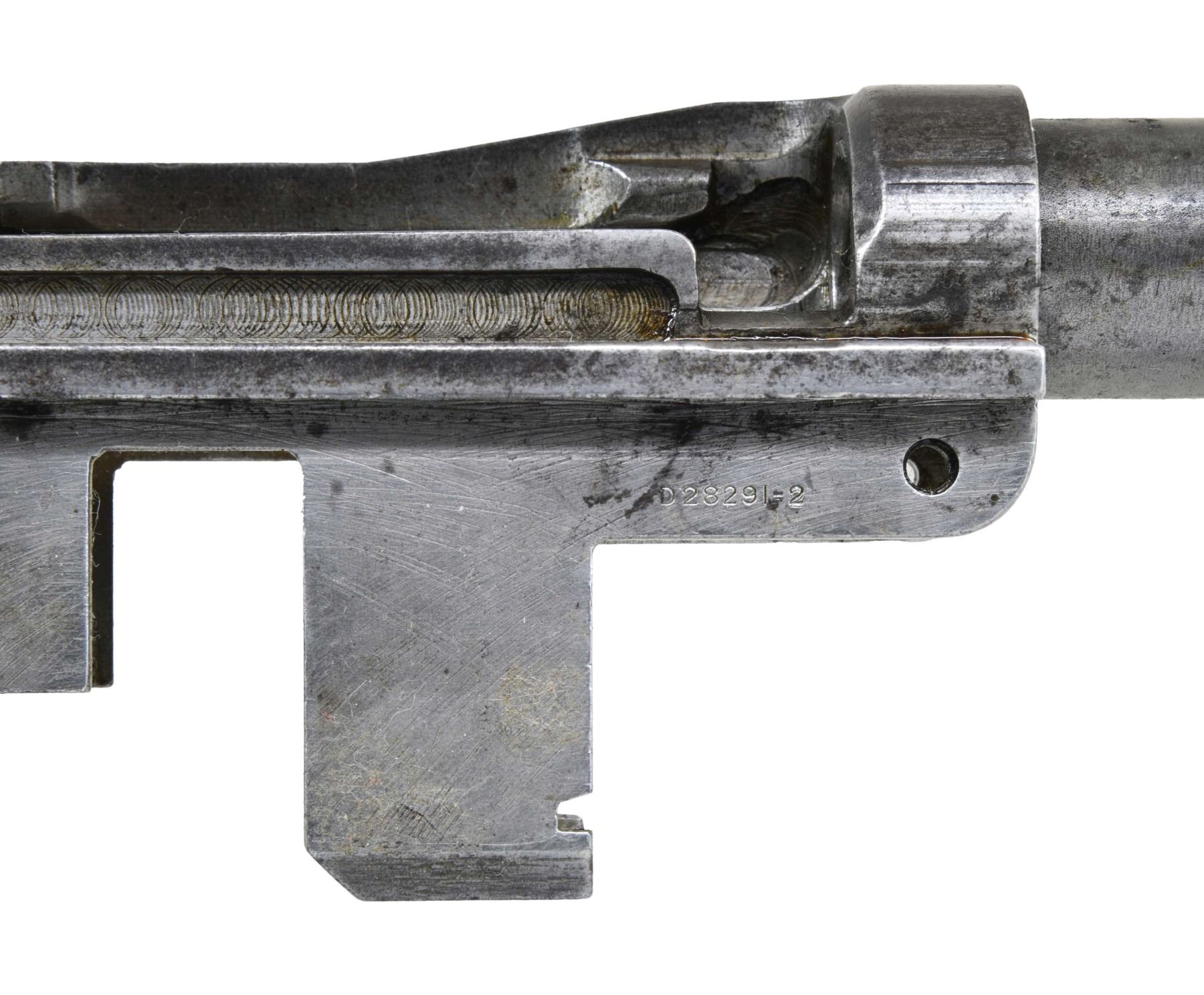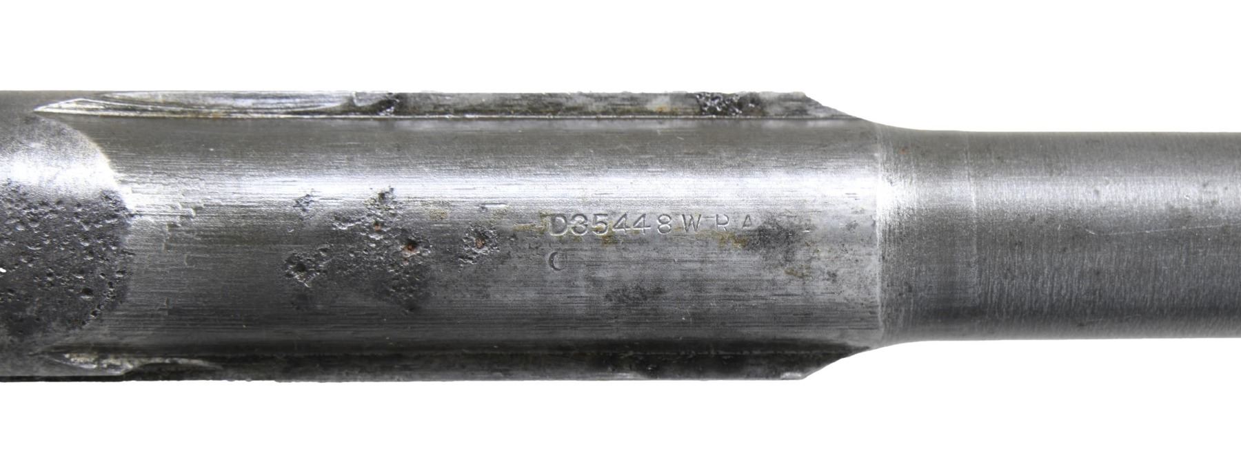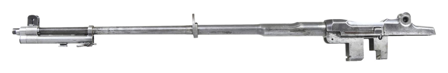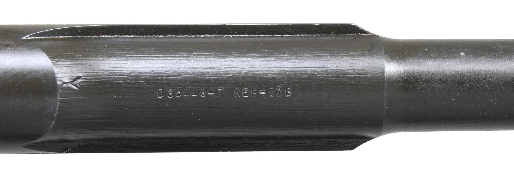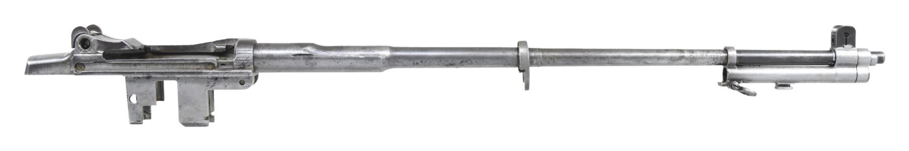 BARRELED RECEIVERS. No.1: Cal. 30-06. S# 2536106. Bbl. 24". Throat gauges: 4.0. Muzzle gauges: 6.0. Bbl. marked on the right side w/ "WP" proof & import marks. Marked on top "D35448-WRA". Receiver includes rear sight base, sight cover & clip latch. Lower band, gas cyl., stacking swivel, gas cyl. lock, lock screw & front sight included w/ bbl. CONDITION: metal is very worn turning overall gray & has numerous areas of pitting notably on top of bbl. over chamber. Fair worn bore. (25-2922/RW). No.2: Cal. 30-06. S# 298882. Bbl. 24". Stripped bbl. Bbl. is marked on right side w/ an inverted "S-A 8-41" & British export proofs & drawing number on top. Throat gauges: 1.0. Muzzle gauges: 1.0. Receiver produced mid 1941. All major parts markings appear to be "SA". Parts included are complete bolt, complete T105E1 rear sight, trigger group assembly including milled trigger guard, clip latch, follower & operating rod catch. CONDITION: receiver retains approx. 50% of its original finish w/ thinning & wear. Bore has lightly frosting in the grooves w/ strong lands. (25-2932/RW). BOTH MODERNS. $500-700.
