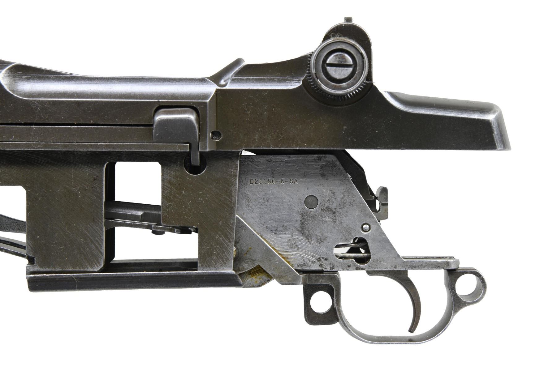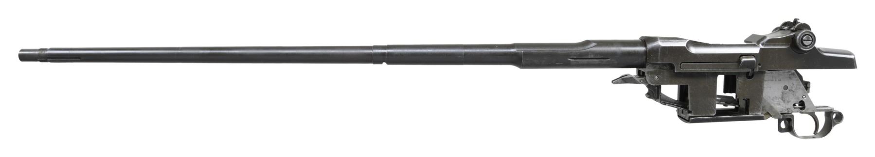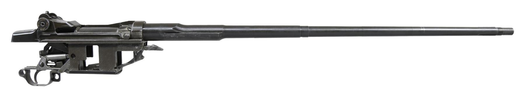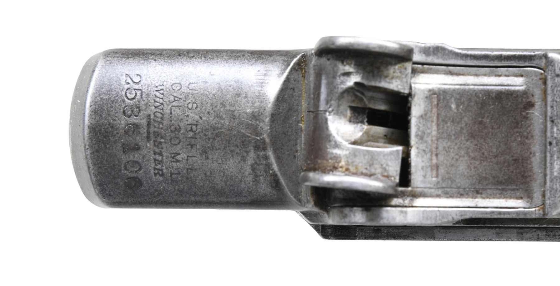 BARRELED RECEIVERS. No.1: Cal. 30-06. S# 2536106. Bbl. 24". Throat gauges: 4.0. Muzzle gauges: 6.0. Bbl. marked on the right side w/ "WP" proof & import marks. Marked on top "D35448-WRA". Receiver includes rear sight base, sight cover & clip latch. Lower band, gas cyl., stacking swivel, gas cyl. lock, lock screw & front sight included w/ bbl. CONDITION: metal is very worn turning overall gray & has numerous areas of pitting notably on top of bbl. over chamber. Fair worn bore. (25-2922/RW). No.2: Cal. 30-06. S# 298882. Bbl. 24". Stripped bbl. Bbl. is marked on right side w/ an inverted "S-A 8-41" & British export proofs & drawing number on top. Throat gauges: 1.0. Muzzle gauges: 1.0. Receiver produced mid 1941. All major parts markings appear to be "SA". Parts included are complete bolt, complete T105E1 rear sight, trigger group assembly including milled trigger guard, clip latch, follower & operating rod catch. CONDITION: receiver retains approx. 50% of its original finish w/ thinning & wear. Bore has lightly frosting in the grooves w/ strong lands. (25-2932/RW). BOTH MODERNS. $500-700.
