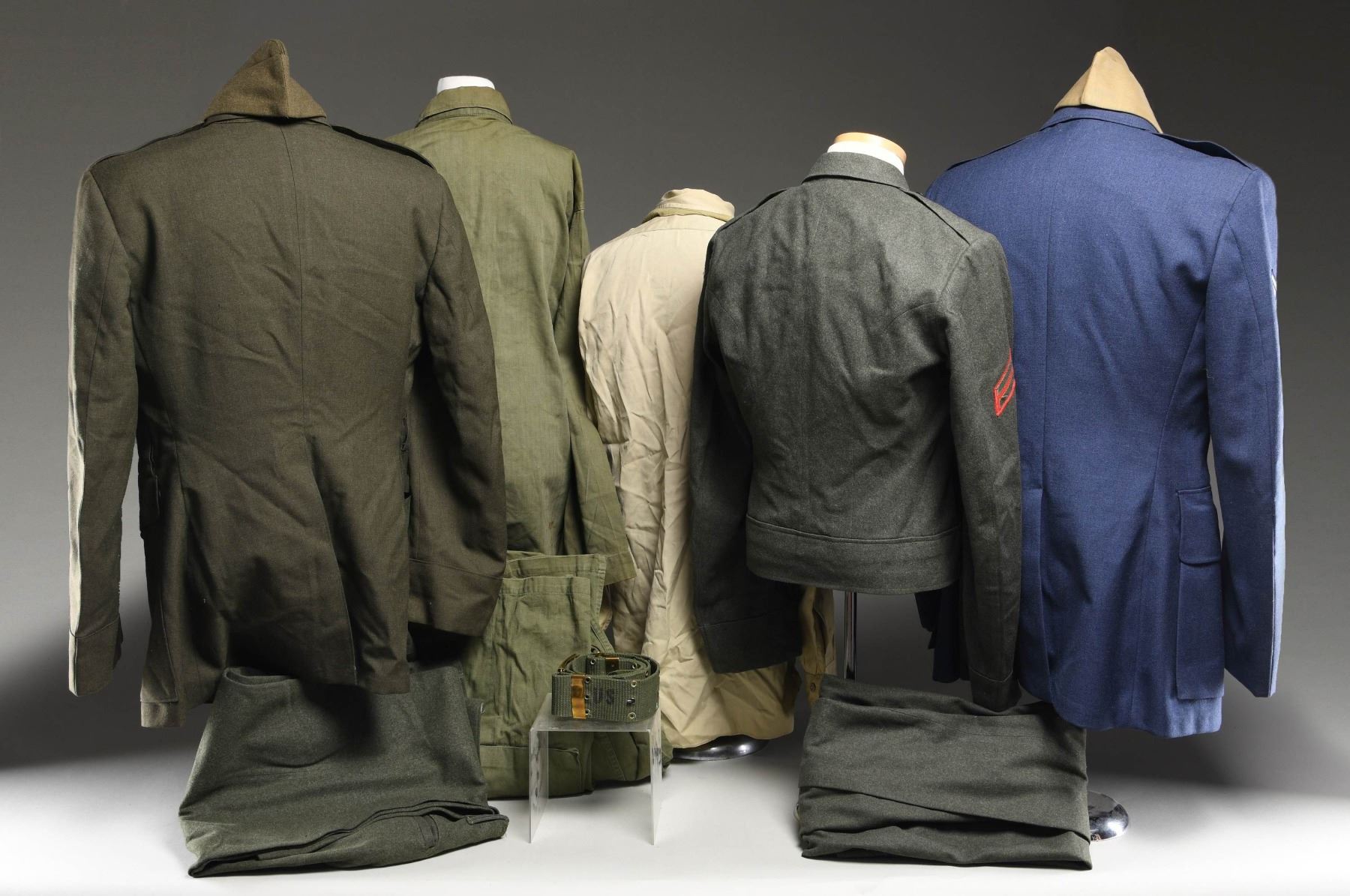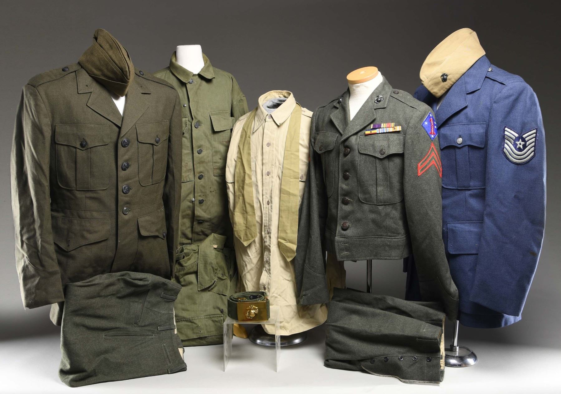 This group of uniforms consists of 1 / WWII uniform jacket for a corporal In the First Marine Division. Uniform has 5 ribbon bars including the Purple Heart. 1 / pair of matching pants for the perevious uniform. 1 / Green dress uniform with no insignia but all buttons are present. 1 / Green pair of pants for the previous uniform. 1 / Green overseas cap. 1 / Kahki shirt, tie and overseas cap. 1 / Vietnam era Drill Instructor duty belt & buckle. 2 / fatigue shirts with13 star buttons. 1 / Air Force dress tunic for a Master Sergeant. CONDITION: all items show light wear with no notable damage. (02-24040/BF). $300-500.