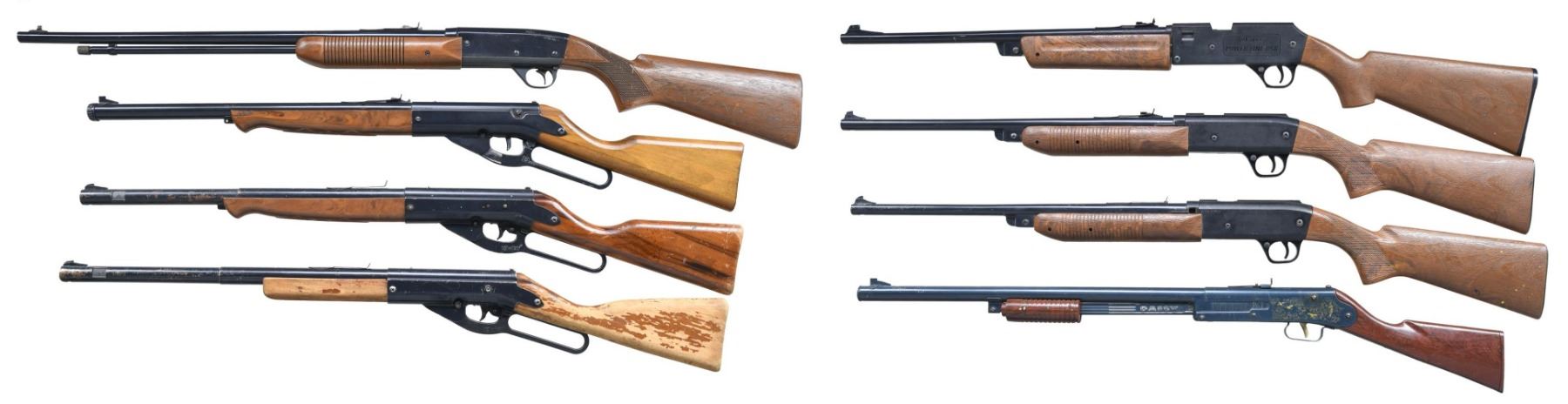 ALL: Cal. BB. (1.) Daisy Model 95 lever action repeater. 700 shot mag loading into bbl. Black painted finish. Wood grained plastic forearm W/ wood stock. Mfg. 1962-1976. CONDITON. over 95% finish showing wear on right side of lever. Action has good compression. (2.) Model 95B lever action 700 shot repeater. Wood grained plastic forend W/ wood stock. CONDITION: 70% showing wood & metal finish wear. Action has good compression. (3.) Model 95B lever action 700 shot repeater. Black finished metal. Hardwood forearm and stock. CONDITION: 70% metal finish showing scratches and wear spots. Stocks retain 25% blistering finish. Action has good compression. (4.) Model 840 pneumatic pump action 350 shot repeater with .175 bbs, loads through right side of action. Single operation with .177 bbs. Black finished bbl. Plastic action with wood grain plastic stocks. Mfg. 1978-1989. CONDITION: 80% metal showing wear spots and paint overspray. Rear sight elevator is missing. Action has good compression. (5.) Model 840 pneumatic pump action 350 shot repeater with .175 bbs, loads through right side of action. Single operation with .177 bbs. Black finished bbl. Plastic action with wood grain plastic stocks. Mfg. 1978-1989. CONDITION: very good retaining over 95% finish. Action has good compression. (6.) Model 572 Fieldmaster slide action spring piston 45-shot repeater. Black finished metal with plastic trigger guard. Wood grain plastic stock and slide handle. Mfg. 1968-1972. CONDITION: 80% finish. Action has good compression. (7.) No. 107 trombone action 500-shot repeater. Black painted metal with gold embellishment on receiver. Wood grain plastic stock and slide handle. Mfg. 1957-1958. CONDITION: 70% finish with partially intact gold receiver markings. Both sides of action have added hand scratched owner markings. Action has good compression. (8.) Daisy Powerline Model 856 multi pump pneumatic single shot action, 670fps. .177 pellet or bb. Rifled bbl. Black finished bbl. with plastic receiver. Wood grain stock and pump handle. Mfg. 1982-1984. CONDITION: over 95% finish. Action has good compression. (02-24583-2/DS). $250-500.