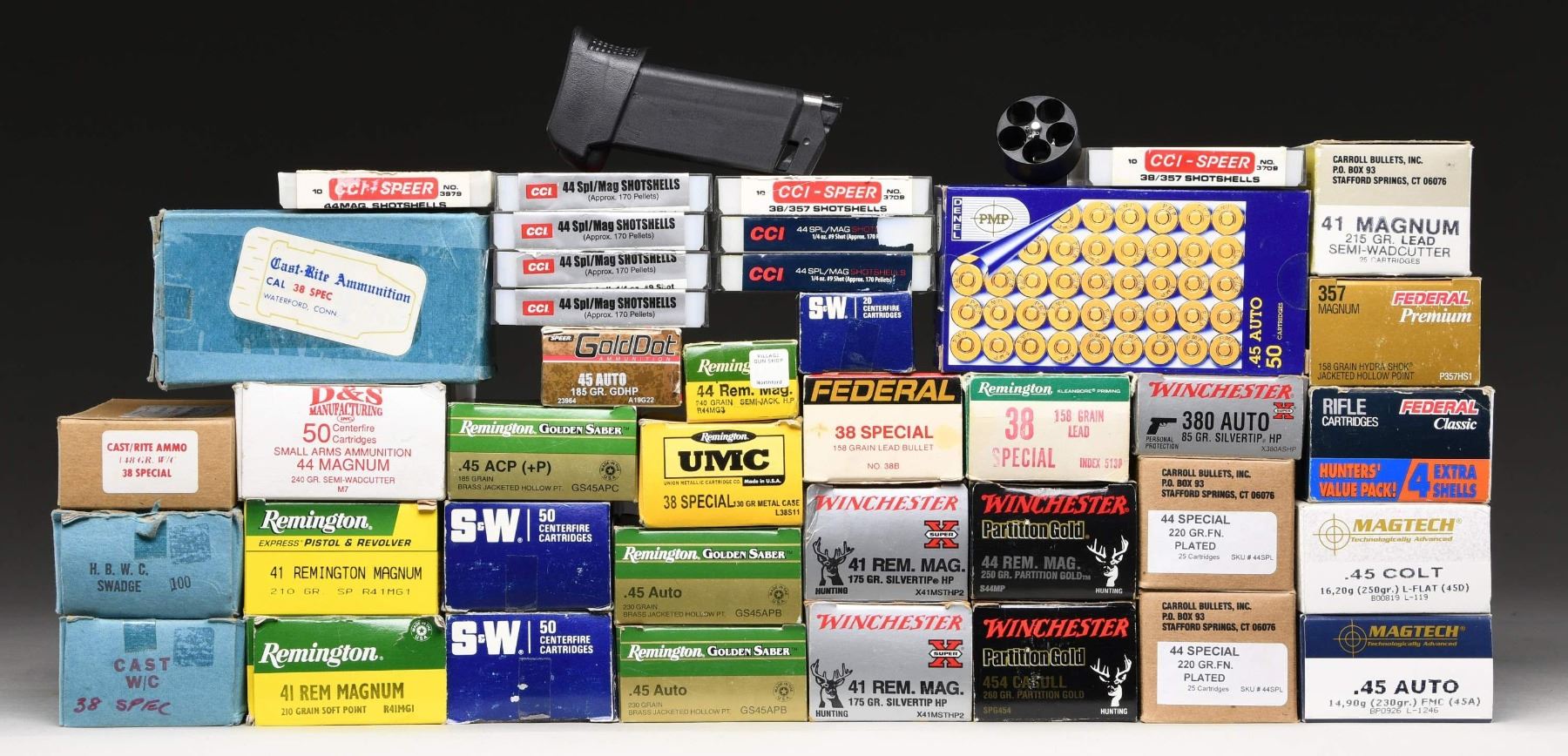 PISTOL CALIBERS. Lot contains hollow points. Pistol Ammunition Includes: (380 Auto.) No.1: WINCHESTER SUPER-X. One partial box of 50 rds., 38 remaining. (38 total) (38 Special.) No.1: CCI. Two boxes of 10 rds. Shot shells. Number 9 shot. (20 total) / No.2: UMC. One partial box of 50 rds., 45 remaining. 130 grain metal case. (45 total) / No.3: FEDERAL. One partial box of 50 rds., 44 remaining. 158 grain lead. (44 total) / No.4: REMINGTON. One partial box of 50 rds., 15 remaining. 158 grain lead. (15 total) / No.5: CAST-RITE remanufactured ammunition. One partial box of 100 rds. packed loosely & mostly full. HBWC swage. / No.6: CAST-RITE. Two boxes of 100 rds. packed loosely. Load is cast W/C. (200 total) / No.7: CAST-RITE. One partial box of 50 rds., 15 remaining. 148 grain W/C. (15 total) (357 Magnum.) No.1: FEDERAL. One box of 20 rds. Premium. 158 grain HYDRA-SHOK. Jacketed hollow point. (20 total) / No.2: SMITH & WESSON. Two boxes of 50 rds. 158 grain jacketed hollow point. (100 total) (41 Magnum.) No.1: REMINGTON. Two boxes of 50 rds. 210 grain soft point. (100 total) / No.2: WINCHESTER. Two boxes of 20 rds., one partial with 15 remaining. 175 grain silver tip HP. (35 total) / No.3: CARROLL BULLETS INC. One box of 25 rds. 215 grain lead semi wadcutter. (25 total) (44 Special.) No.1: CARROLL BULLETS INC. Two boxes of 25 rds. 220 grain flat nose plated. (50 total) (44 Magnum.) No.1: WINCHESTER. One box of 20 rds. 250 grain partition gold. (20 total) / No.2: REMINGTON. One box of 20 rds. 240 grain semi-jacketed hollow point. (20 total) / No.3: CAST-RITE ammunition. One partial box of 50 rds., 7 remaining. 230 grain semi wadcutter. (7 total) / No.4: MAGTECH. One box of 50 rds. Cowboy action loads. 250 grain lead flat point. (50 total) / No.5: D&S MANUFACTURING. One box of 50 rds. 240 grain semi wadcutter. (50 total) / No.6: SMITH & WESSON. One box of 20 rds. 240 grain jacketed hollow point. (20 total) / No.7: CCI. Seven boxes of 10 rds. Shot shells. Number 9 shot. (70 total) (45 Auto.) No.1: DENEL PMP SOUTH AFRICA. One box of 50 rds. 220 grain full metal jacket. (50 total) / No.2: MAGTECH. One box of 50 rds. 230 grain full metal case. (50 total) / No.3: REMINGTON. Two boxes of 25 rds. Golden saber high performance jacket. 230 grain jacketed hollow point. (50 total) / No.4: REMINGTON. One box of 25 rds. Golden saber. Plus P. 185 grain brass jacketed hollow point. (25 total) / No.5: SPEER. One box of 20 rds. Gold dot. 185 grain GDHP. (20 total) (454 CASULL.) No.1: WINCHESTER. One box of 20 rds. Partition gold. 260 grain. (20 total) Rifle Ammunition Includes: (308 Win.) No.1: FEDERAL. One partial box of 20 rds., 11 remaining. 180 grain high shock soft point. (11 total) Lot also contains Glock Instruction Manual Model 30 45 ACP Pierce grip 6 rd. magazine & HKS 36 5 rd. speed-loader. CONDITION: ammunition appears generally bright, clean & serviceable. Boxes will have handling wear, small tears & scuffing. Total round count is approx. 1,170. (02-24605-4/RW). AMMO. $200-400.