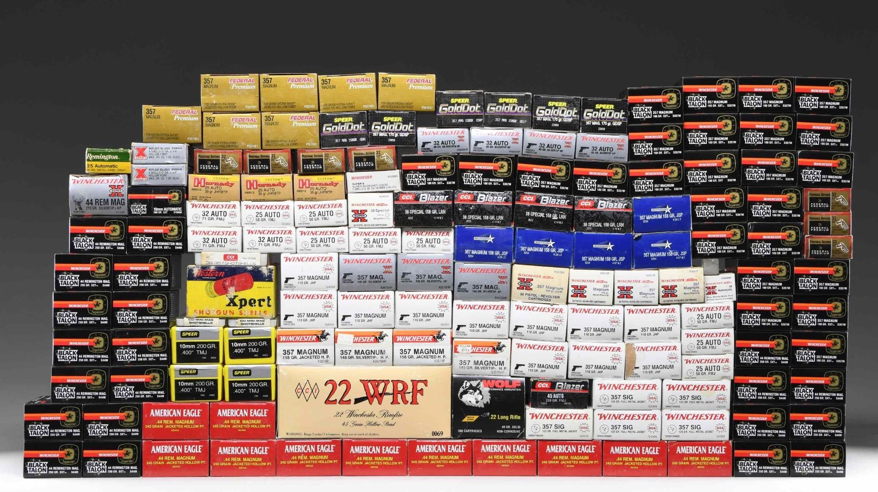 Lot contains hollow points, metal piercing & black talon ammunition. CALIBER 45 ACP: CCI BLAZER. One box of 50 rds., 28 remaining. / WINCHESTER. One box of 20 rds. 185 grain silver tip hollow point. / CALIBER 44 REM MAG: WINCHESTER SUPREME BLACK TALON. 21 boxes of 20 rds. 250 grain SXT Deep Penetrator. / WINCHESTER. One box of 20 rds. 210 grain silver tip hollow point. / FEDERAL AMERICAN EAGLE. 11 boxes of 50 rds. 240 grain jacketed hollow point. / CALIBER 357 MAGNUM: WINCHESTER BLACK TALON SUPREME DEEP PENETRATOR. 25 boxes of 20 rds. 180 grain SXT. / INDEPENDENCE. Five boxes of 50 rds. 158 grain jacketed soft point. / SPEER GOLD DOT. Three boxes of 20 rds. 170 grain GDSP. / SPEER GOLD DOT. Three boxes of 20 rds. 158 grain GDHP. / FEDERAL PREMIUM. Seven boxes of 20 rds. 158 grain hydrashok jacketed hollow point. / WINCHESTER. 11 boxes of 50 rds. 110 grain jacketed hollow point. / WINCHESTER. Two boxes of 50 rds. 158 grain jacketed hollow point. / WINCHESTER. Five boxes of 50 rds. 145 grain silver tip HP. / WINCHESTER. Two boxes of 50 rds. 158 grain metal piercing. / WINCHESTER. One box of 50 rds. 158 grain lead. / WINCHESTER. One box of 50 rds. 125 grain jacketed hollow point. / CALIBER 357 SIG: WINCHESTER. Five boxes of 50 rds. 125 grain full metal jacket. / CALIBER 10MM AUTO: WINCHESTER BLACK TALON DEEP PENETRATOR. One box of 20 rds. 200 grain SXT. / CALIBER 38 SPECIAL: CCI BLAZER. Four boxes of 50 rds. 158 grain lead round nose. / WINCHESTER. One box of 50 rds. 150 grain metal piercing +P. / CCI. Shotshells. One box of 10 rds. 1/4 ounce no.9 shot. / CALIBER 32 AUTO: FEDERAL PREMIUM. Seven boxes of 20 rds. 65 grain hydrashok JHP. / WINCHESTER. Four boxes of 50 rds. 60 grain silver tip hollow point. / WINCHESTER. Three boxes of 50 rds. 71 grain full metal jacket. / CALIBER 25 AUTO: WINCHESTER. Eight boxes of 50 rds. 50 grain full metal jacket. / HORNADY CUSTOM. Three boxes of 25 rds. 35 grain JHP XTP. / REMINGTON. One box of 50 rds., 18 remaining. 50 grain metal cased. / CALIBER 22 WRF: CCI. One brick of 10 plastic 50 rd. boxes. 45 grain hollow point. / CALIBER 22 LONG RIFLE: WOLF MATCH EXTRA. One brick of 500 rds. 40 grain solid bullets. / CCI MINIMAG. Shotshells. Two boxes of 20 rds. / CALIBER 12 GAUGE. Shotshells. WESTERN XPERT. One box of 25 rds., 20 remaining. 2 3/4" #6 shot. / WINCHESTER SUPER X. Two boxes of five one ounce rifled slugs. Hollow point. / WINCHESTER SUPER X. One box of five 2 3/4" double 00 buck. / CALIBER 10MM: SPEER. Four boxes of 100 hand-loading bullets. 200 grain TMJ. CONDITION: boxes may have handling wear, scuffing & small tears. Ammunition appears generally cleaned & serviceable. (02-24270-28/RW). AMMO. $700-900.