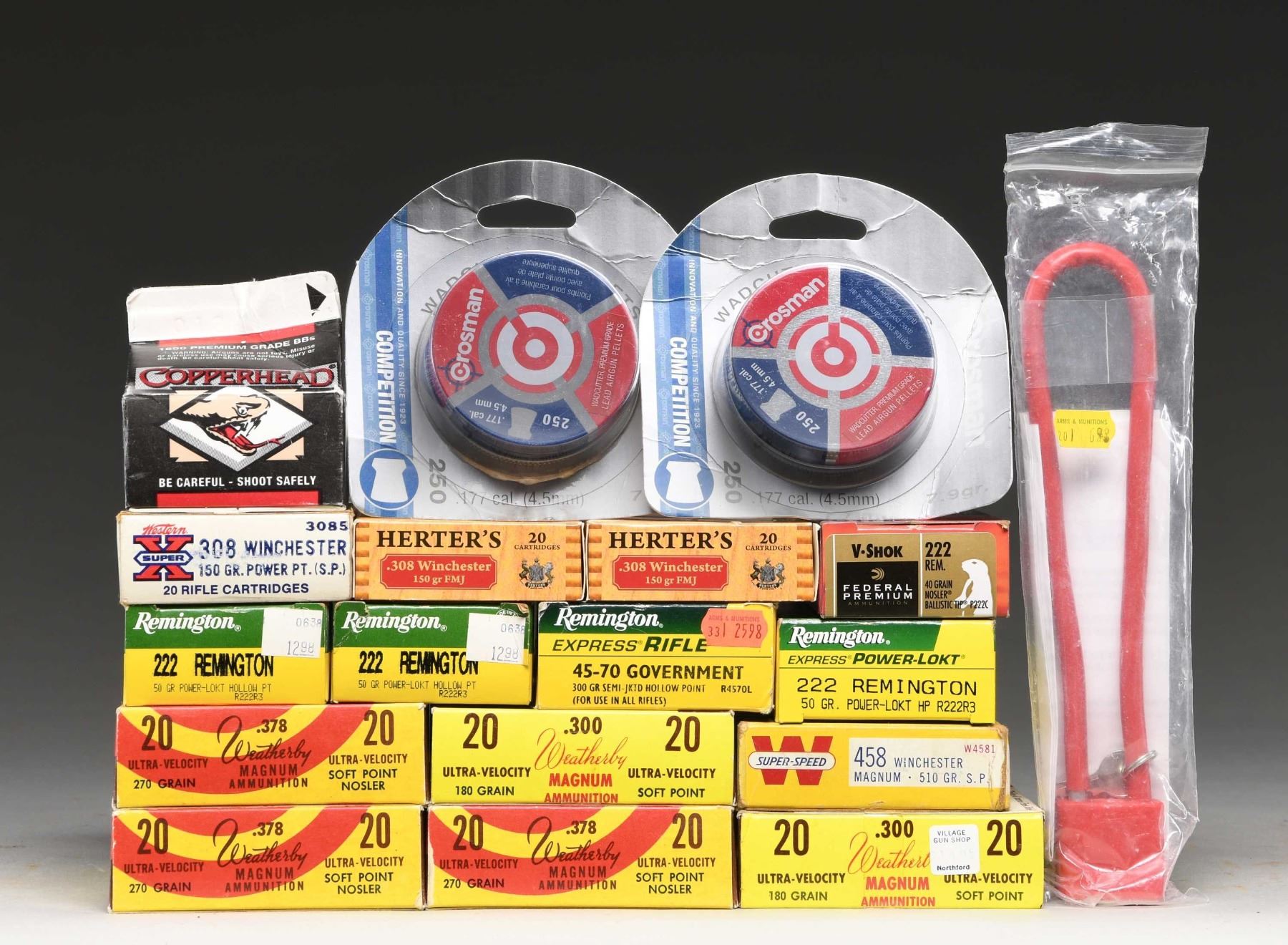 SHOT. Lot contains hollow points. (222 Rem.) No.1: REMINGTON. Three boxes of 20 rds. 50 grain Power Lokt hollow point. (60 total) / No.2: FEDERAL PREMIUM. One box of 20 rds. 40 grain Nosler ballistic tip. (20 total) (308 Win.) No.1: HERTERS. Two boxes of 20 rds. Steel case. 150 grain full metal jacket. (40 total) / No.2: WESTERN SUPER-X. One box of 20 rds. 150 grain power point SP. (20 total) (300 Weatherby Mag.) No.1: WEATHERBY. Two boxes of 20 rds. 180 grain soft point. (40 total) (378 Weatherby.) No.1: WEATHERBY. Three boxes of 20 rds. 270 grain Nosler soft point. (60 total) (458 Win.) No.1: WINCHESTER SUPER SPEED. One partial box of 20 rds., 14 remaining. 510 grain soft point. (14 total) (45-70 Govt.) No.1: REMINGTON. One box of 20 rds. 300 grain semi-jacketed hollow point. (20 total) (.177 Air Gun Pellets.) No.1: CROSMAN. Two tins of 50 rds. 7.9 grain wadcutter. (100 total) / No.2: COPPERHEAD STEEL BBS. One partial box of 1,500 rds. Also included is one trigger lock in factory packaging. (02-24605-3/RW). AMMO. $300-500.