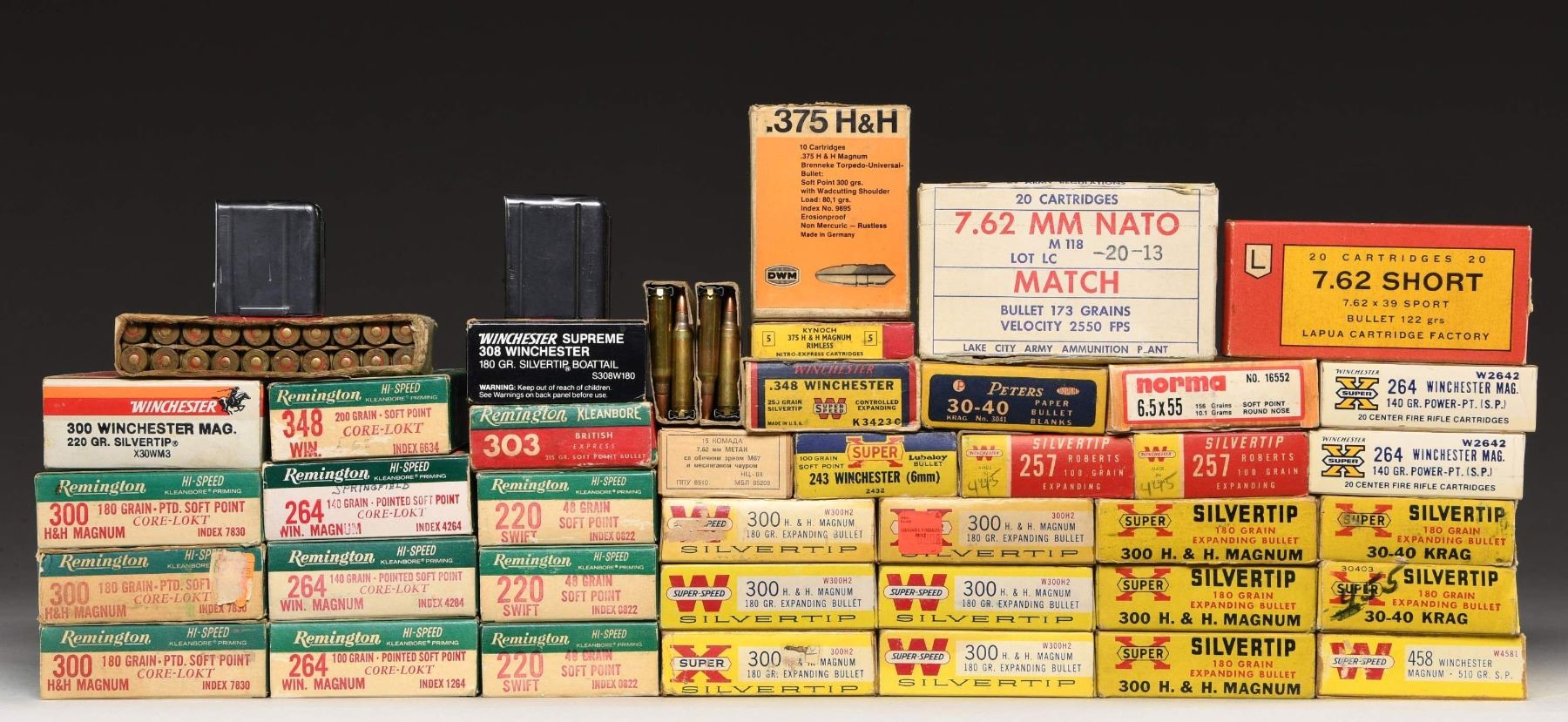 Lot may contain hollow points. Sporting Ammunition Includes: (220 Swift.) No.1: REMINGTON. Three boxes of 20 rds. 48 grain soft point. (60 total) (243 Win.) No.1: WESTERN SUPER-X. One partial box of 20 rds., 14 remaining. 100 grain soft point. (14 total) (257 Roberts.) No.1 WINCHESTER SILVERTIP. Two boxes of 20 rds., one partial w/ 19 remaining. 100 grain silvertip. (39 total) (6.5x55 Swede.) No.1: NORMA. One partial box of 20 rds., 17 remaining. 156 grain soft point. (17 total) (264 Win Mag.) No.1: REMINGTON. One box of 20 rds. 100 grain soft point. (20 total) / No.2: REMINGTON. Two boxes of 20 rds., one partial w/ 10 remaining. 140 grain soft point. (30 total) / No.3: WINCHESTER SUPER-X. Two boxes of 20 rds. 140 grain power point. (40 total) (30-40 Krag.) No.1: WESTERN SUPER-X SILVERTIP. Two boxes of 20 rds. 180 grain silvertip. (40 total) / No.2: PETERS RUSTLESS PAPER BULLET BLANKS. One box of 20 rds. (20 total) (300 H&H Mag.) No.1: WINCHESTER SUPER-X. Six boxes of 20 rds. 180 grain silvertip. (120 total) / No.2: WESTERN SUPER-X. Two boxes of 20 rds., one partial w/ 16 remaining. 180 grain silvertip. (36 total) / No.3: REMINGTON. Three boxes of 20 rds. 180 grain Core-Lokt soft point. (60 total) (300 Win Mag.) No.1: WINCHESTER SUPER-X. One box of 20 rds. 220 grain silvertip. (20 total) (308 Win.) No.1: WINCHESTER SUPREME. One box of 20 rds. 180 grain silvertip boat tail. (20 total) (303 British.) No.1: REMINGTON. One partial box of 20 rds., 17 remaining. 215 grain soft point. (17 total) (348 Win.) No.1: WINCHESTER. One box of 20 rds. 250 grain silvertip. (20 total) / No.2: REMINGTON. One partial box of 20 rds., 11 remaining. 200 grain soft point. (11 total) (375 H&H Mag.) No.1: KYNOCH. One box of 5 rds. 300 grain soft nose. (5 total) / No.2: DWM. One box of 10 rds. 300 grain Brenneke torpedo-universal. (10 total) (458 Win.) No.1: WINCHESTER. One box of 20 rds. 510 grain soft point. (20 total) Military Ammunition Includes: (5.56x45.) No.1: LAKE CITY LC76. Four 10 rd. stripper clips in cardboard sleeves. 55 grain ball. (40 total) (7.62x39.) No.1: METAK. One sealed box of 15 rds. Military ball. (15 total) / No.2: LAPUA. One box of 20 rds. labeled "7.62 Short". 122 grain full metal jacketed bullets. (20 total) (7.62mm NATO / M118.) No.1: LAKE CITY. One box of 20 rds. 173 grain FMJ match. (20 total) (30-06.) No.1: DENVER ORDNANCE PLANT. One box of 20 rds. M2 150 ball. (20 total) Also included are two 5 rd. detachable M1 Carbine magazines. Total rd. count is: 729. CONDITION: ammunition appears clean & serviceable. Boxes are in generally good condition, but may have wear & staining due to age & handling. Several boxes have missing flaps. Magazines appear serviceable. (02-24465-3/RW). AMMO. $300-500.