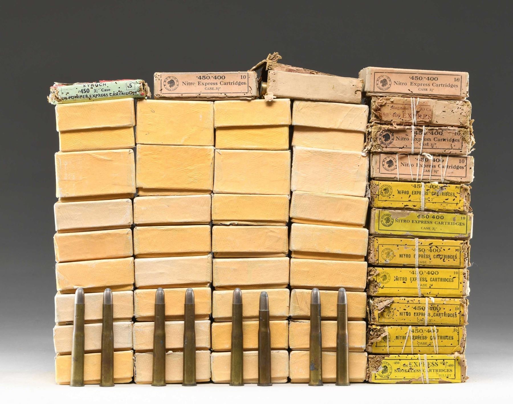 Approx. 340 rds are in original factory boxes & approx. 140 rds are packed loosely. Lot may contain hollow-points. Bullets are predominantly soft-point, but include solids & paper-patched lead. Manufacturer is predominantly Kynoch, but includes some Eley. Case lengths are mostly 3 1/4", however, some of the cartridges are 3". Lot also contains 18+ rds of Eley 450 black powder 3 1/4" case loaded w/ paper-patched, copper tube, lead bullets. CONDITION: ammunition may have oxidation & spots of verdigris, but appears mostly serviceable. Factory boxes have extensive insect damage w/ staining, wear, missing flaps & etc. Loose ammunition is packed in two-piece cardboard boxes. PROVENANCE: from the renowned collection of quality sporting arms from Lewis Drake together with inventory of Lewis Drake Associates. (02-23571-23/RW). AMMO. $600-900.