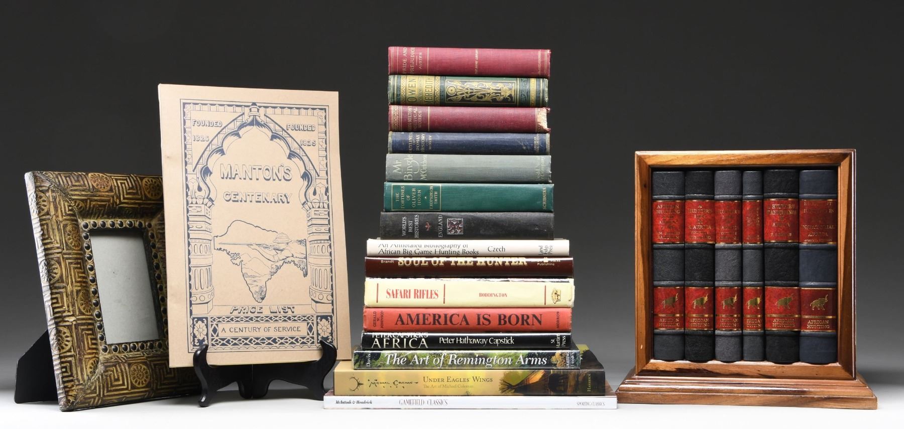 HUNTING HISTORY & ETC. Notable titles include: "An Annotated Bibliography of African Big Game Hunting Books, 1785 to 1950" by Czech. Signed copy, / "Soul of the Hunter" by CPT. John Brandt. Signed copy, / 5 reprinted volumes on African Hunting in a wooden display case. Authors are Baldwin, Cumming, Selous, Neumann & Finaughty, / "Safari Rifles" by Boddington, / "Peter Capstick's Africa" by Capstick, / "The Art of Remington Arms" by Davis, / "Under Eagle's Wings" by Hassrick & / "Manton's Centenary" by Manton & Co. CONDITION: condition ranges from fair to very good, the older volumes may have more wear & some scattered insect damage. The newer additions have modest handling wear & small tears in dust jackets. PROVENANCE: from the renowned collection of quality sporting arms from Lewis Drake together with inventory of Lewis Drake Associates. (02-23570-3/RW). NON-GUN. $300-500.