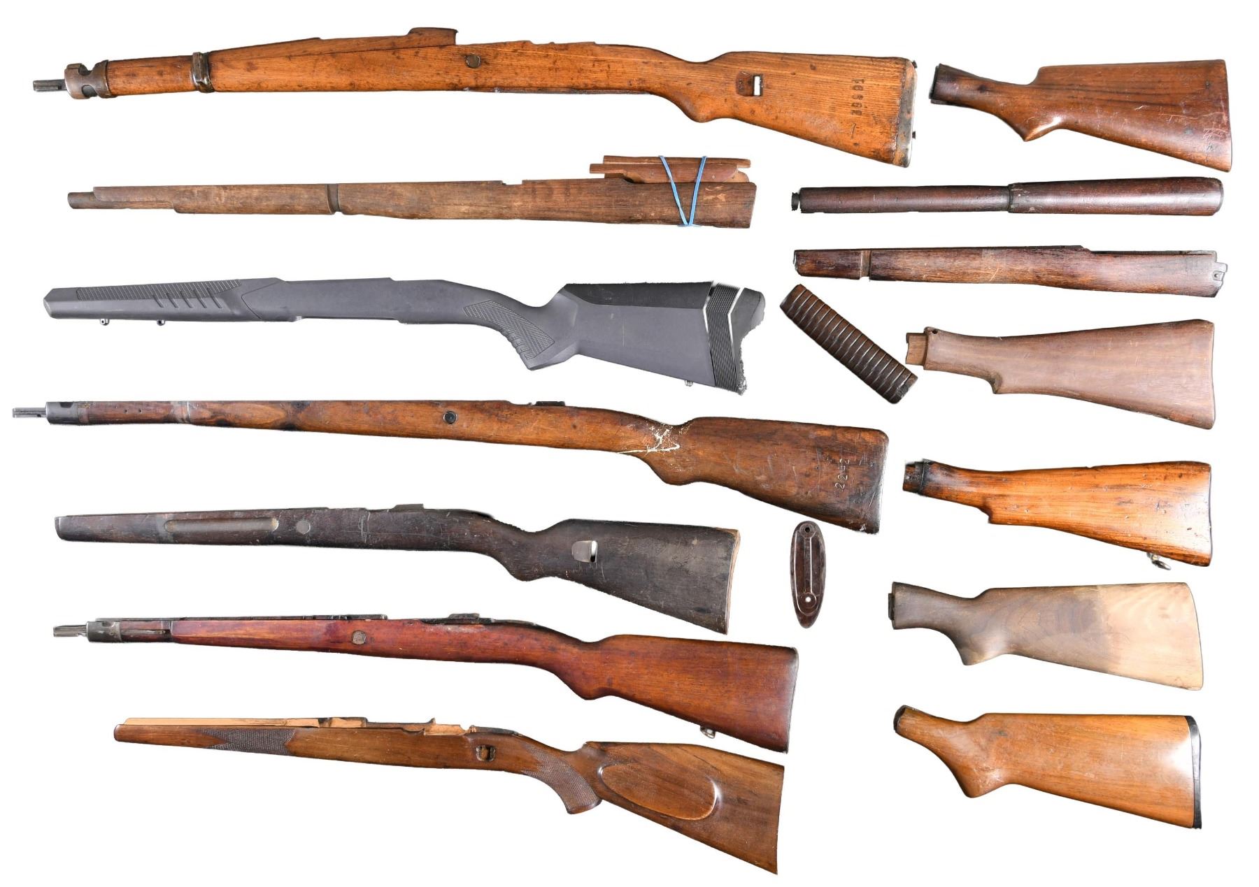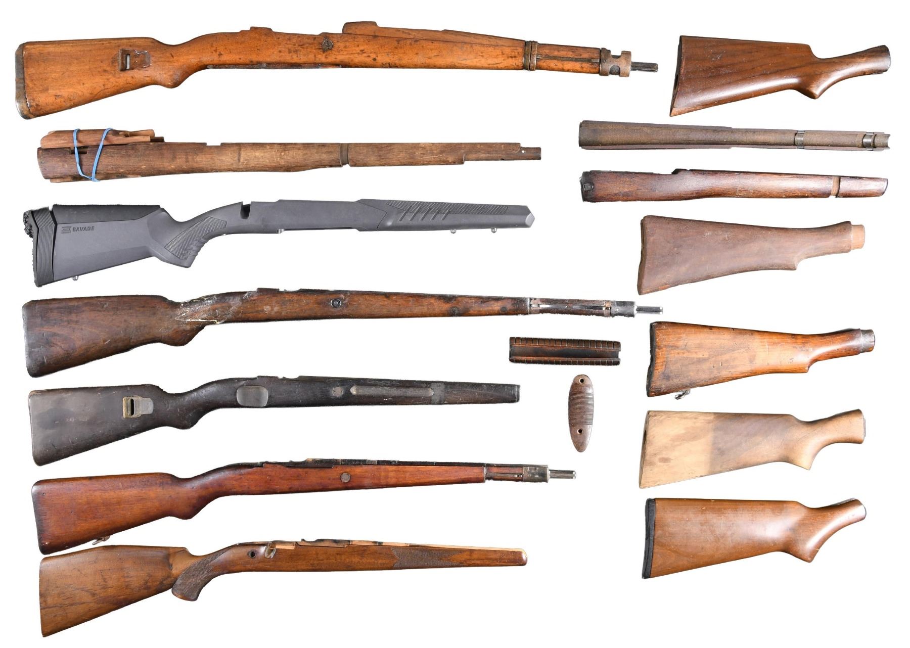 HANDGUARDS. No.1: Lee Enfield No. III replacement buttstock, forend & two rear handguards. Wood shows little finish, forend appears to have been installed on rifle. Handguard clips are present. Buttstock has arsenal dovetail repair between toe & swivel mortice. CONDITION: wood shows staining & moderate handling marks. No.2: Buttstock & shortened forend for No. IV Lee Enfield. Butt swivel is present. Forend has been shortened approx. 3" ahead of lower band. CONDITION: wood shows refinish w/ visible handling & sanding marks. No.3: Colombian Model 1912 Carbine Stock. Walnut buttstock is unmarked & includes buttplate, butt swivel, band springs & tip w/ bayonet bar. Stock has worn original finish w/ scattered handling marks. Small missing chip at rear of trigger guard tang. No.4: Yugoslav Model 1948 Mauser Complete Stock Set. Hardwood stock complete w/ buttplate. Upper & lower bands & bayonet bar w/ band spring. CONDITION: stock has added finish w/ wear over numerous handling marks. Bored soldier markings at bottom of forend. No.5: Mauser Short Rifle Stock. Likely South American contract. Walnut stock has band springs & bayonet bar. CONDITION: stock has major unfinished repair at grip. No.6: Mauser 98 Sporting Rifle Stock. Features include European comb, raised cheekpiece, checkered pistol grip & forend. Morticed for Greener safety. CONDITION: stock has wear, flattening of diamonds & inletting shows hobbyist gunsmith modification. No.7: Mauser Model 98A Buttstock. Features include Imperial markings. Walnut stock w/ buttplate has been duffle-cut underneath lower band. CONDITION: stock set has well-worn original finish w/ staining & handling marks. Buttplate shows oxidation. No.8: Buttstock from H&R Topper. Features include buttplate & stock bolt. CONDITION: stock has worn original finish w/ notable crack in grip of area. No.9: Buttstock for High Standard Pump Shotgun. CONDITION: walnut buttstock appears unfinished w/ staining, handling marks & missing chip at toe. No.10: Winchester Model 97. Shotgun Buttstock and grooved forend. Early style stock. CONDITION: stock has been shortened & repaired at toe & grip. No.11: Savage Model 111 Black Synthetic Stock. CONDITION: stock is in good condition, except buttpad has rodent damage. No.12: US Model 1903A3 Walnut Handguard w/ Clips. CONDITION: handguard has wear, chipping & staining. (02-24330-3/RW). NON-GUN. $100-200.
