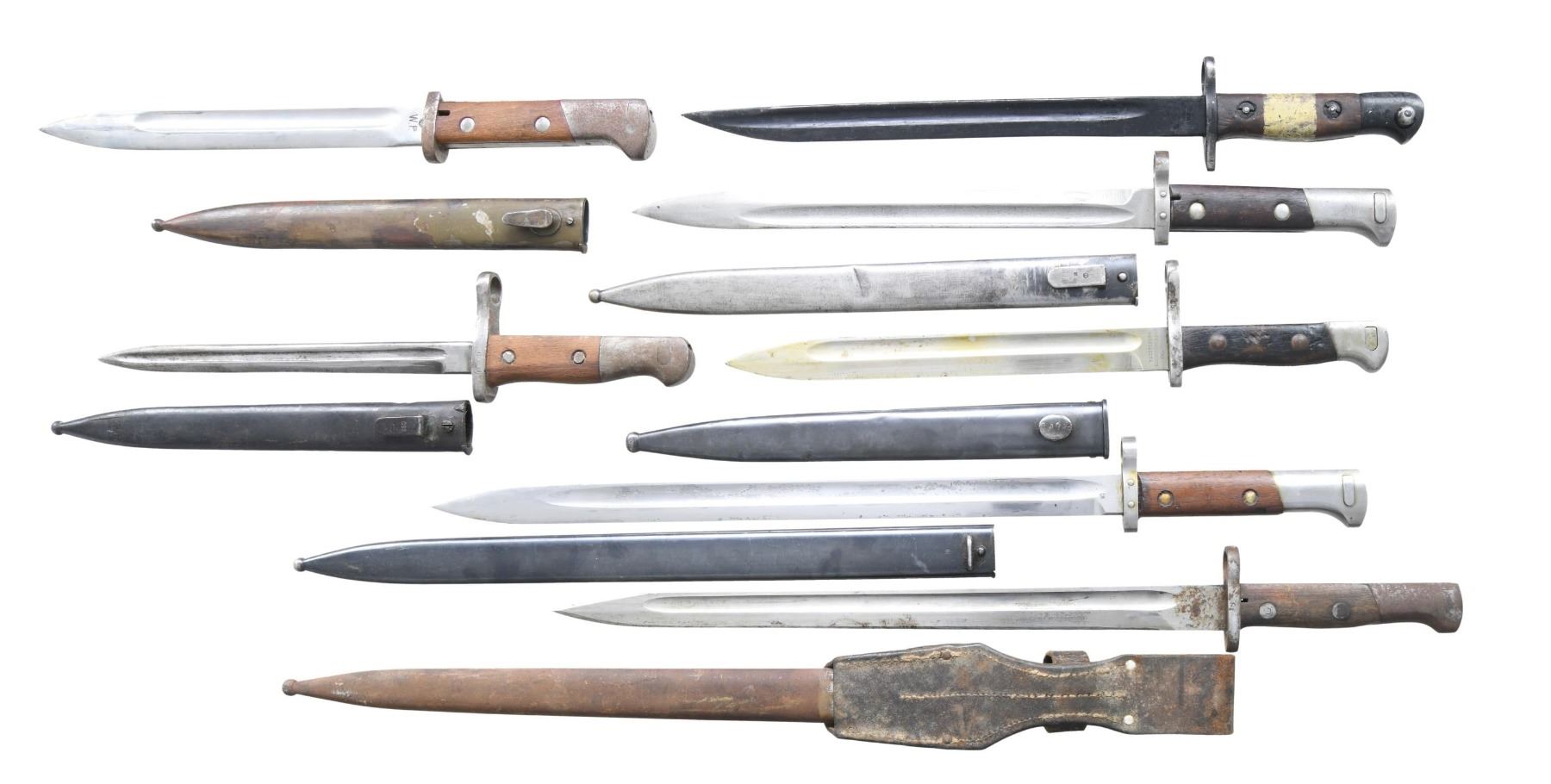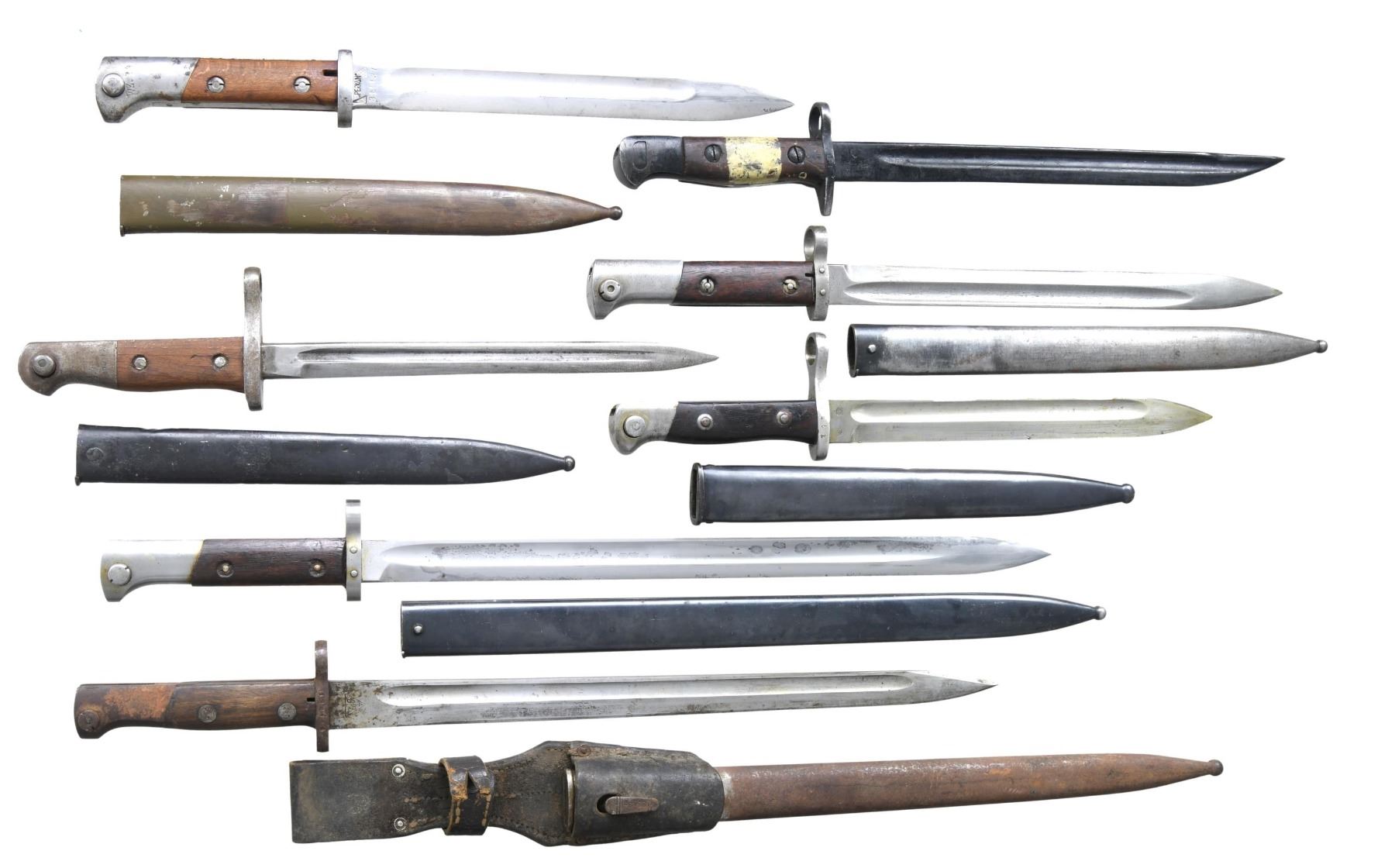 CENTURY. No.1: VZ24 Polish Bayonet. 9 3/4" bright fullered blade. Blade is marked on the left ricasso w/ the "Polish eagle" & "W.P.". Marked on right ricasso "PERKUN" for the Perkun Arsenal, two triangular acceptance marks & serial number. Right side of pommel has "WZ.24". Balance of metal is bright. Flash guard is present. Smooth walnut grips retained by two screws. Steel scabbard w/ "OD" green painted finish. CONDITION: metal has moderate wear, turning gray & patina. Grips in good lightly worn condition. Scabbard has considerable loss of its green paint w/ the metal turning patina. No.2: South American Contract Bayonet for Model 93/95 Mauser Rifle. 9 7/8" bright fullered blade. 14 3/8" overall. Blade is marked on the left ricasso "WEYERSBERG / KIRSCHBAUM & CO / SOLINGEN". Right ricasso has two acceptance marks consisting of a "star in shield" & "3 interlocking circles". Smooth walnut grips retained by two rivets. Serial number on crossguard matches steel scabbard. CONDITION: unsharpened blade is turning gray w/ moderate wear. Balance of metal shows oxidation, wear & handling marks. Grips have notable wear & handling marks. Scabbard has small dents & pits, but has been refinished w/ cold blue. No.3: Persian Bayonet. 15 5/8" bright fullered blade. 21" overall. Bayonet is marked only w/ "crown" & Farsi numerals at end of pommel. Bayonet equipped w/ muzzle ring. Smooth walnut grips secured by rivets. Blued steel scabbard. CONDITION: bayonet & scabbard in very good condition w/ very light wear & scattered spots of discoloration on the bright blade. No.4: Czech VZ24 Short Bayonet. 11 3/4" bright fullered blade w/ inverted cutting edge. 17" overall. Right ricasso is marked w/ "CFZ / R". Smooth walnut grips retained by two screws. End of pommel has "GR" & "serial number". CONDITION: bayonet has been heavily sharpened w/ grind marks & small nicks. Metal is turning gray. Grips have moderate wear & handling marks. Scabbard is well-worn w/ a large dent turning overall gray. No.5: Middle Eastern Bayonet. 9 5/8" bright fullered blade. 14 1/8" overall. Blade appears to be from British Model 1907 Type Bayonet. Fuller extends through the point, indicating blade has been shortened. Crossguard appears to be for small ring Mauser type rifles. Smooth hardwood grips retained by two hand-peened rivets. Blued steel scabbard has been arsenal modified, but the "CFZ" marking indicates original Czech manufacture. CONDITION: bayonet has heavy wear, scattered spots of oxidation & fine pitting. Blade has been sharpened. Scabbard has arsenal rework type blue. No.6: British Model 1907 Bayonet. 11 3/4" fullered blade. Fuller extends through point. 16 1/2" overall. Blade markings except date rendered obscure by the arsenal rework. Crossguard is marked "DP". Smooth walnut grips retained by two screws. Grips have white painted band. Scabbard is not present. CONDITION: bayonet has been lightly sharpened & has a worn arsenal rework type finish. Grips have wear & handling marks throughout. White paint is worn & flaking. No.7: Yugoslavian Model 1924 Bayonet. 15 1/8" bright fullered blade. 20 1/4" overall. Blade marked on the right ricasso w/ "triangled BT3". Crossguard carries serial number. Steel scabbard w/ German type black leather frog. CONDITION: blade has been heavily sharpened & shows oxidation & wear. Balance of metal turning patina w/ wear. Grips have worn stained appearance. Scabbard has moderate oxidation throughout. Leather frog has scuffing, staining & wear. Part of retaining strap is not present. (02-24120/RW). NON-GUN. $300-500.